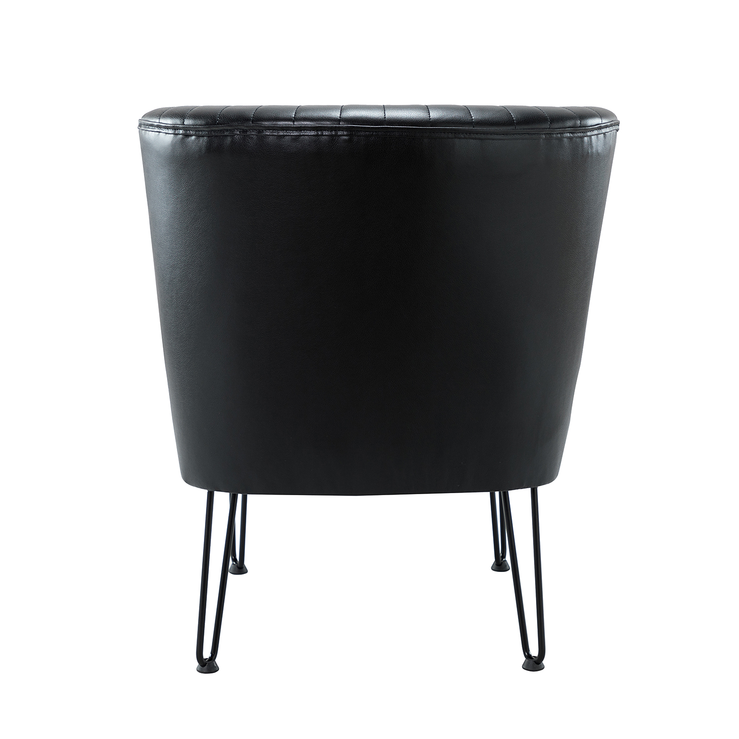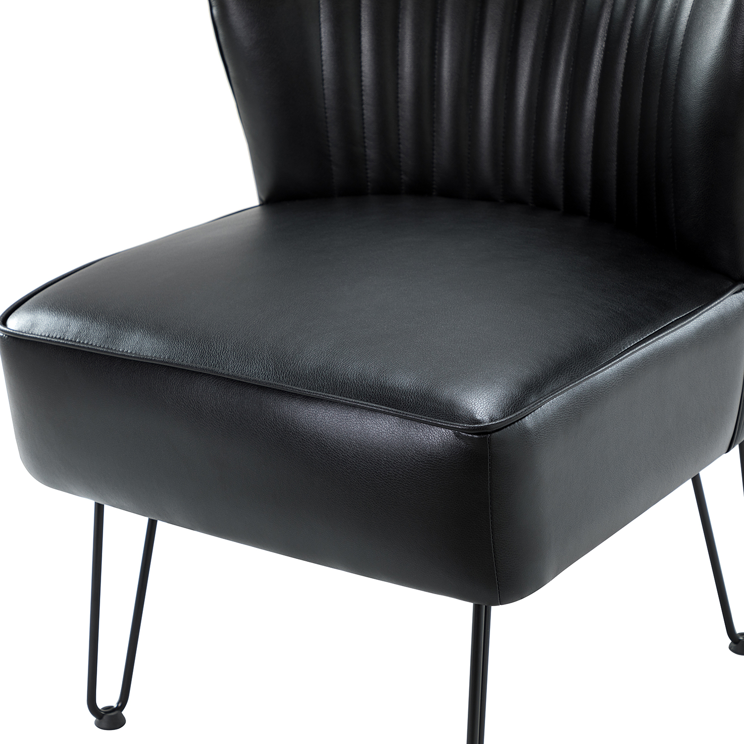 This Eustacio Black Faux Leather Tufted Armless Accent Chair is the perfect addition to your living room or bedroom! Its classic and contemporary style brings an eye-catching touch, blending seamlessly with your existing décor. Sink into the comfort of the premium faux leather fabric and enjoy the support of the high-density foam filling and sturdy wood frame. The U-shaped polished black metal legs add a modern flair to this timeless piece. With its armless design, you’ll have plenty of elbow room to relax and unwind. It’s the ideal choice for living rooms, offices, and bedrooms.