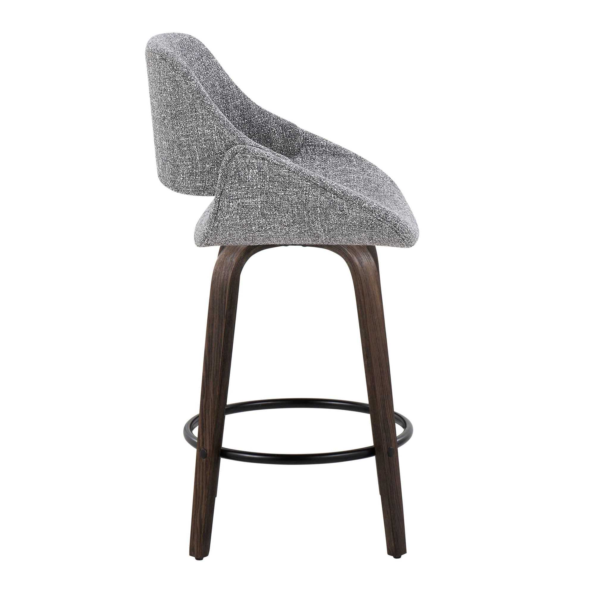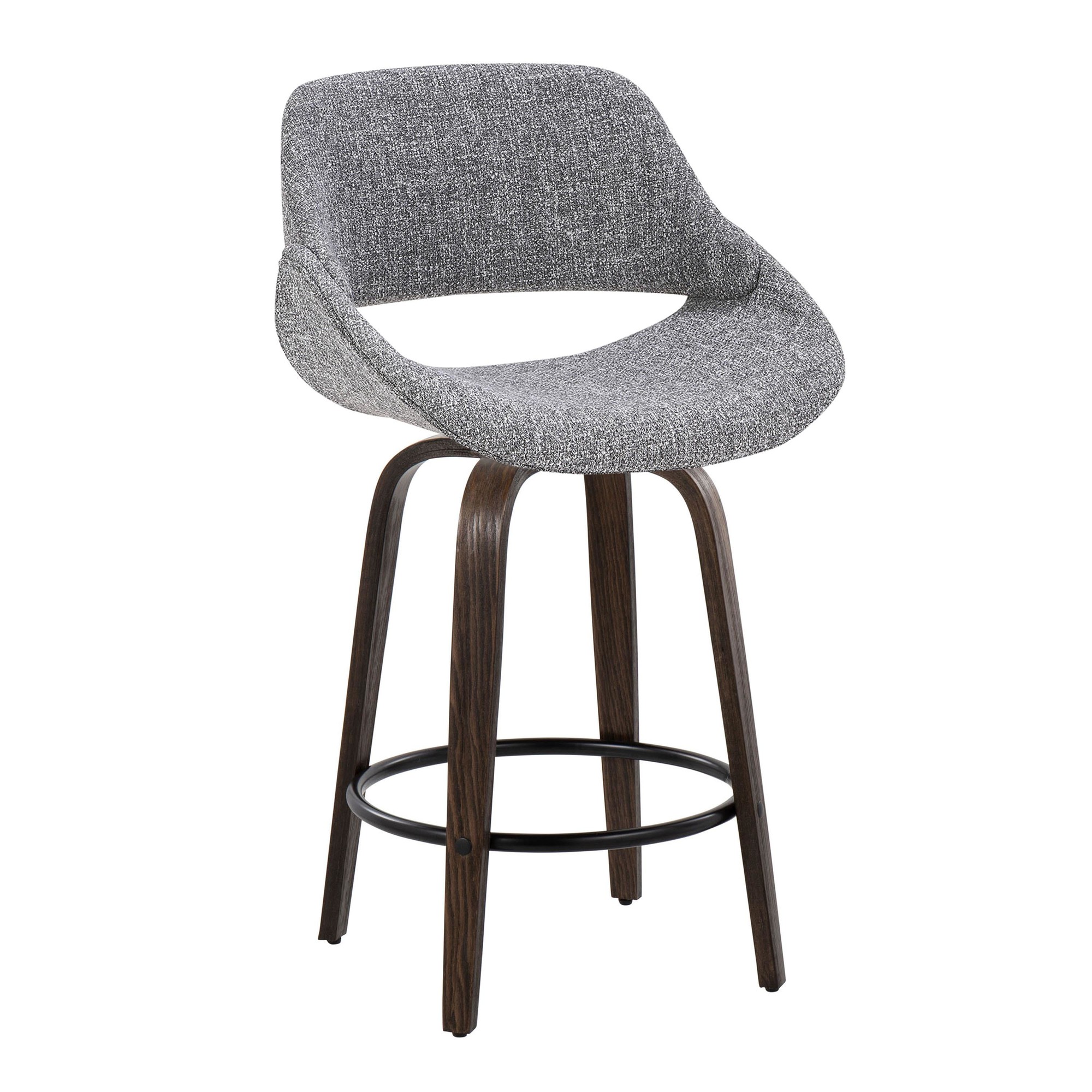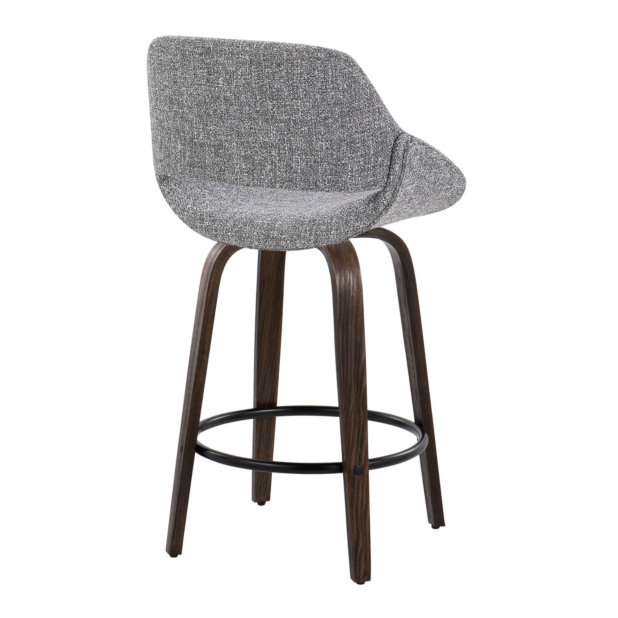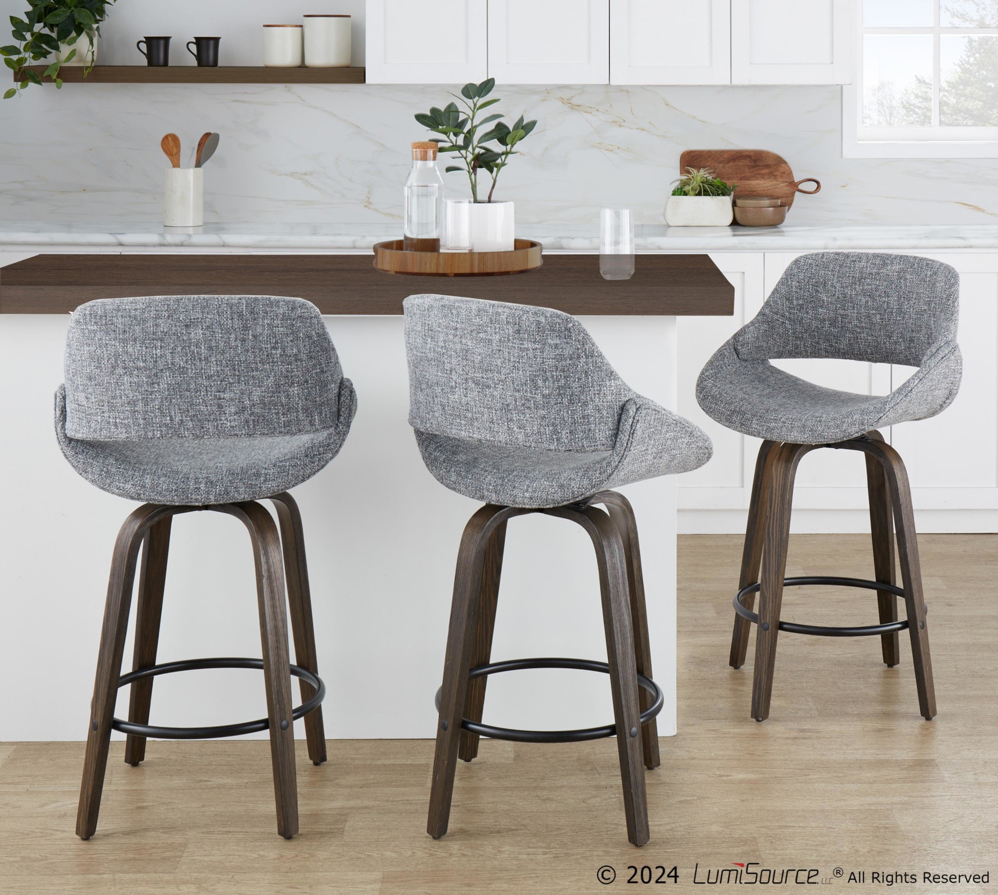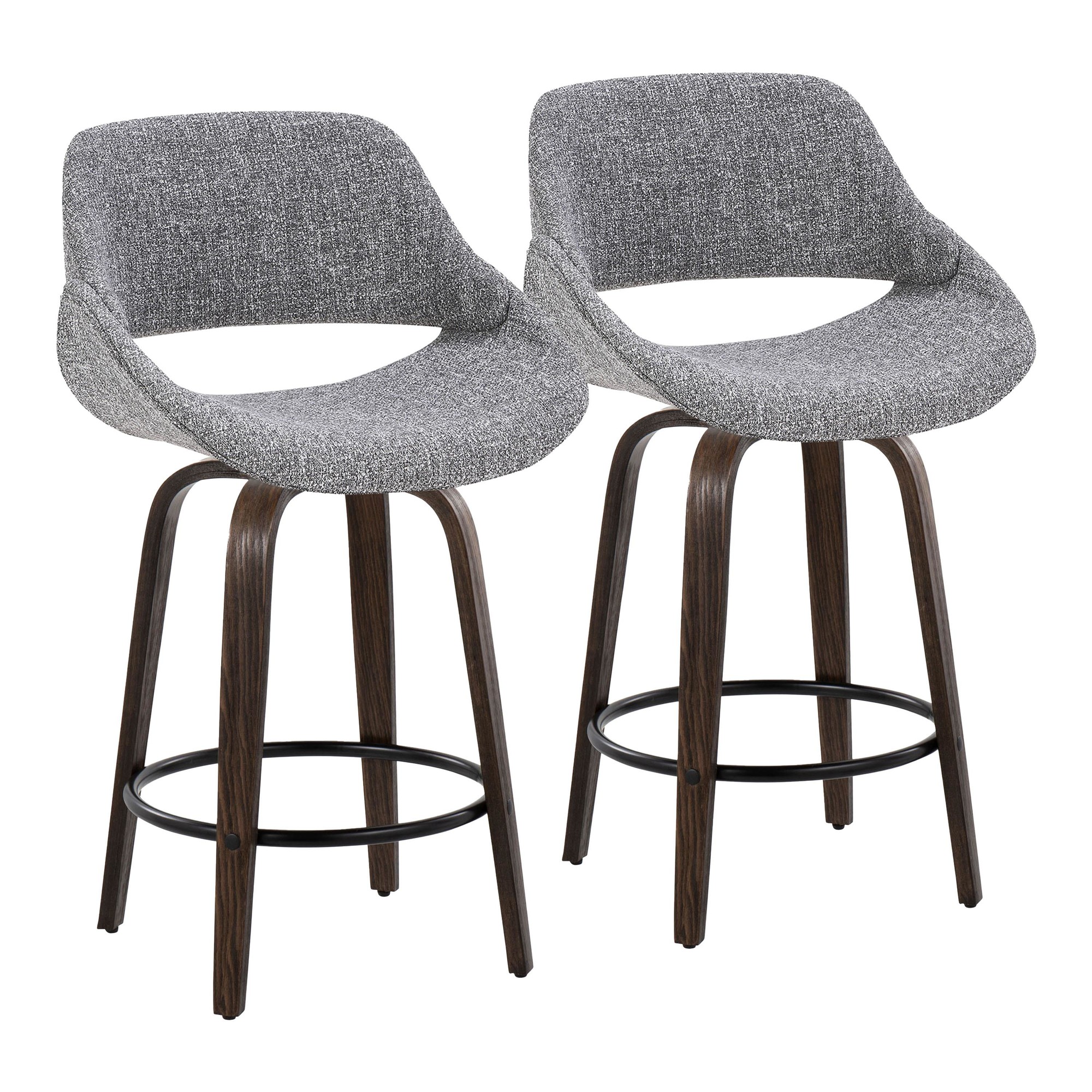The Fabrico 26-Inch Mid-Century Modern Grey Swivel Counter Stools invite you to sit back and relax. These counter stools feature a wide, welcoming seat, a curved back, and a comfortable upholstered seat, creating the perfect spot to unwind. The flared wood swivel legs add to the stylish design, while the round black metal footrest provides extra comfort.