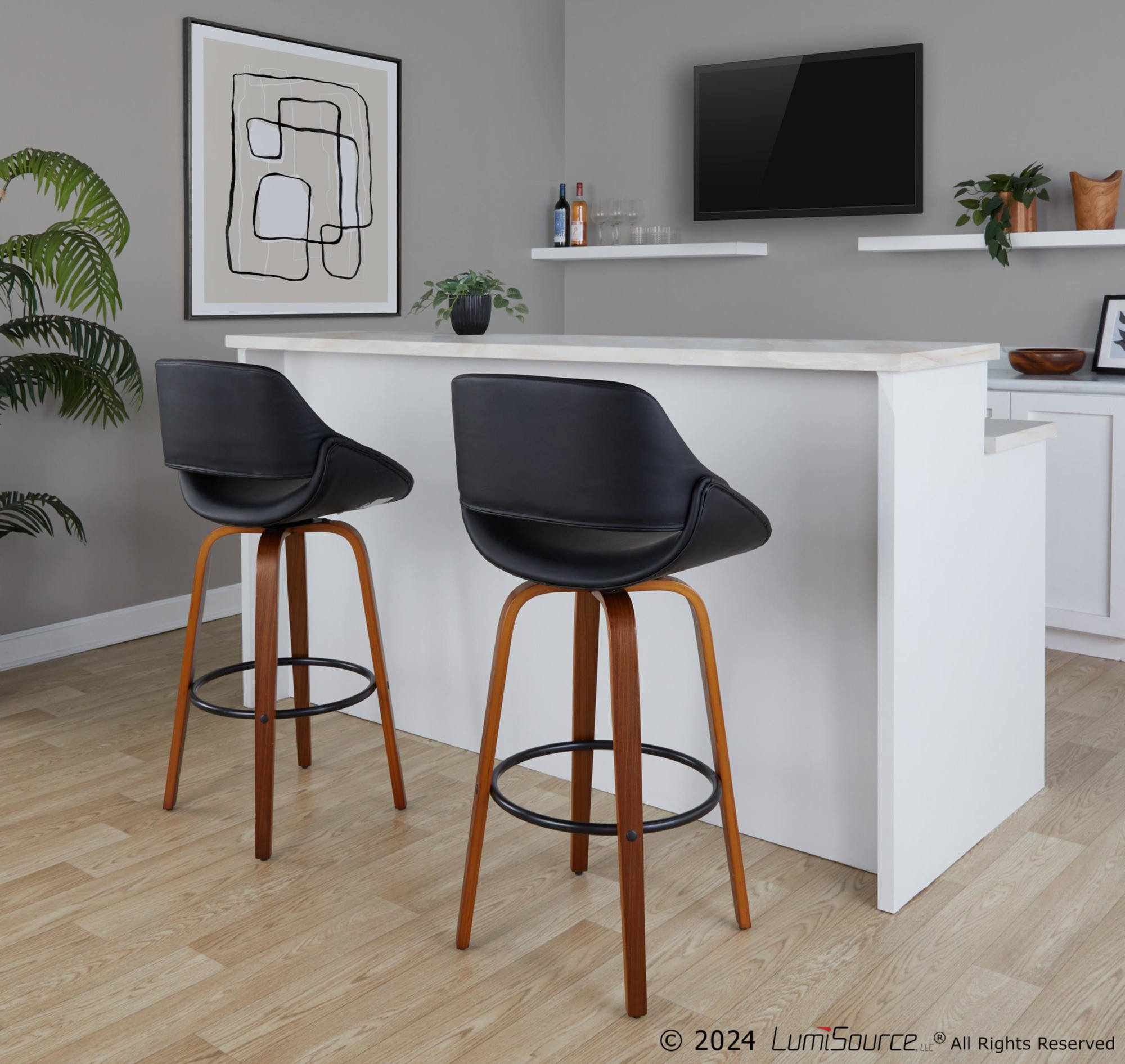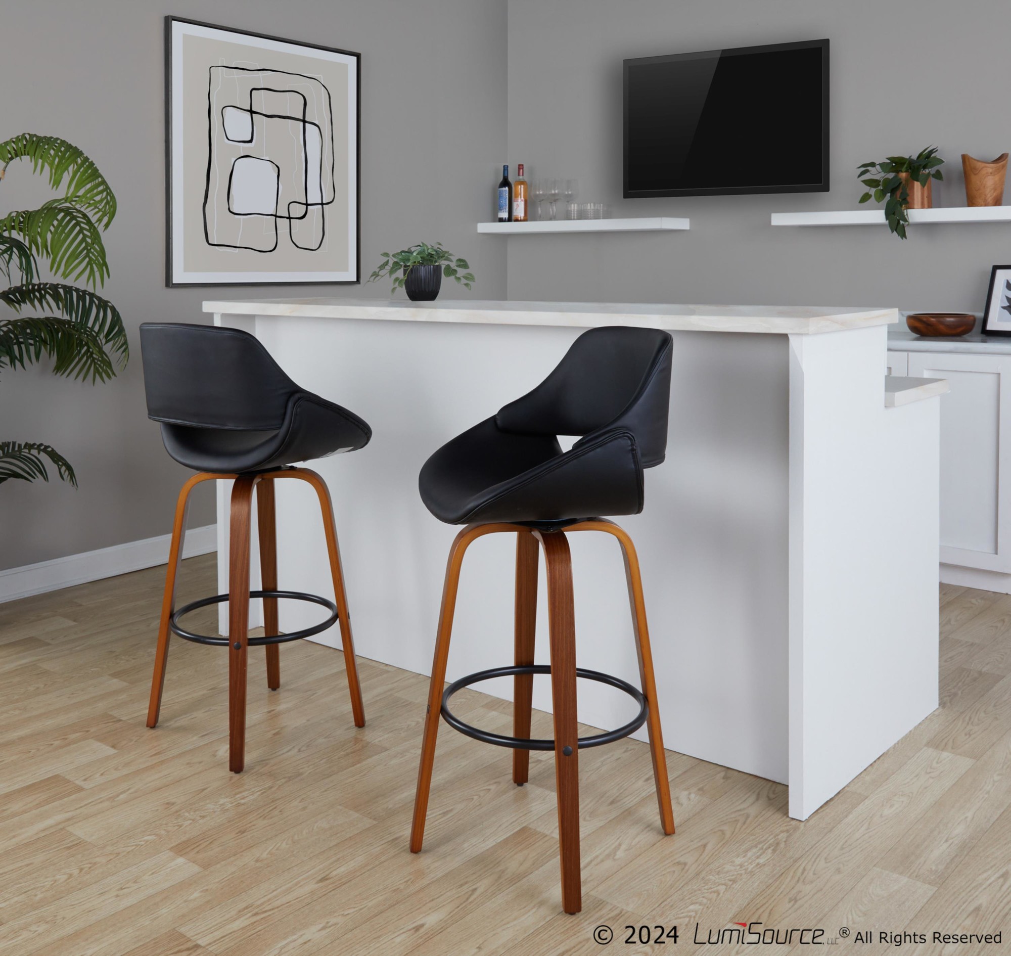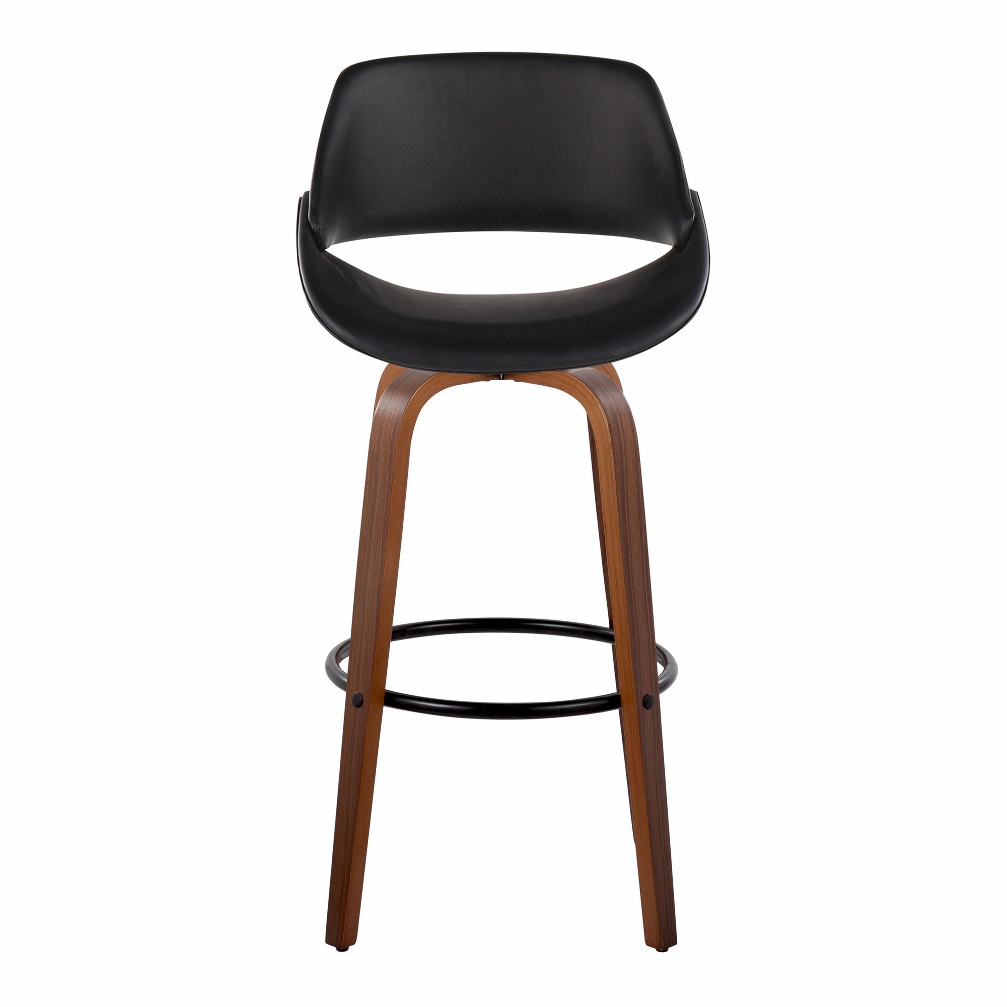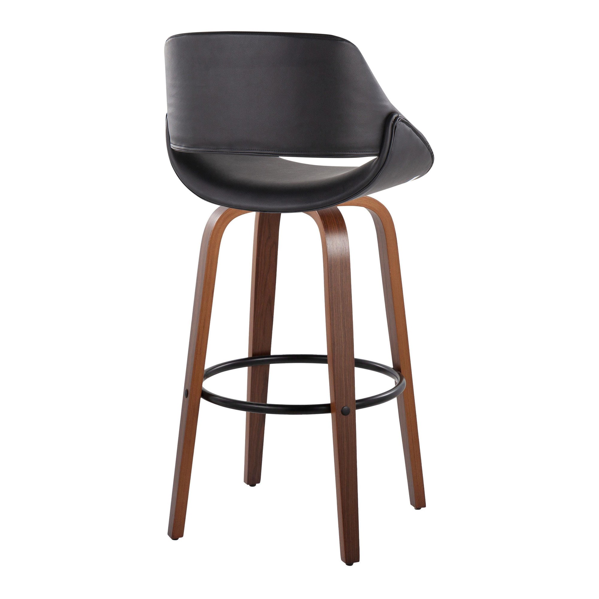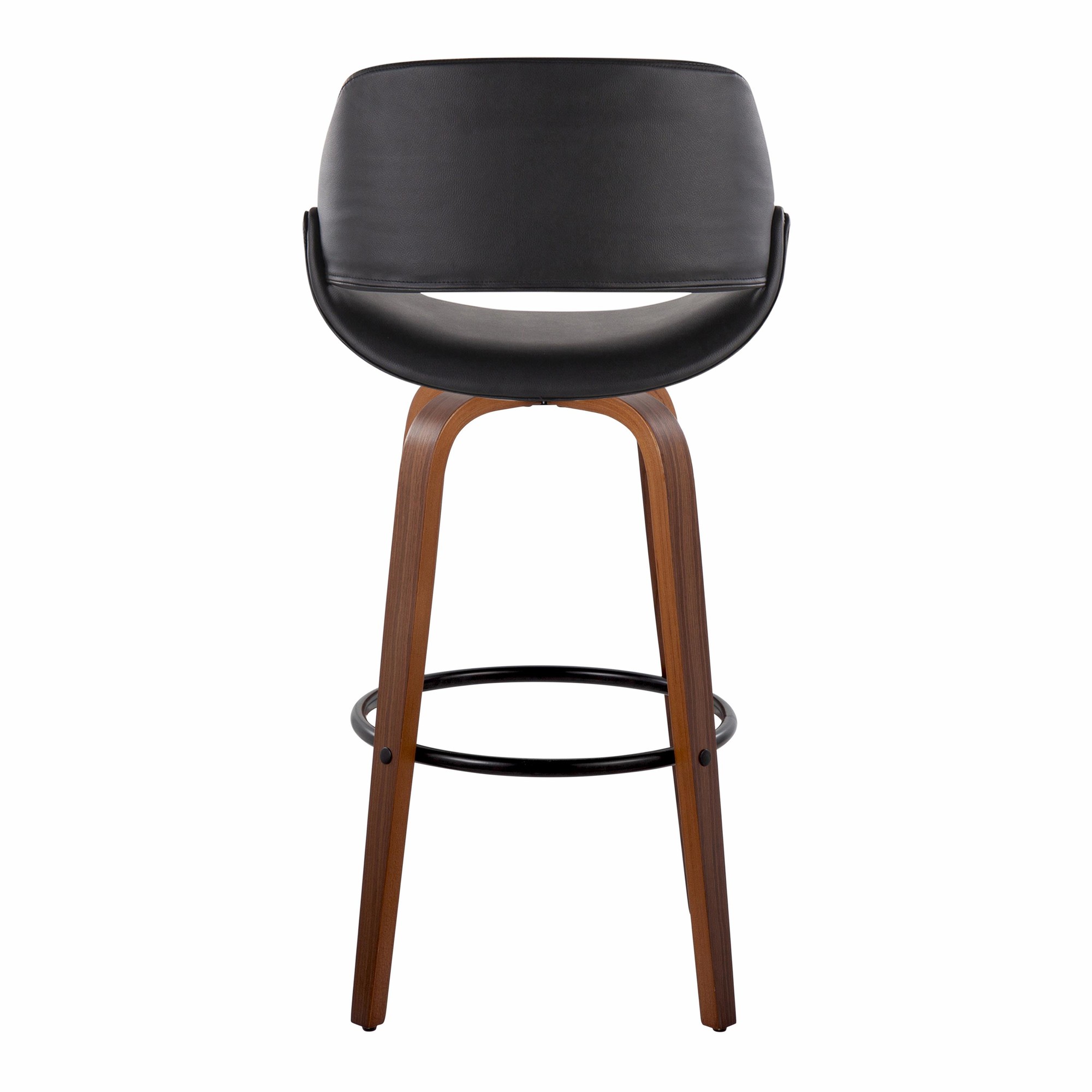 Add a touch of modern style to your man cave with the Fabrico 30″ Barstools. This set of two swivel barstools features a mid-century modern design with a comfortable, curved back. The faux leather seat is both stylish and easy to clean, while the bent wood legs and black metal footrest provide stability and support. Enjoy the 360-degree swivel for easy conversation and movement. This set includes two bar stools. Assembly is required. Color: Walnut Wood, Black PU, Black Metal. Material: PU Leather, Foam, Metal, Walnut Wood. Dimensions: 22″L x 22″W x 41.75″H.
