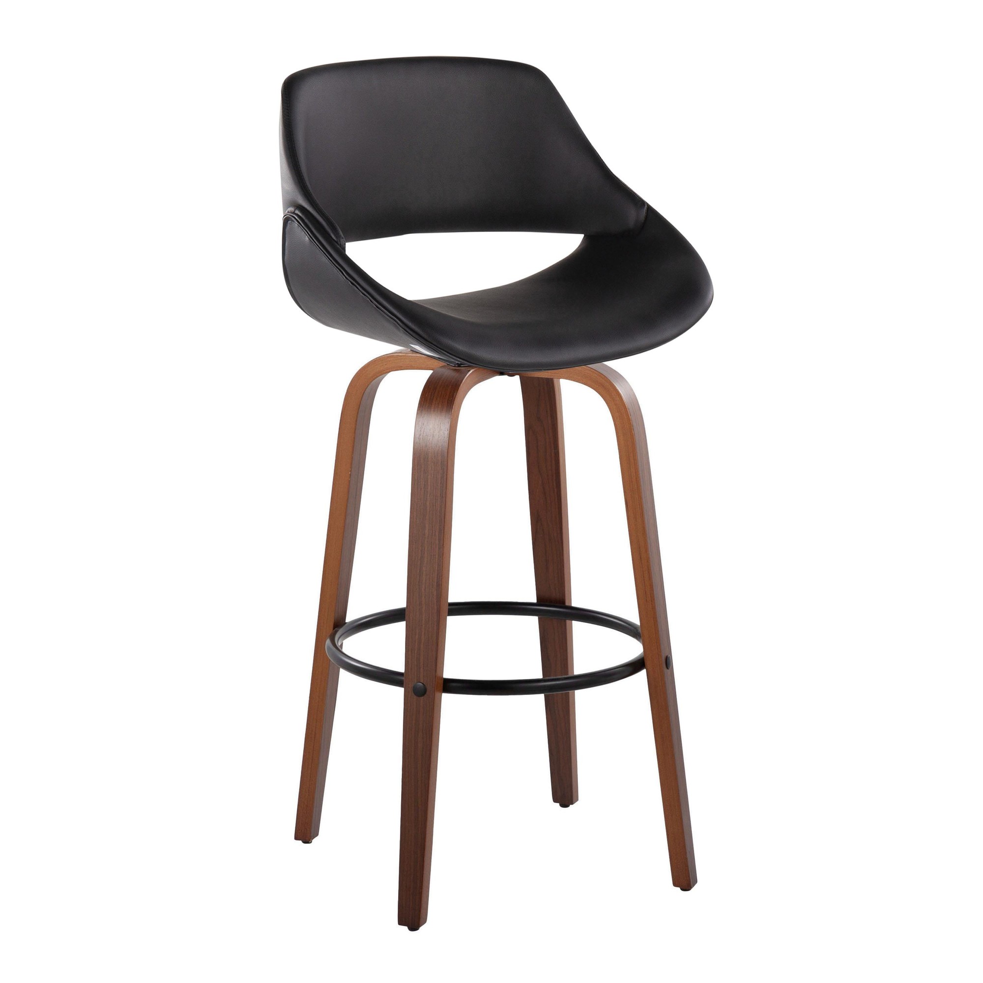 The Fabrico 30 Contemporary Walnut Black Swivel Barstools invite you to sit back and relax. These barstools feature a curved back and a contoured, upholstered seat, designed for maximum comfort. The flared wood swivel legs add a touch of style, while the black metal footrest enhances the overall design and provides added support. Sold in pairs, these barstools will be a great addition to your space.