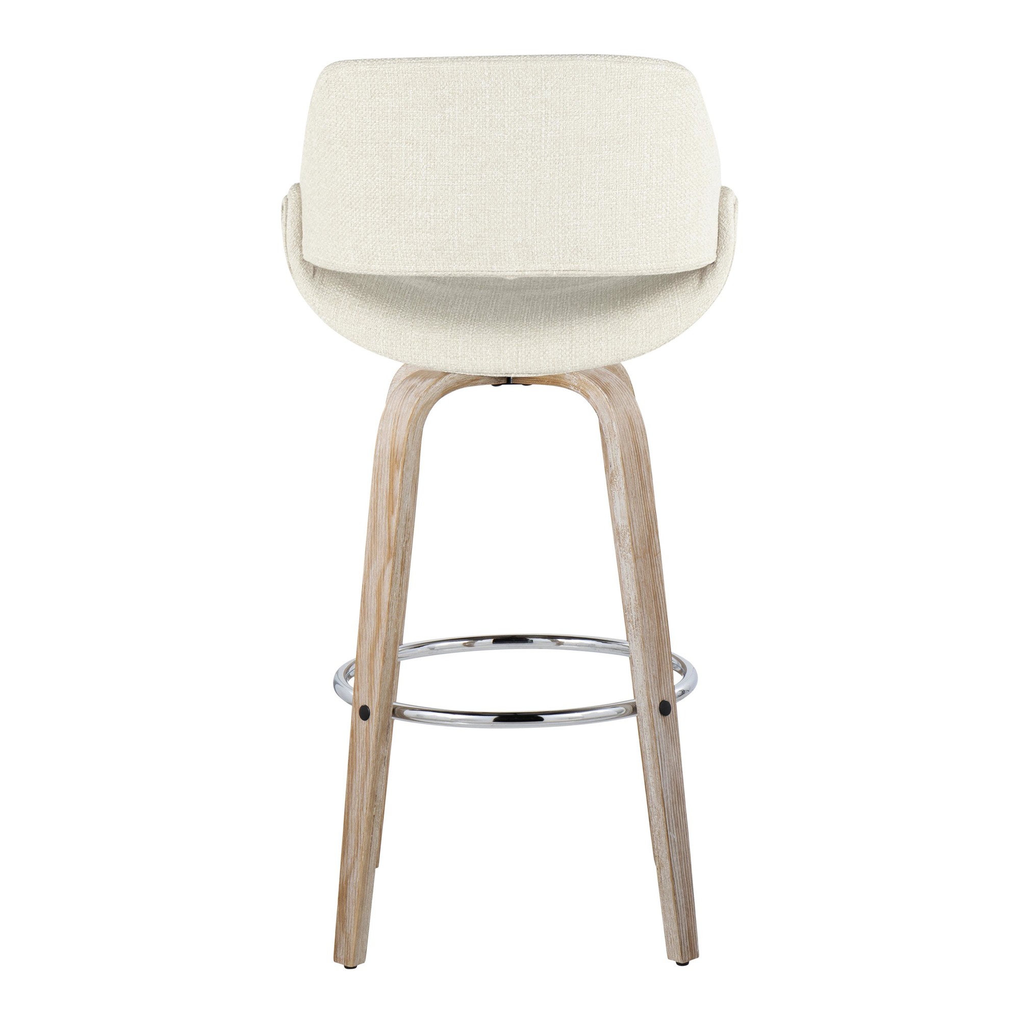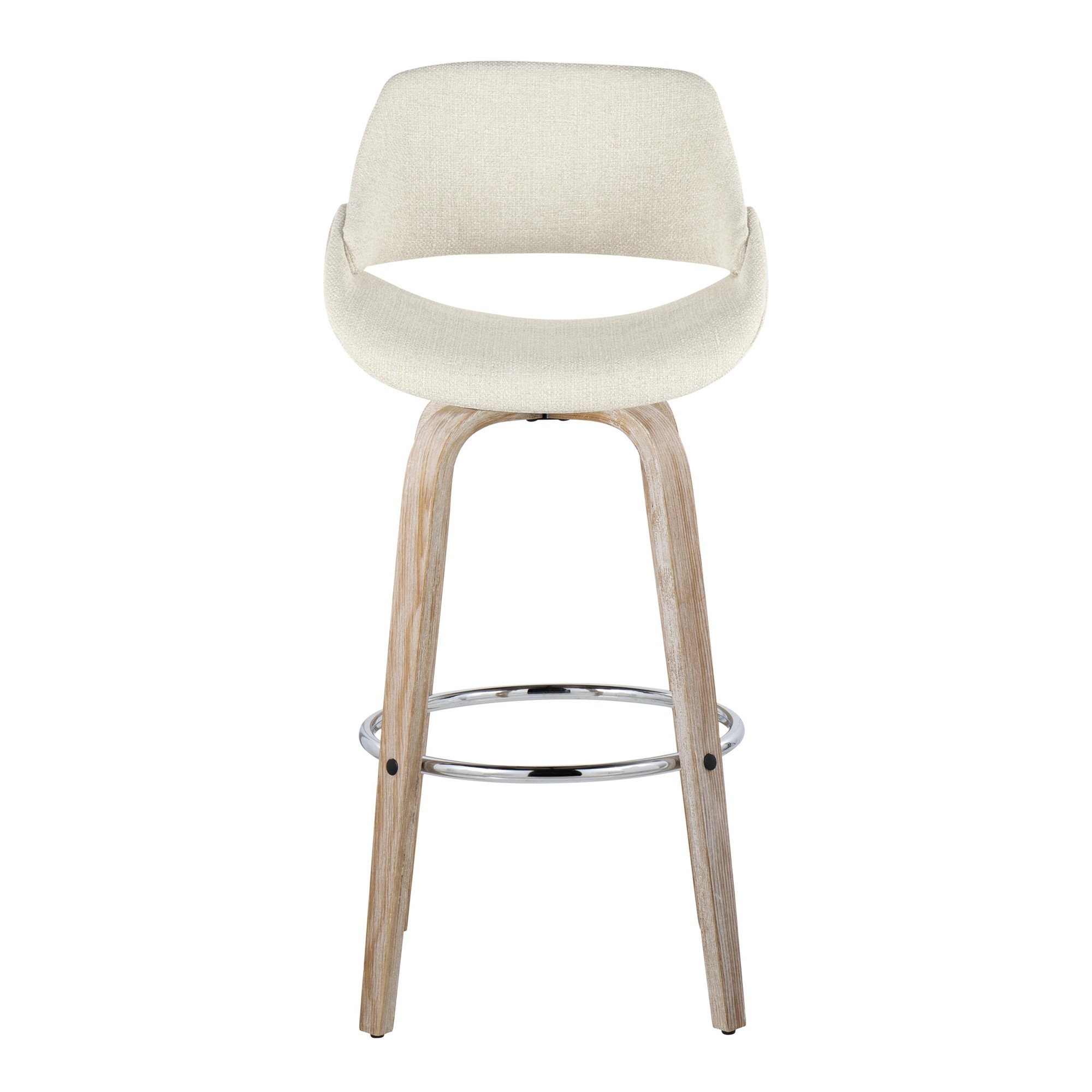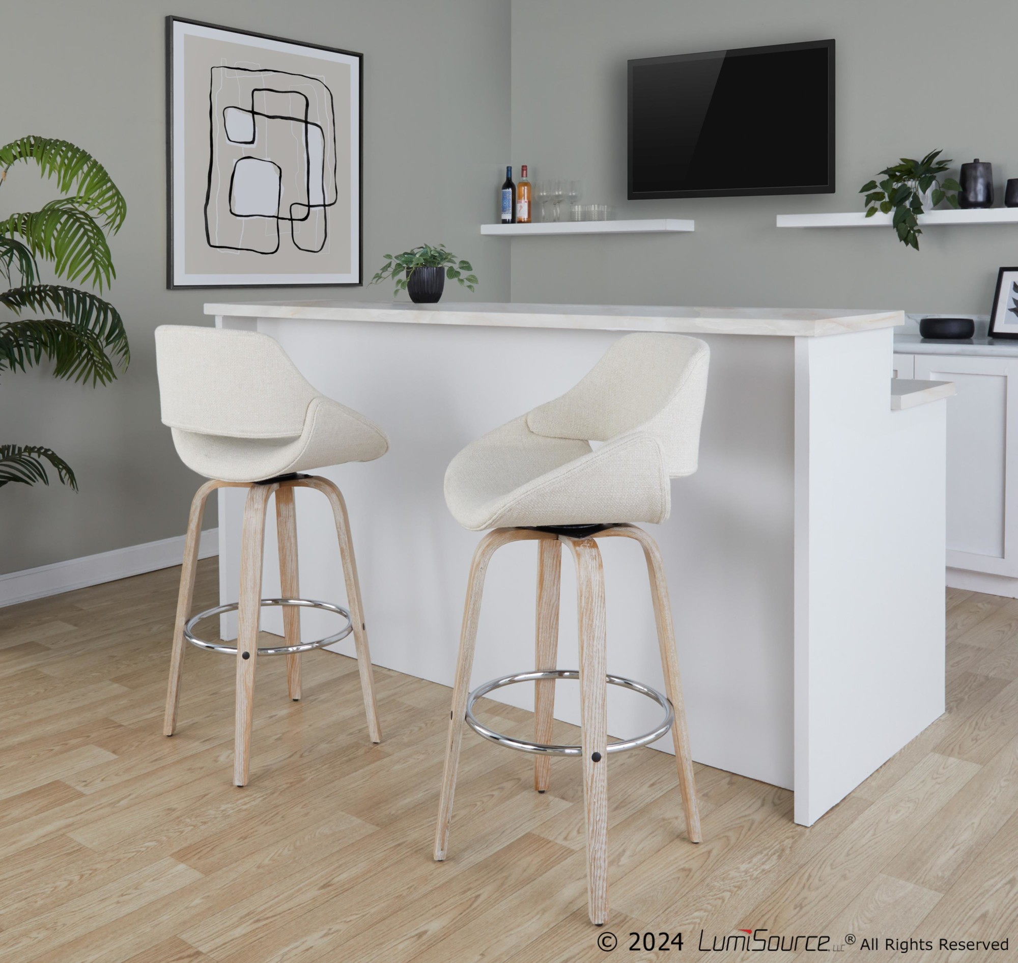 The Fabrico 30 Cream Noise Contemporary Swivel Barstools offer a wide and welcoming seat that invites relaxation. This pair of bar stools feature a curved back and contoured upholstered seat, ensuring comfort and style. The flared wood swivel legs add a touch of elegance, complemented by a round chrome metal footrest. Each stool is designed with a fixed bar height and 360-degree swivel for optimal functionality. The stylish fabric upholstery is both eye-catching and comfortable. Sold in pairs, each stool has a weight limit: 250 lbs. Dimensions: 22″L x 22″W x 41.75″H. Color: White Washed Wood, Cream Noise Fabric, Chrome Metal. Assembly Required: Yes.