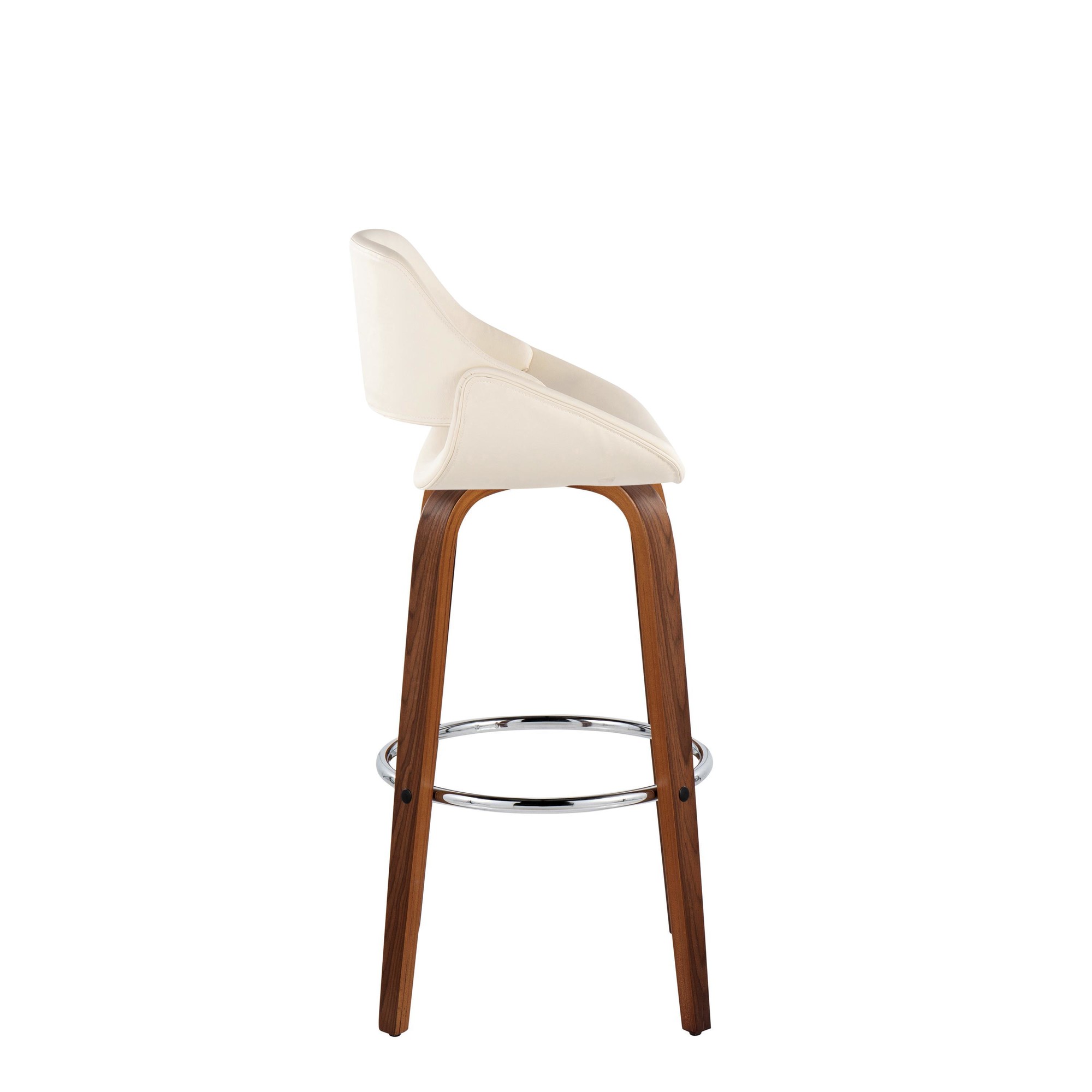 The Fabrico 30 Mid-Century Cream Faux Leather Swivel Barstool invites you to sit back and relax. With its wide, welcoming seat, curved back, and comfortable faux leather upholstery, this barstool is the perfect addition to your man cave bar. The flared wood swivel legs add a touch of mid-century modern style, while the chrome metal footrest provides extra comfort.
