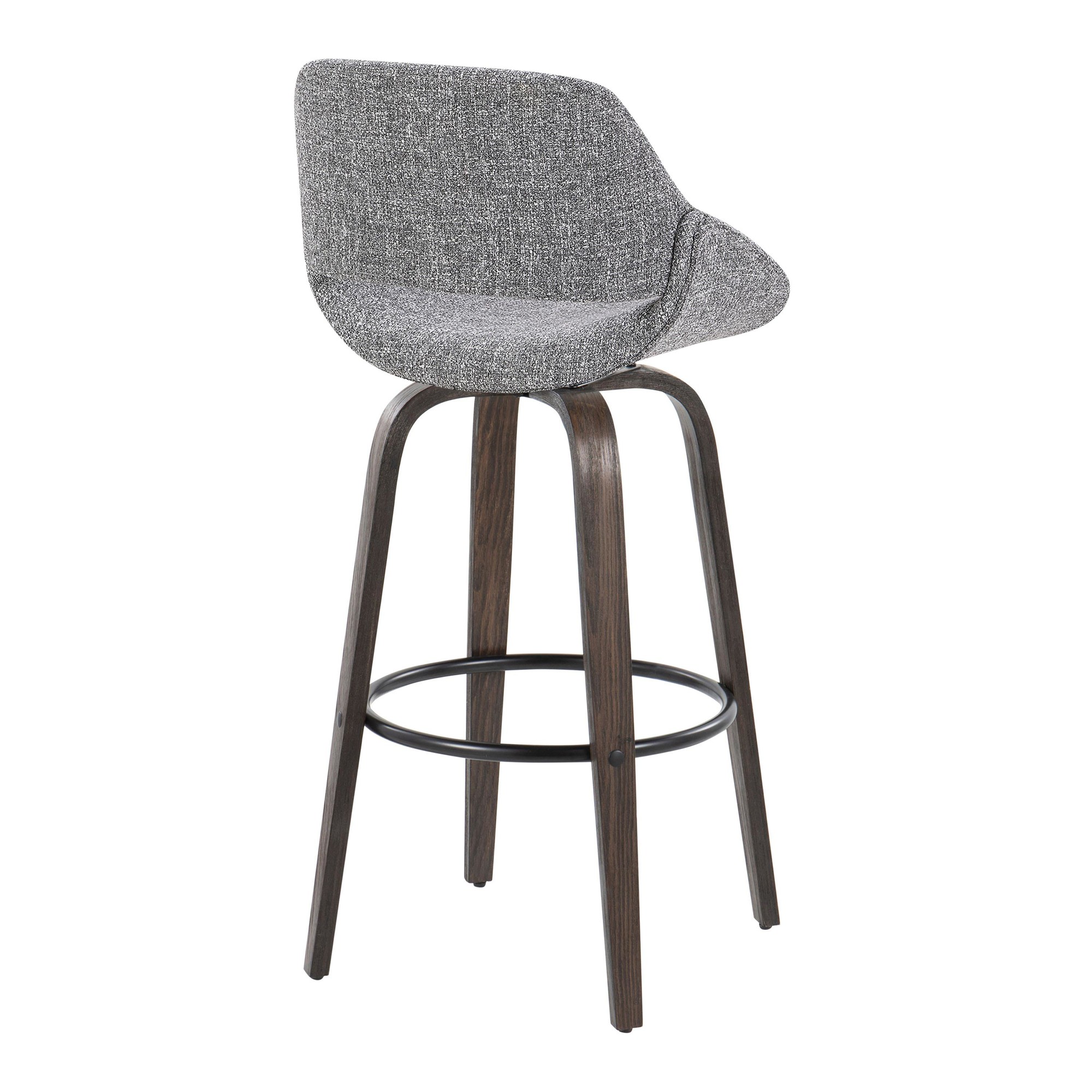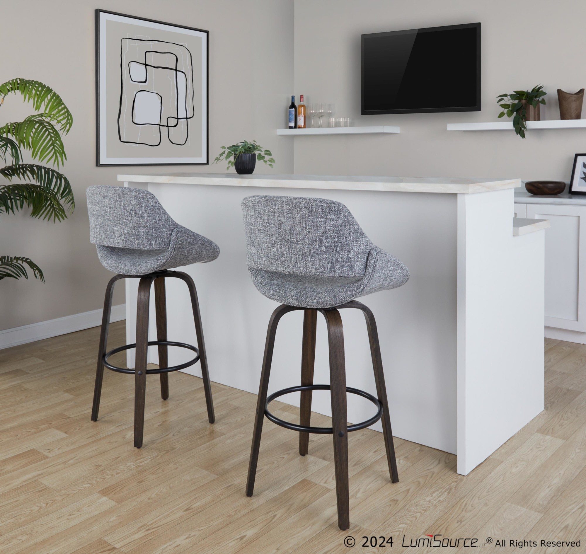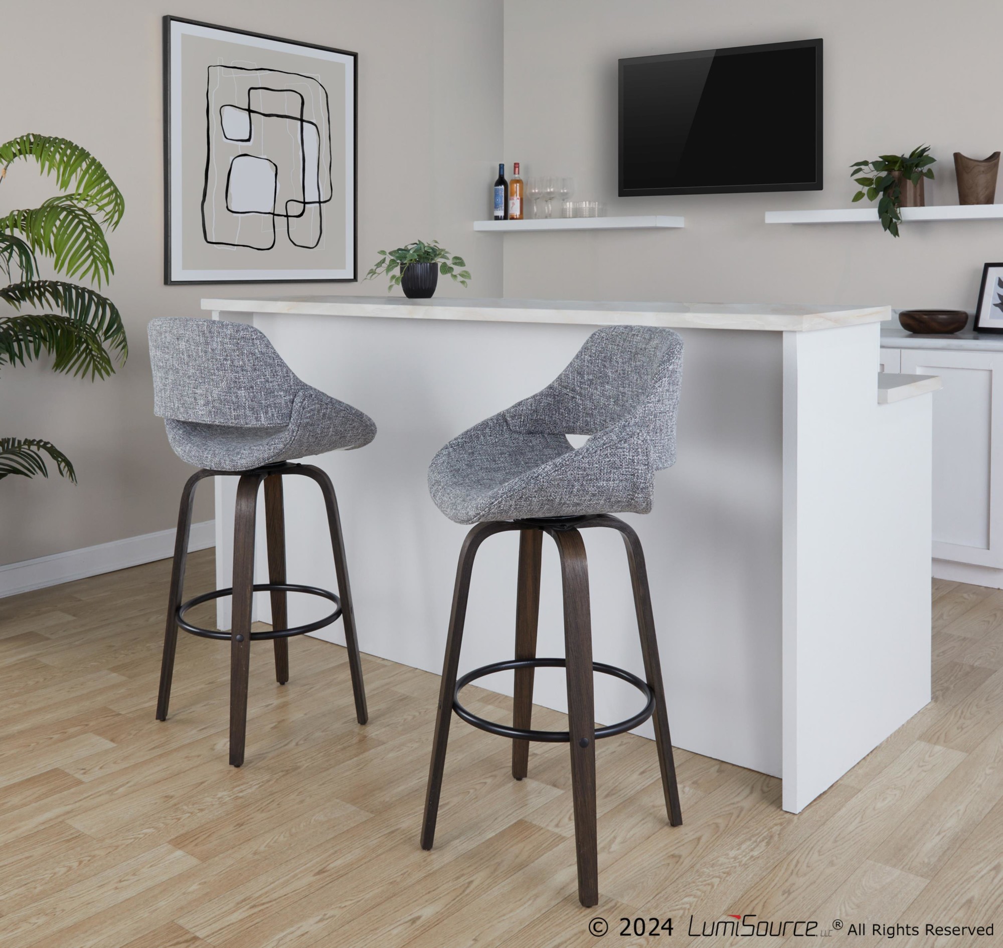 The Fabrico 30 Mid-Century Modern Grey Swivel Barstools invite you to sit and relax. Featuring a wide, welcoming seat, these barstools offer both style and comfort. The curved back and contoured upholstered seat are complemented by flared wood swivel legs, enhancing the overall design.