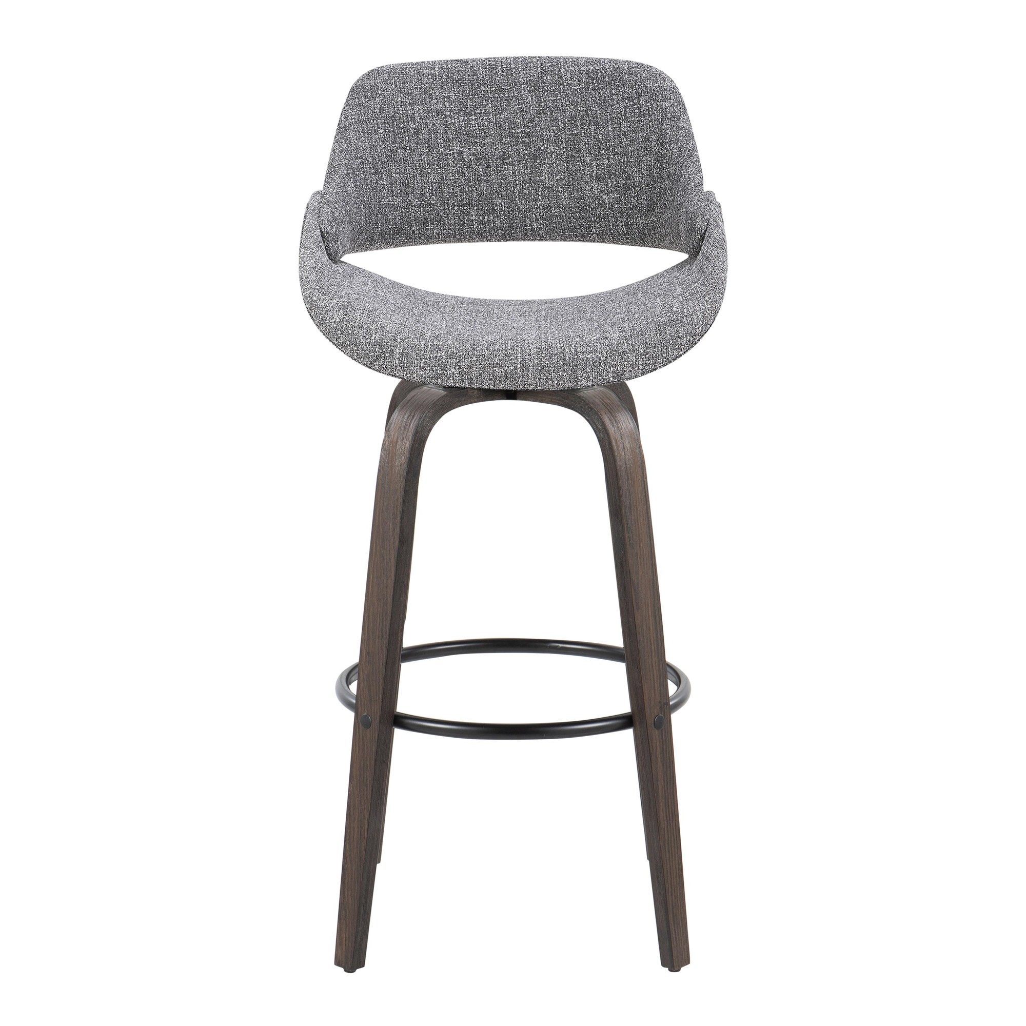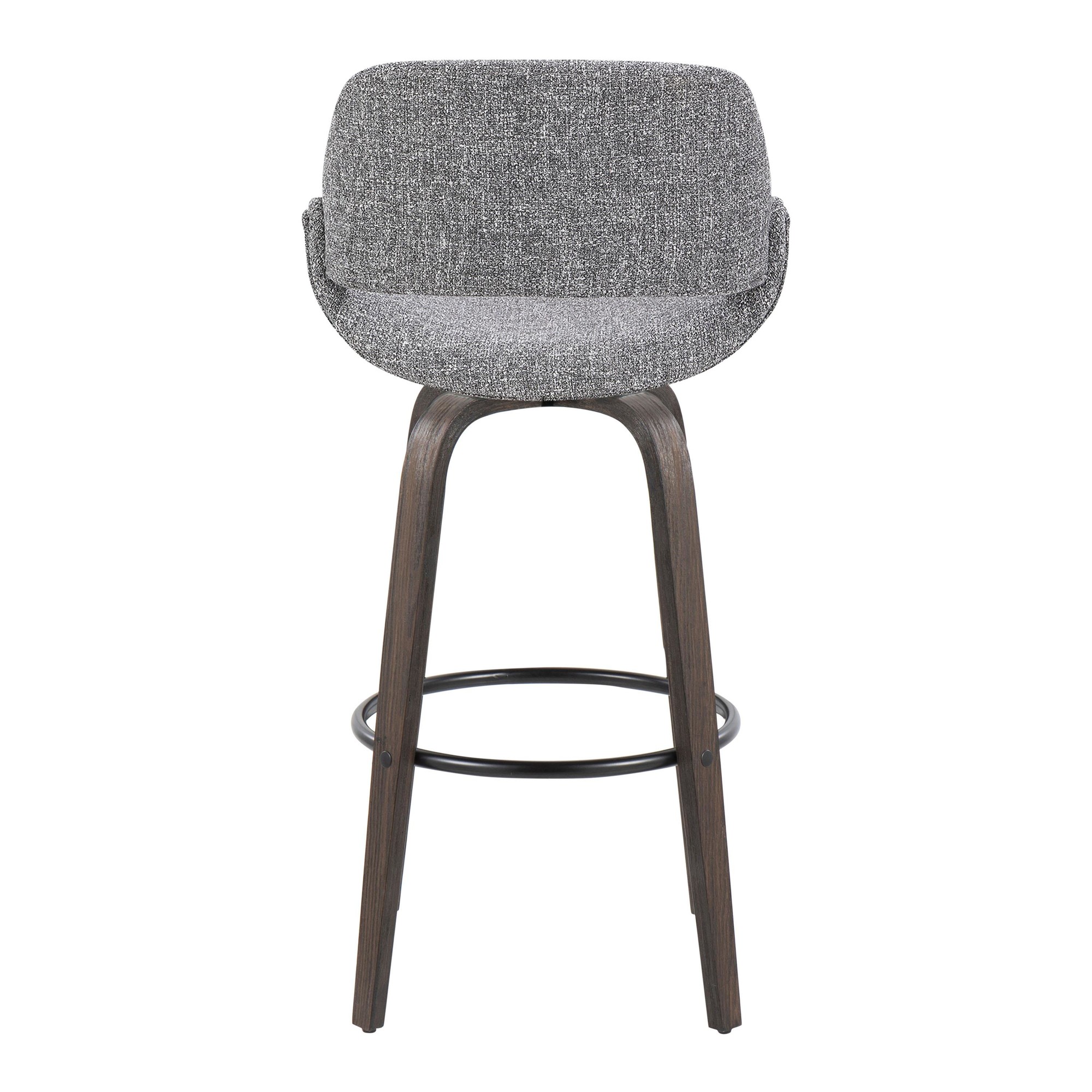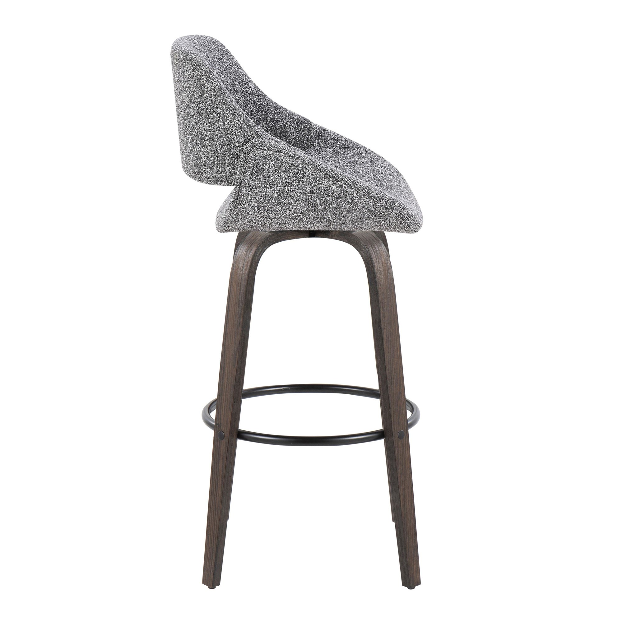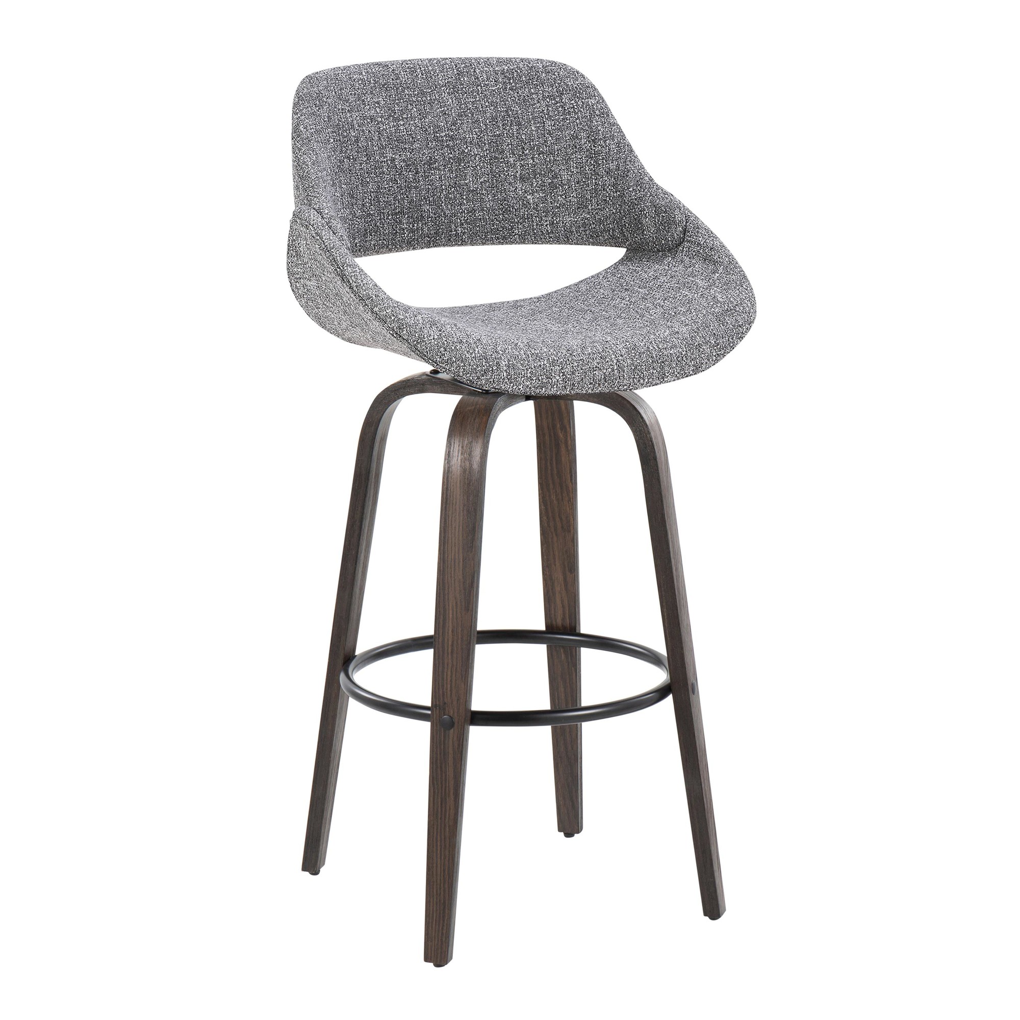 The Fabrico 30 Mid-Century Modern Grey Swivel Barstools invite you to sit and relax. Featuring a wide, welcoming seat, these barstools offer both style and comfort. The curved back and contoured upholstered seat are complemented by flared wood swivel legs, enhancing the overall design.