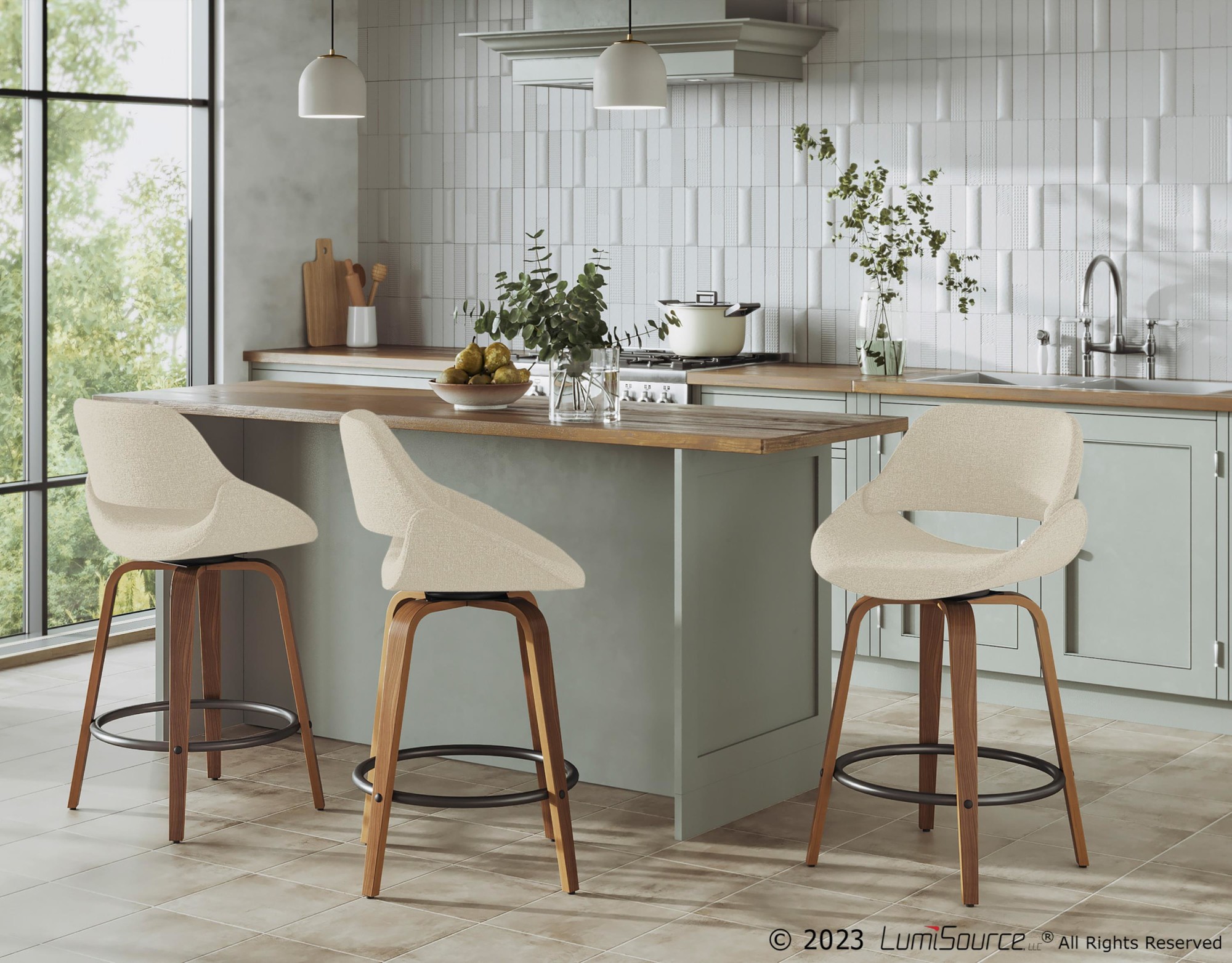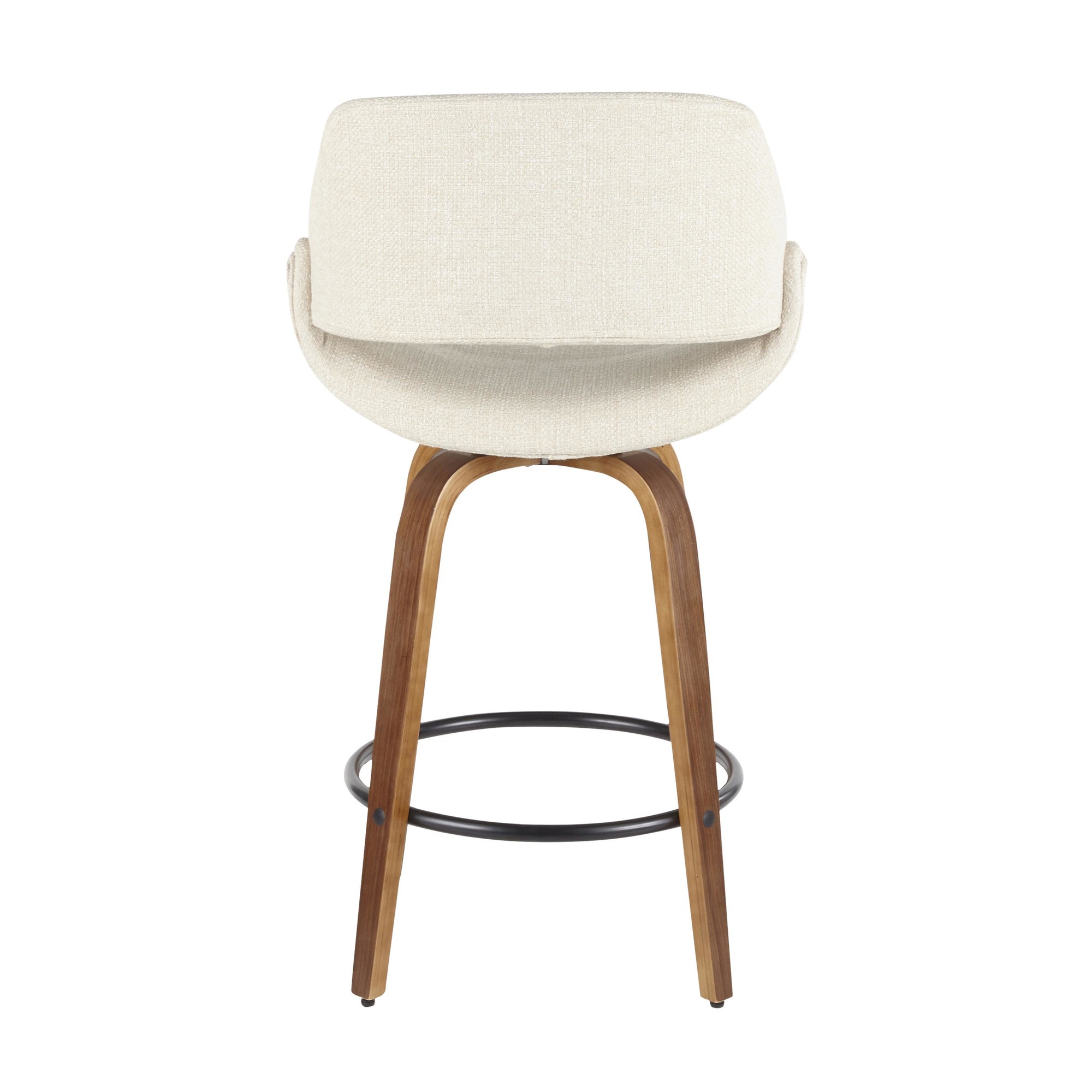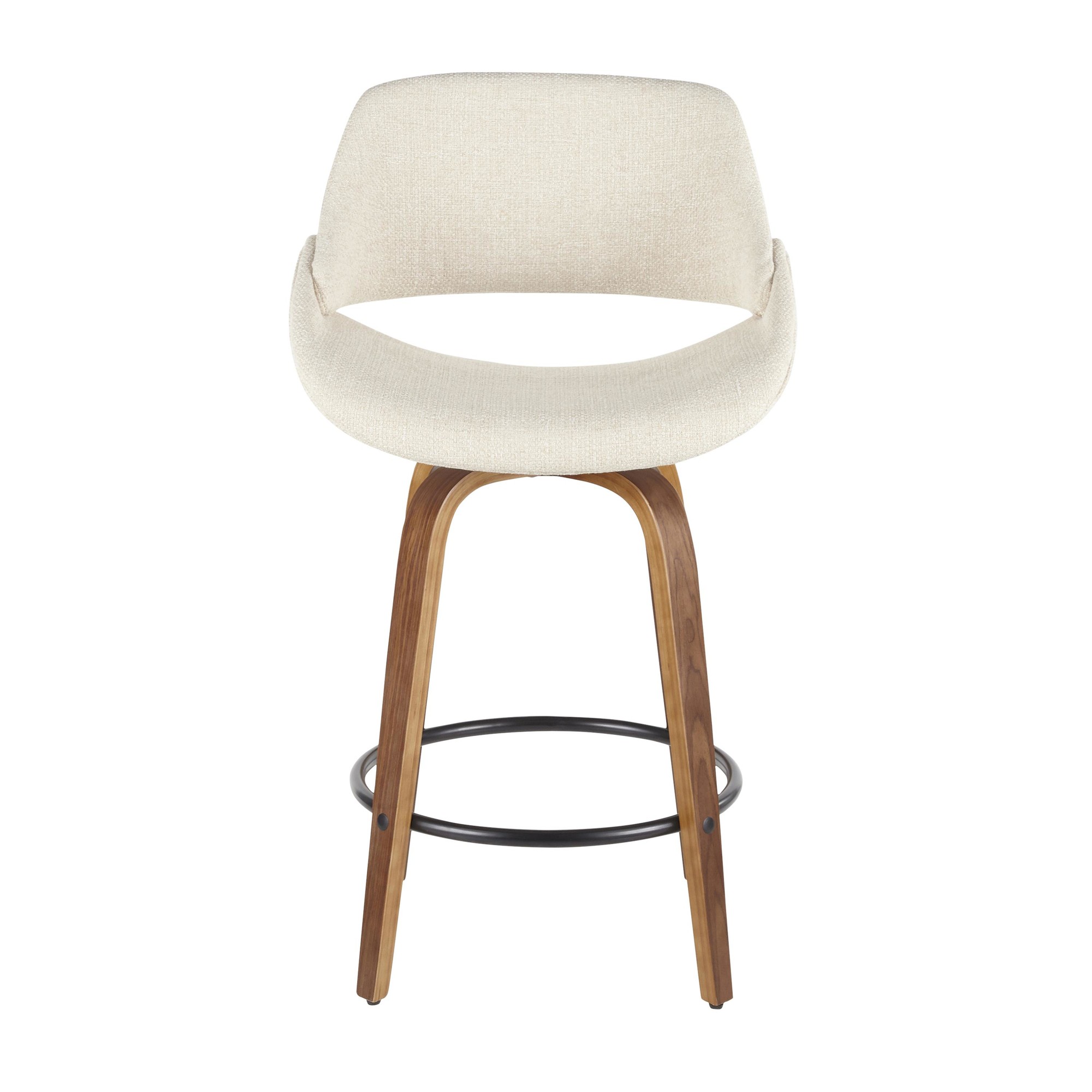 Upgrade your space with the Fabrico 26-Inch Cream Mid-Century Modern Swivel Counter Stools. This set includes two counter stools. Enjoy the mid-century modern styling, featuring flared walnut wood legs. The padded seat and backrest offer extra comfort. The stools have a fixed counter height and a 360-degree swivel seat. Relax with a round built-in footrest with a black finish. The seat to floor height is 26″. The seat depth is 16.5″ and the inside seat width is 17.5″. The seat to footrest height is 17″. The backrest height is 13.25″. These stools are perfect for indoor use and hold up to 250 lbs each. Assembly is required. The stools are made of polyester fabric, foam, painted steel, and wood.
