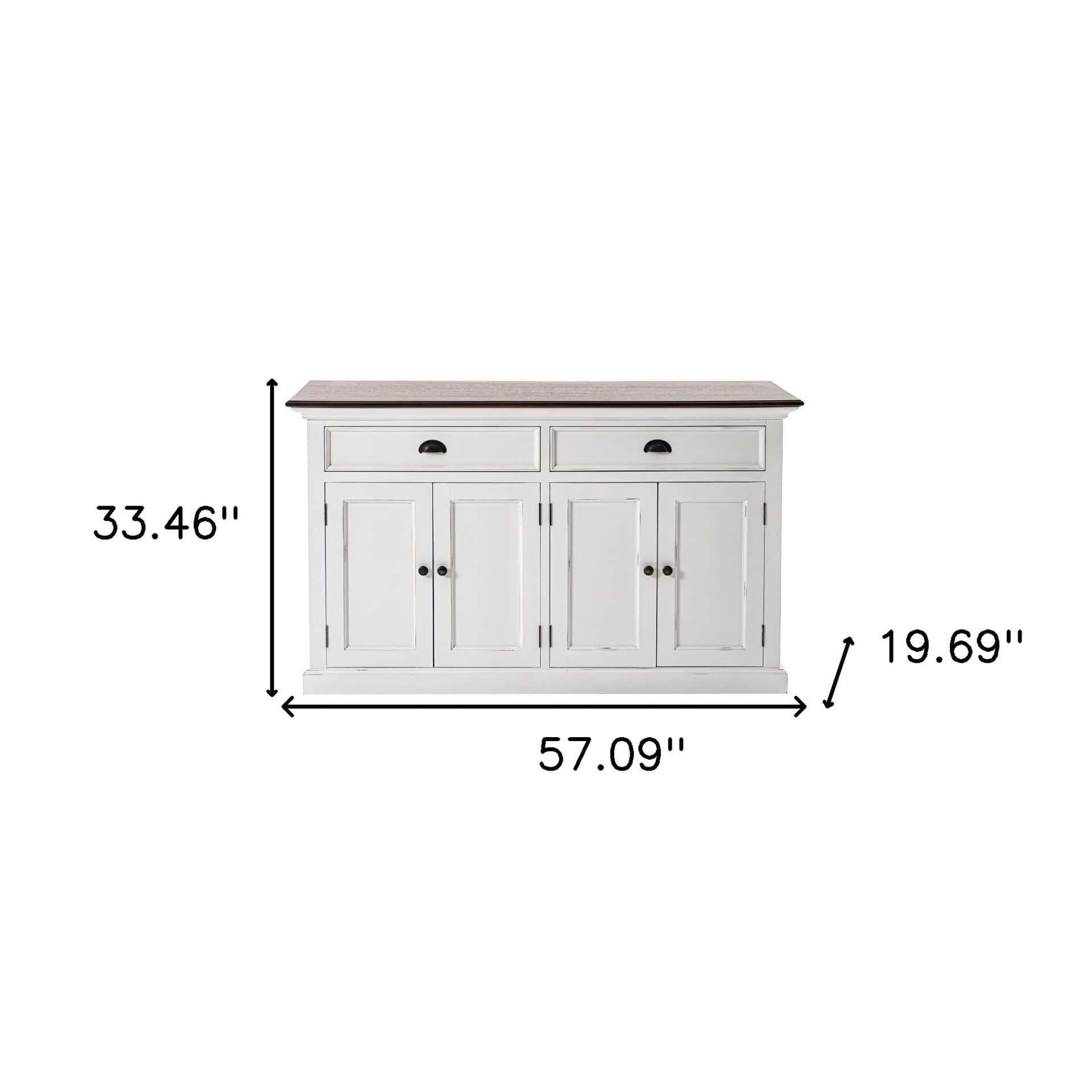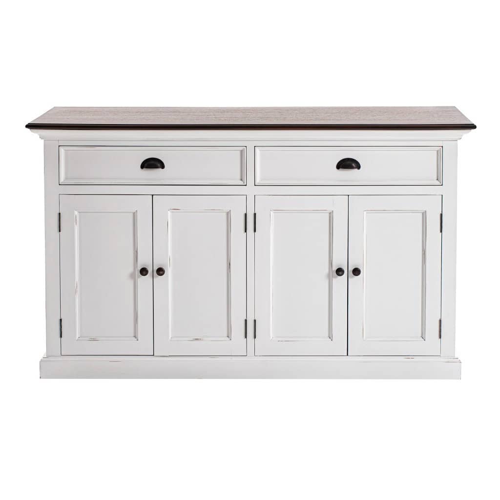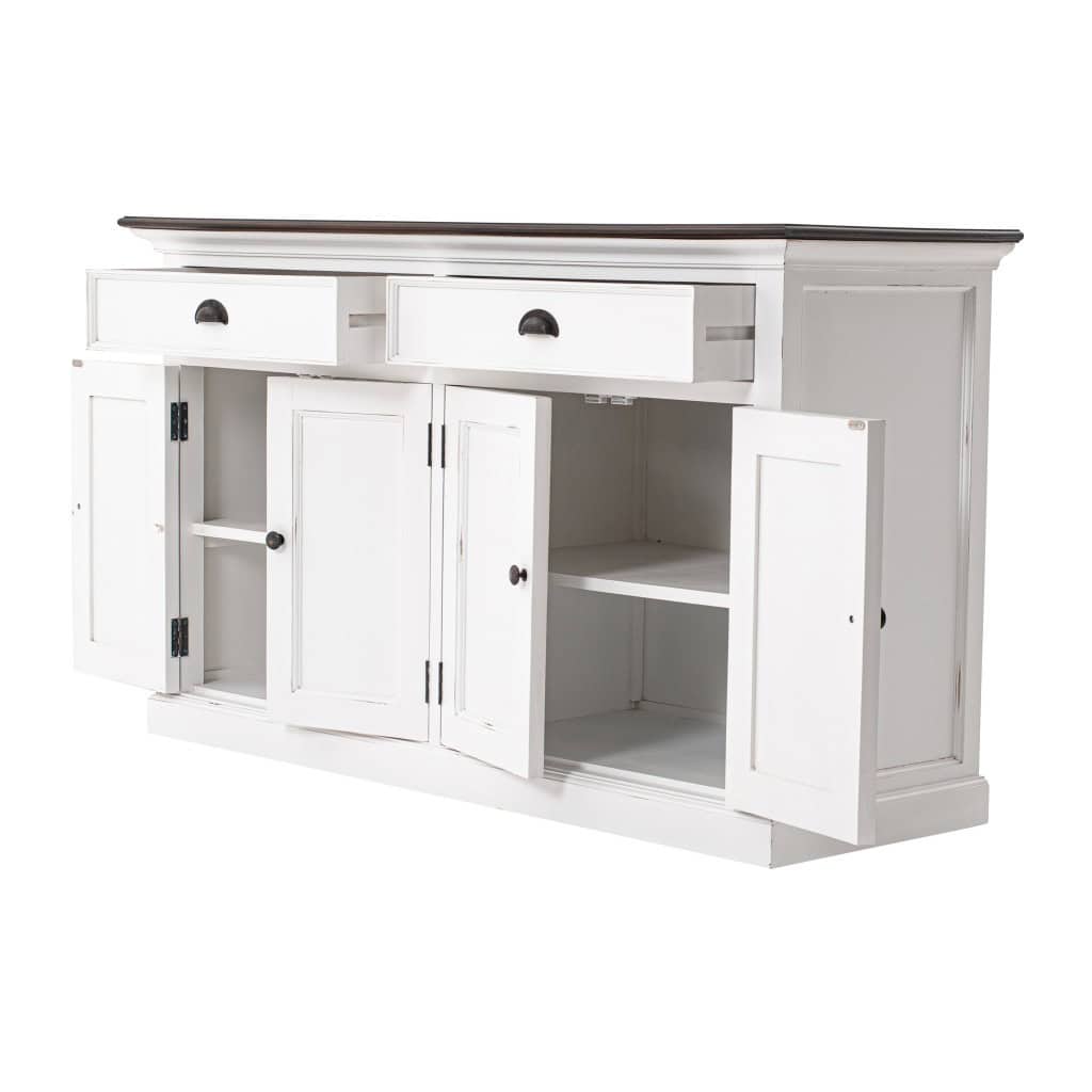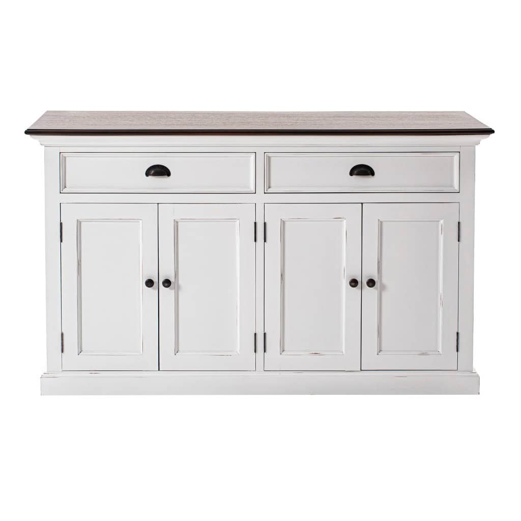 If a stylishly charming and fresh design is what you are going for, the Farmhouse Brown and White Buffet Server With Storage Shelves is sure to impress with its simple yet elegant design. Crafted with the highest quality mahogany MDF, this buffet server features a slightly distressed rustic white and deep brown finish, offering a transitional style that complements various decor themes. With two drawers, two doors with internal shelving, and black crescent pulls, knobs, and hinges, this piece combines practicality with a timeless aesthetic. Ideal for use in the living room, dining area, hallway, or kitchen, it provides ample storage for houseware and a spacious top surface perfect for displaying artwork or decor.