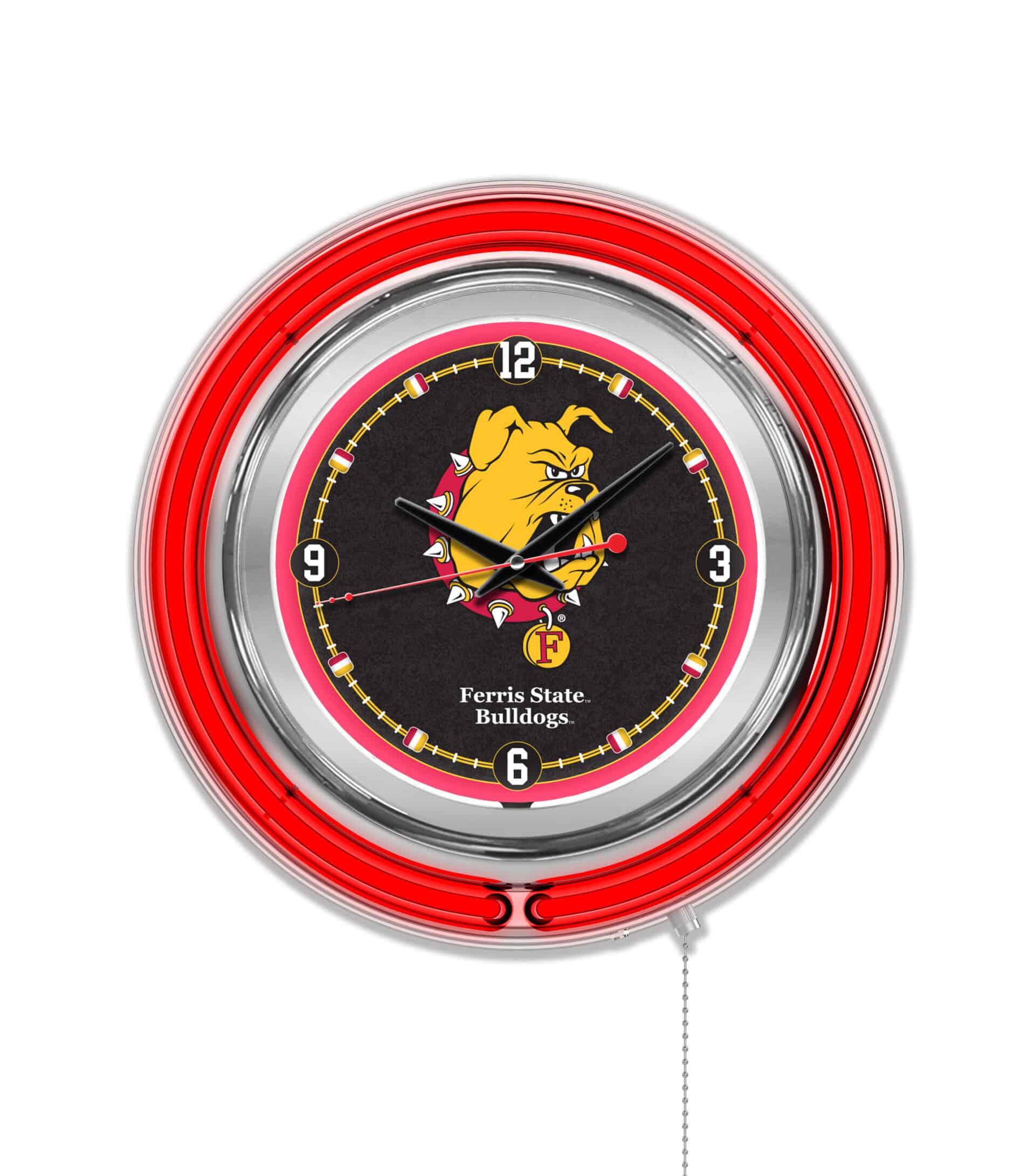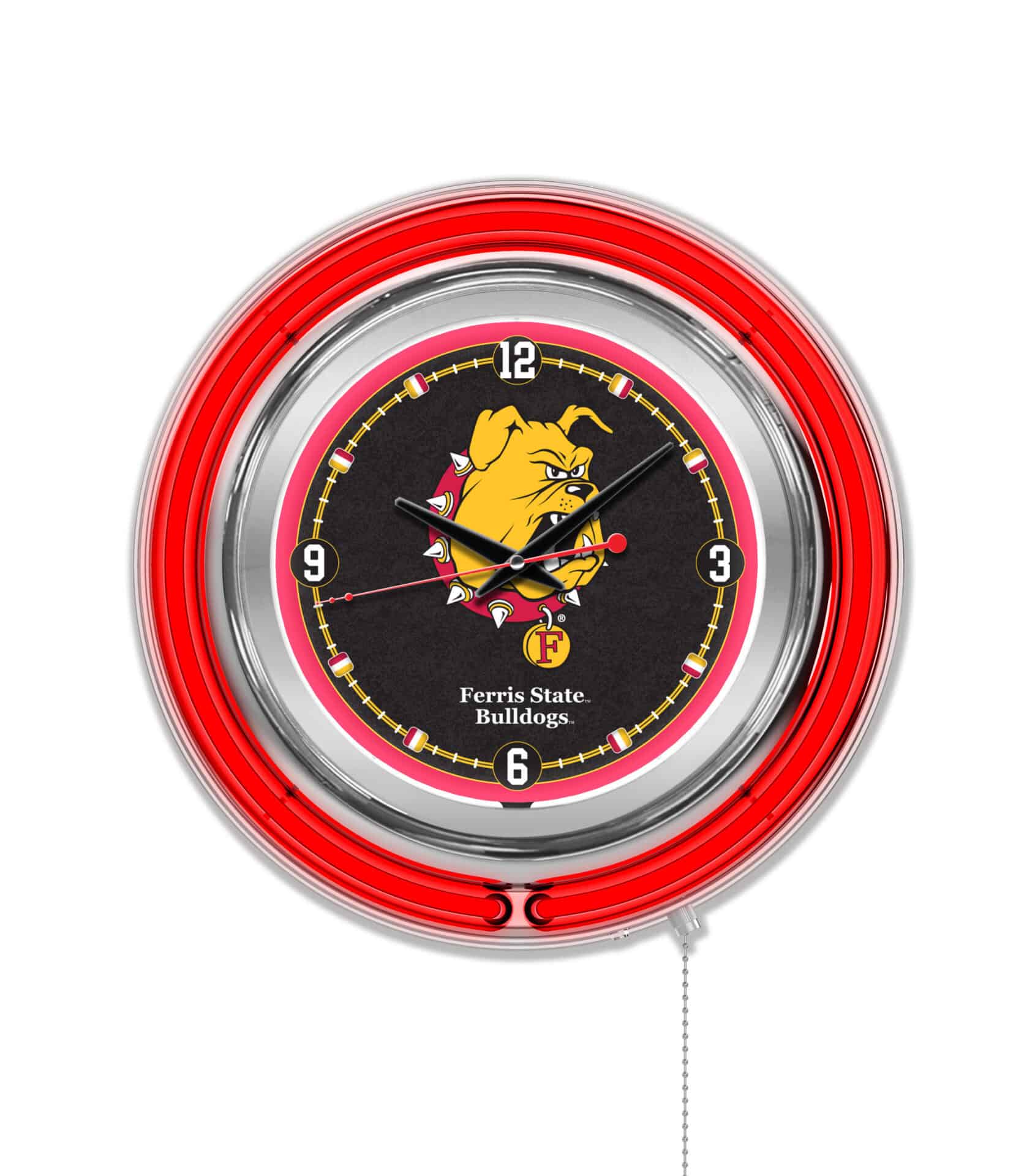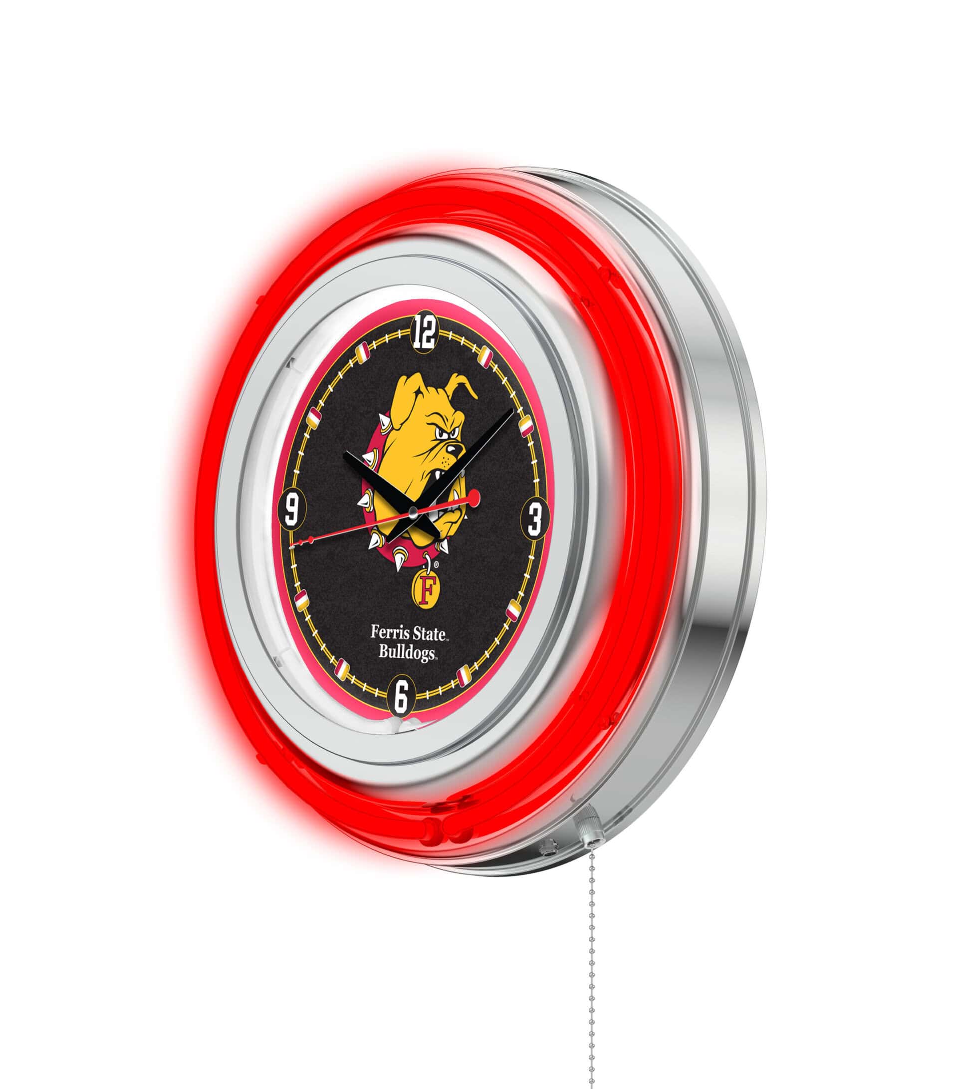 The Ferris State University 15-Inch Neon Logo Clock in Chrome is a stunning addition to any man cave, showcasing vibrant school pride. This clock features a chrome casing with a custom printed clock face illuminated by a brilliant white inner neon ring, complemented by a team color-specific outer neon ring. The neon rings can be effortlessly activated or deactivated using a pull chain located at the bottom of the clock. It is powered by a UL Listed transformer that connects to a standard 120V outlet, while the accurate quartz movement ensures precise timekeeping, relying on a single AA battery (not included). Perfect as a gift for graduates, sports fans, or for personal use, this clock is a stylish and functional statement piece.