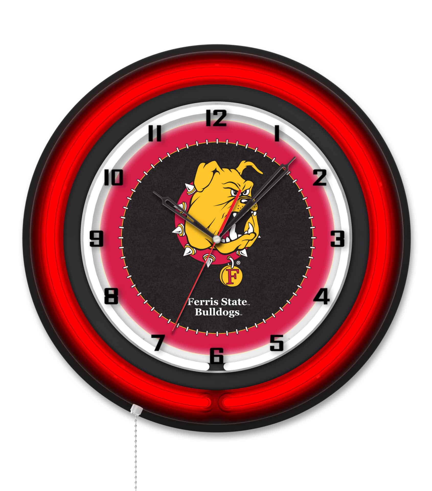 The Ferris State University 19-Inch Neon Logo Clock in Black is the ultimate addition to any fan’s man cave. This striking clock showcases vibrant, full-color artwork and features a unique double neon design that highlights your school pride. The black casing and outer neon ring complement the custom printed clock face, illuminated by a brilliant white inner neon ring, ensuring that it stands out in any room. With an easy pull chain for operation, this clock is both stylish and functional, powered by a standard 120V outlet and requiring only one AA battery for accurate timekeeping.
