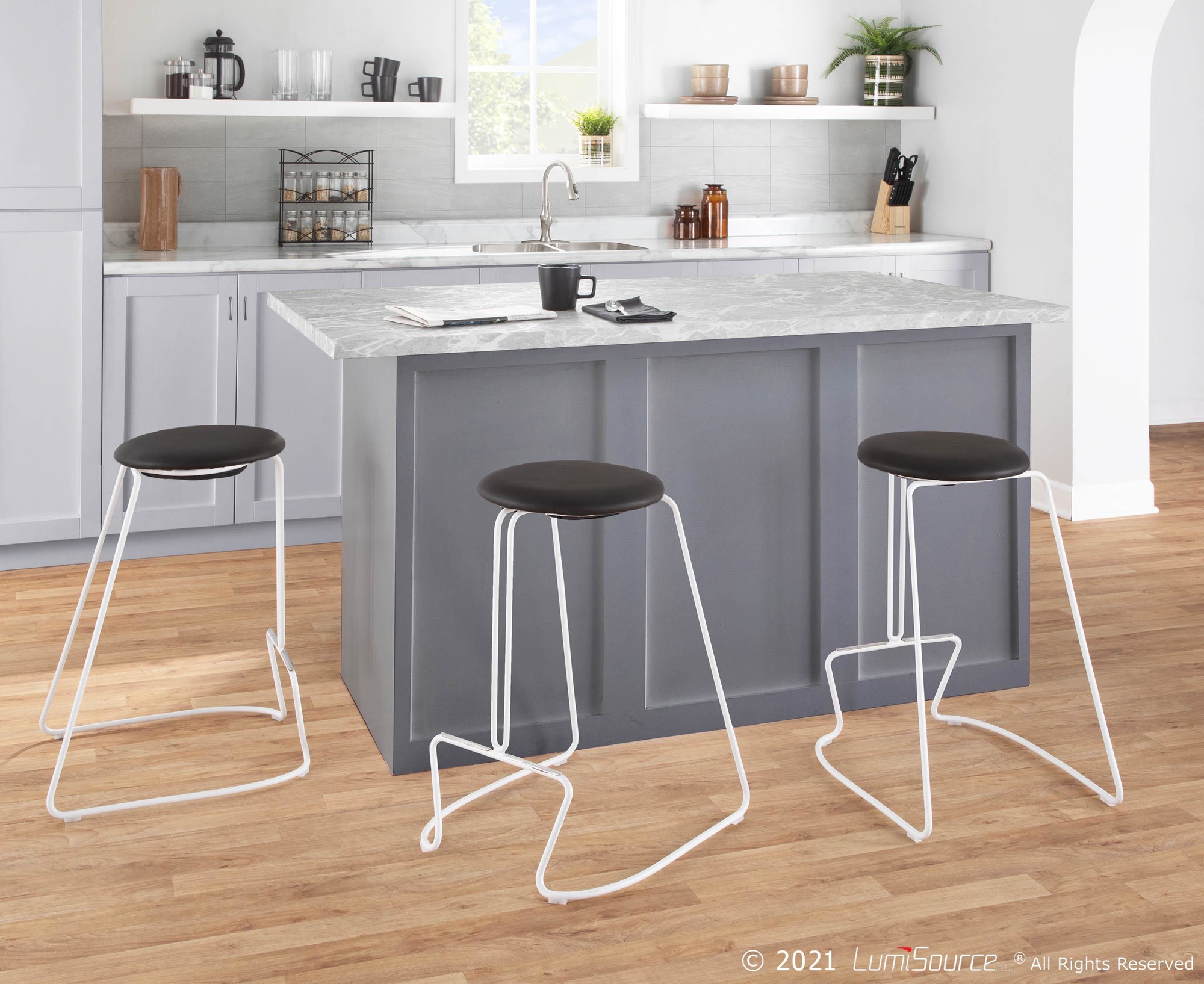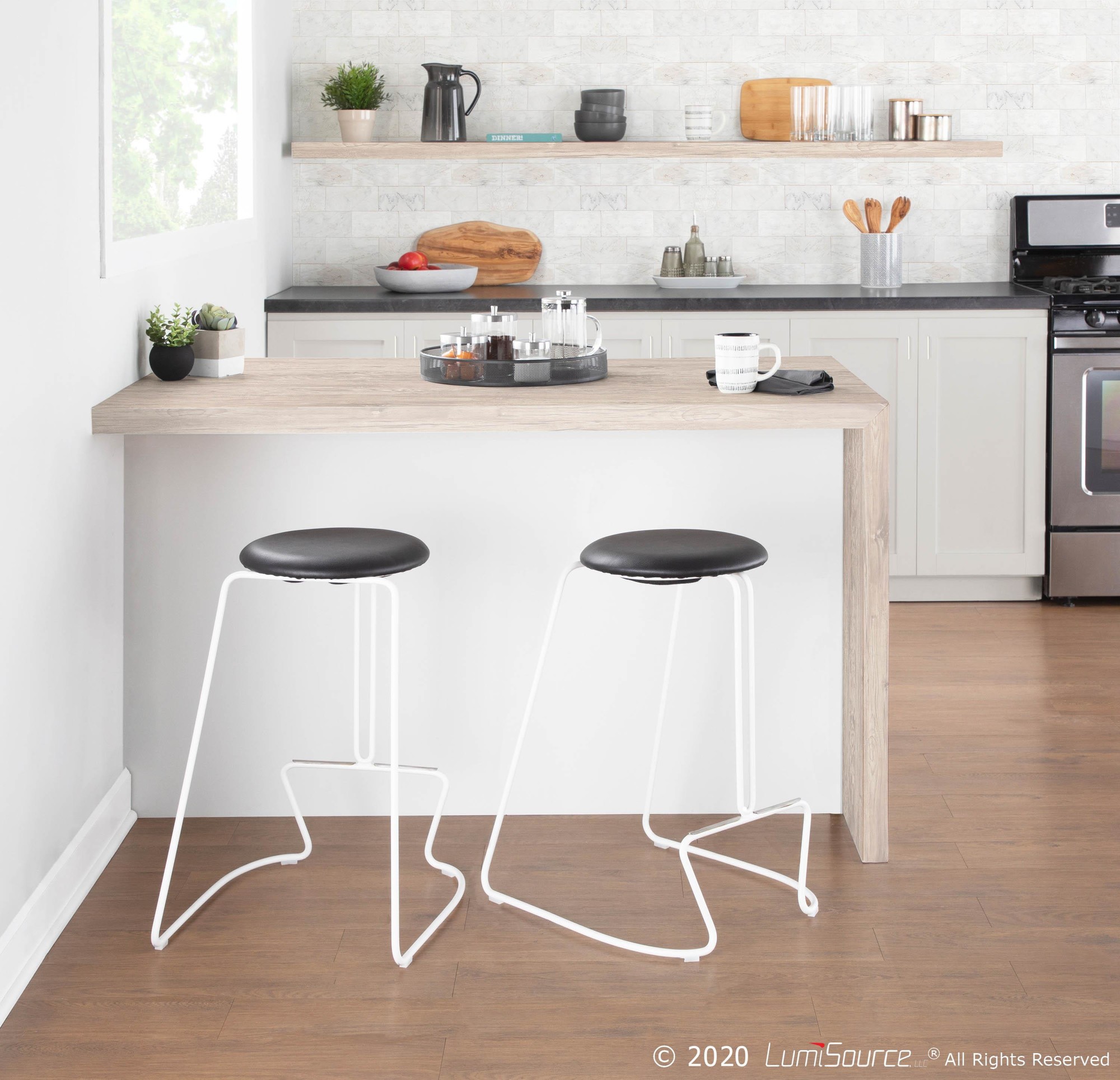 - Includes two counter stools