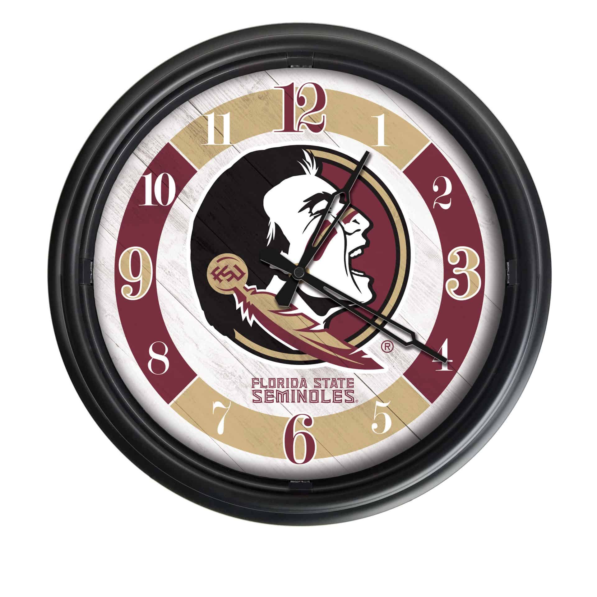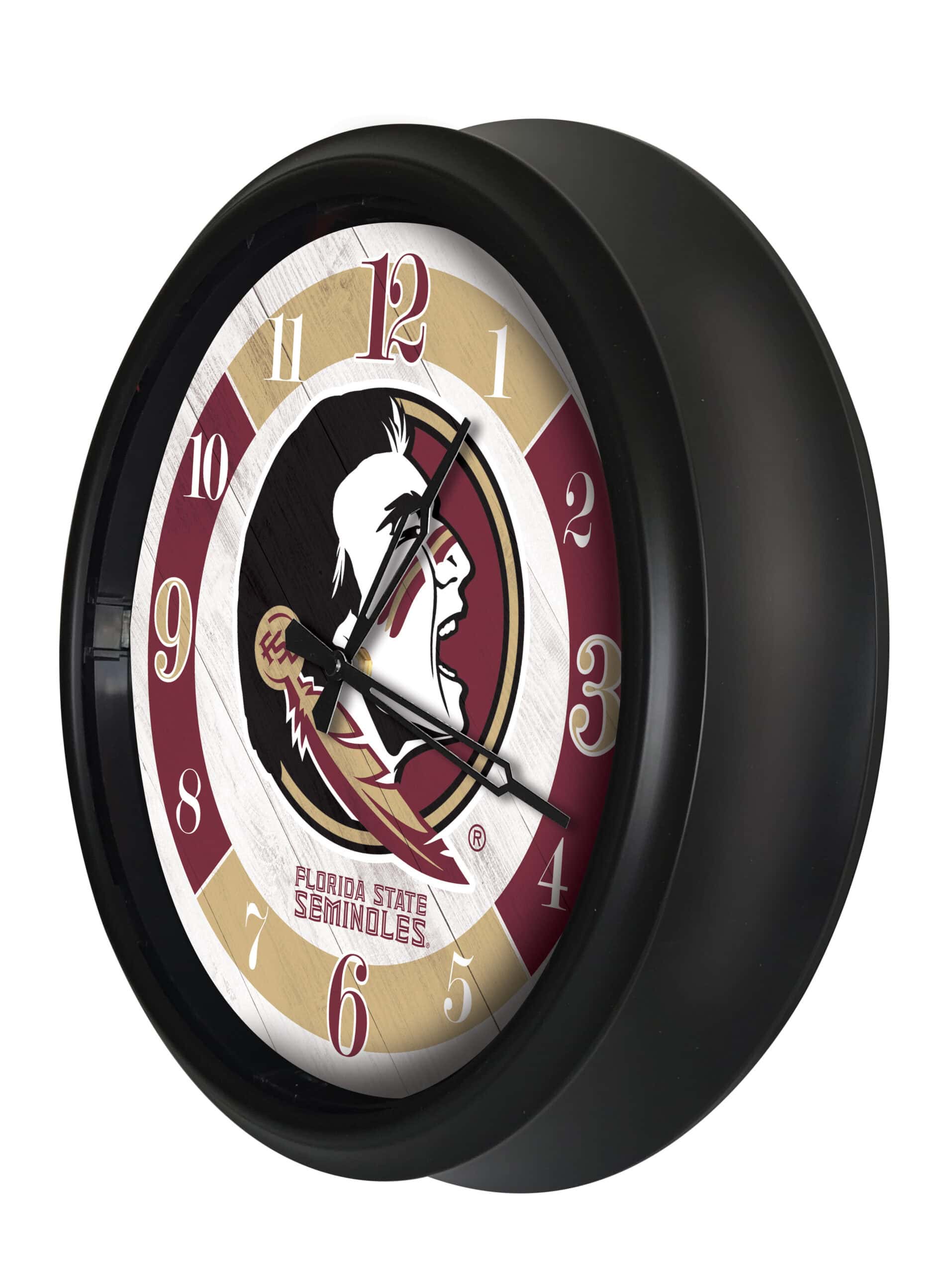 The Florida State (Head) 14-Inch Indoor/Outdoor LED Wall Clock in Black is the perfect way to showcase your school pride while ensuring functionality and style. Designed for both indoor and outdoor use, this clock features a durable construction that can withstand the elements. The vibrant, full-color UV printed artwork provides a striking display, while the innovative LED lights automatically illuminate the clock face in low light conditions, making it easy to read at any time of day or night. Enjoy the convenience of battery-powered operation and the assurance of accurate timekeeping with its quartz movement.