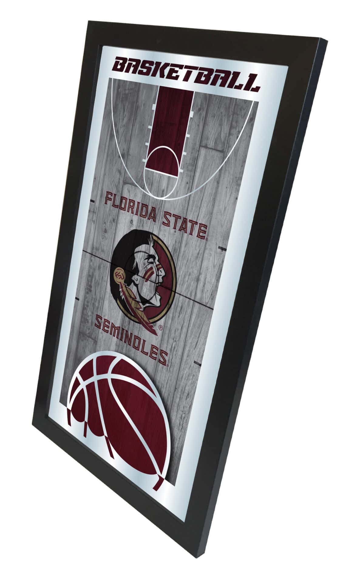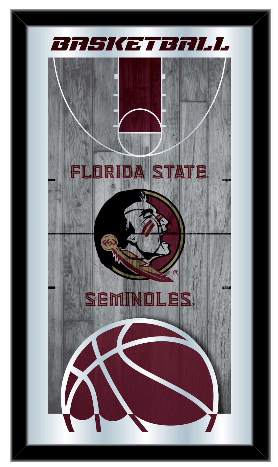 Show your school pride with this officially licensed basketball mirror. Its simple yet elegant design features vibrant colors that burst through the 1/8″ thick glass, beautifully highlighted by mirrored accents. The mirror is framed in a sleek black, 1 1/4″ wrapped wood frame and includes saw-tooth hangers for easy installation. Measuring 15″ in height and 26″ in width, this mirror is perfect for your office, garage, or any room in your home. Whether you’re purchasing it as a gift for a recent graduate, a sports super fan, or for yourself, you can take satisfaction in knowing you’re getting a quality product.