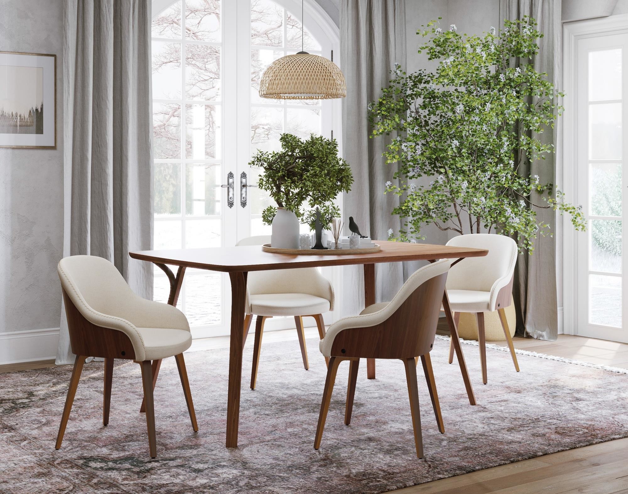 The Folia-Bacci Dining Set is a fantastic addition to any modern dining space. This set combines a simple, sleek table design with comfortable, stylish chairs, creating a beautifully curated space for dining and entertaining. Perfect for smaller dining rooms, kitchens, or even break rooms, this mid-century modern styled set easily accommodates four people, making it both stylish and practical.