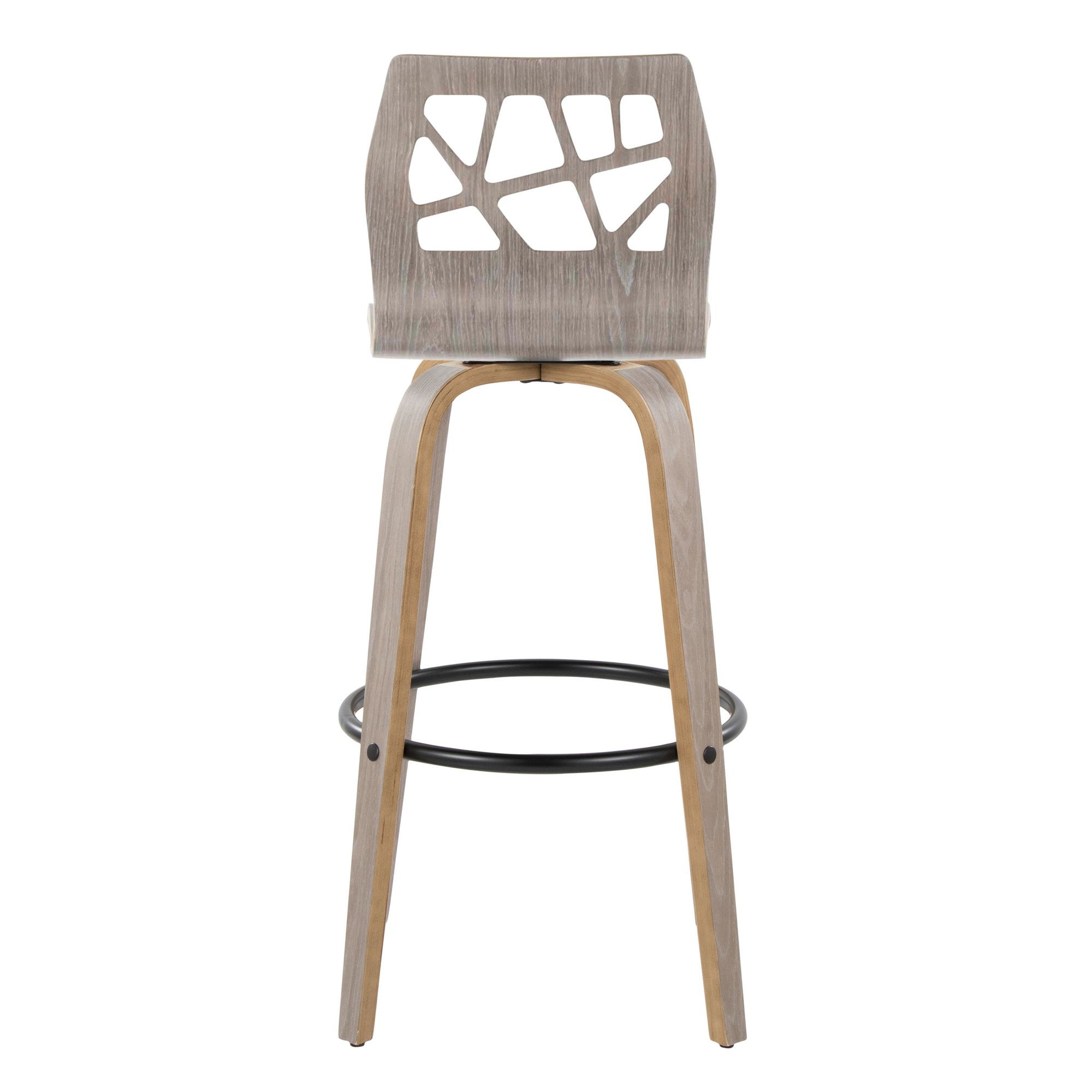 The Folia Light Grey Contemporary Swivel Barstool adds a touch of sophisticated style to any seating area. Its curved wood frame and cut-out backrest create a visually appealing design, while the upholstered, padded swivel seat ensures maximum comfort. Enjoy the convenience of a built-in footrest, making this stool both stylish and functional. Sold in pairs.