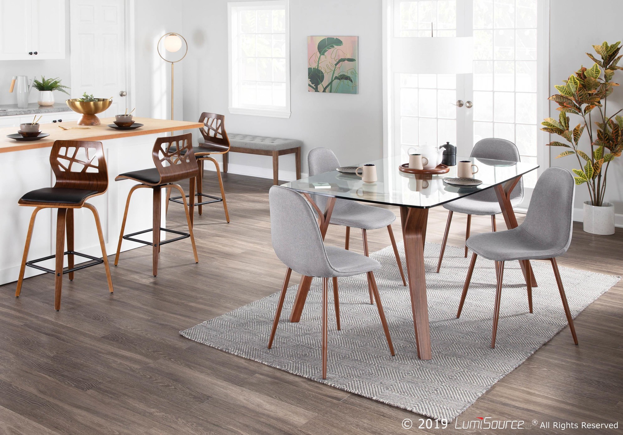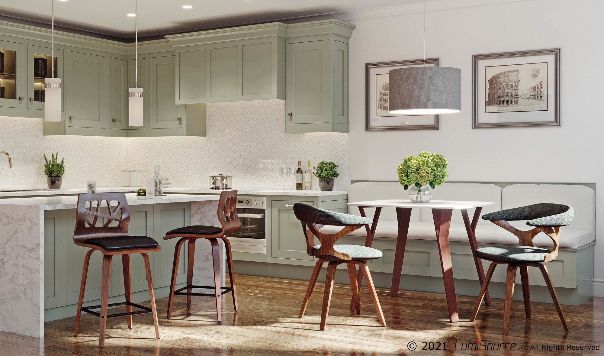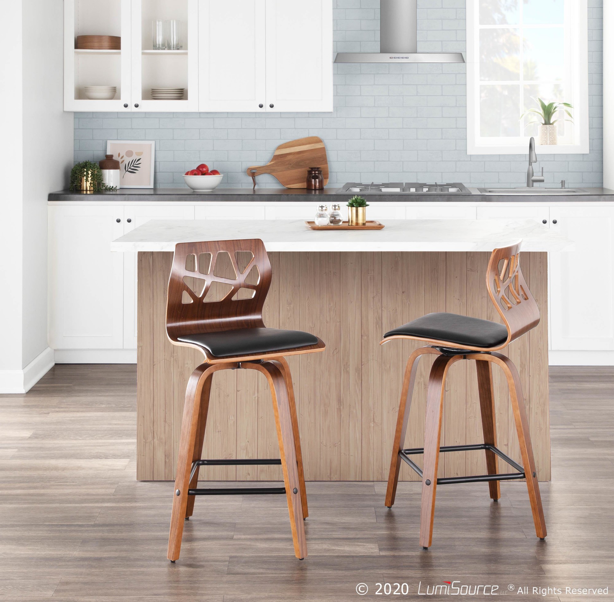 The Folia Counter Stools will infuse your counter area with a touch of mid-century modern style. These stools feature a curved wood frame with a distinctive cut-out backrest, offering both visual appeal and comfort. The upholstered, padded seat ensures a pleasant seating experience, while the built-in footrest adds extra support.