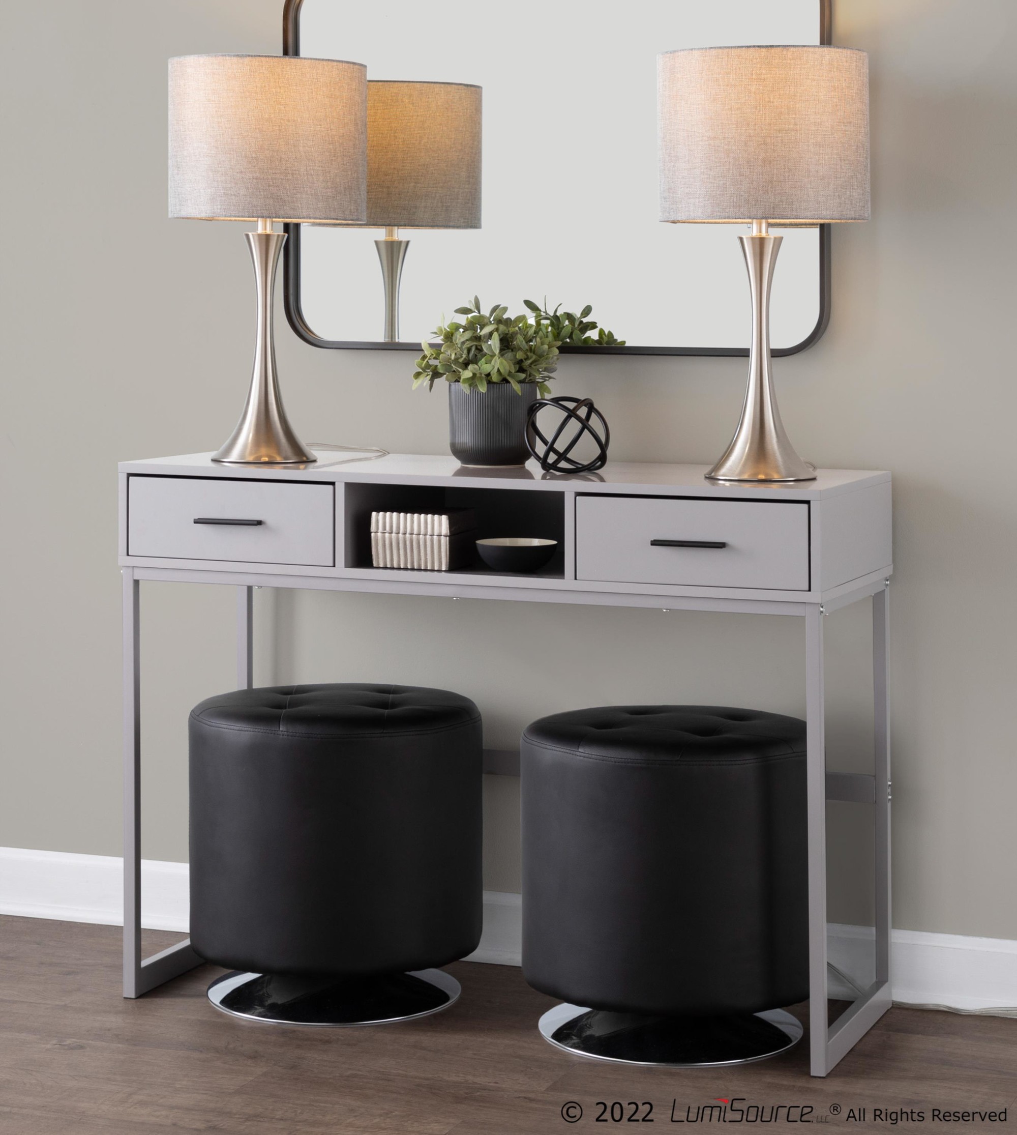 This console table is designed to be versatile, fitting seamlessly into various decor styles. The two drawers offer convenient storage for items you prefer to keep out of sight, while the open shelf is ideal for displaying decorative items or storing frequently used items. The sleek metal frame adds a touch of modern elegance, making it a functional and fashionable addition to your home.