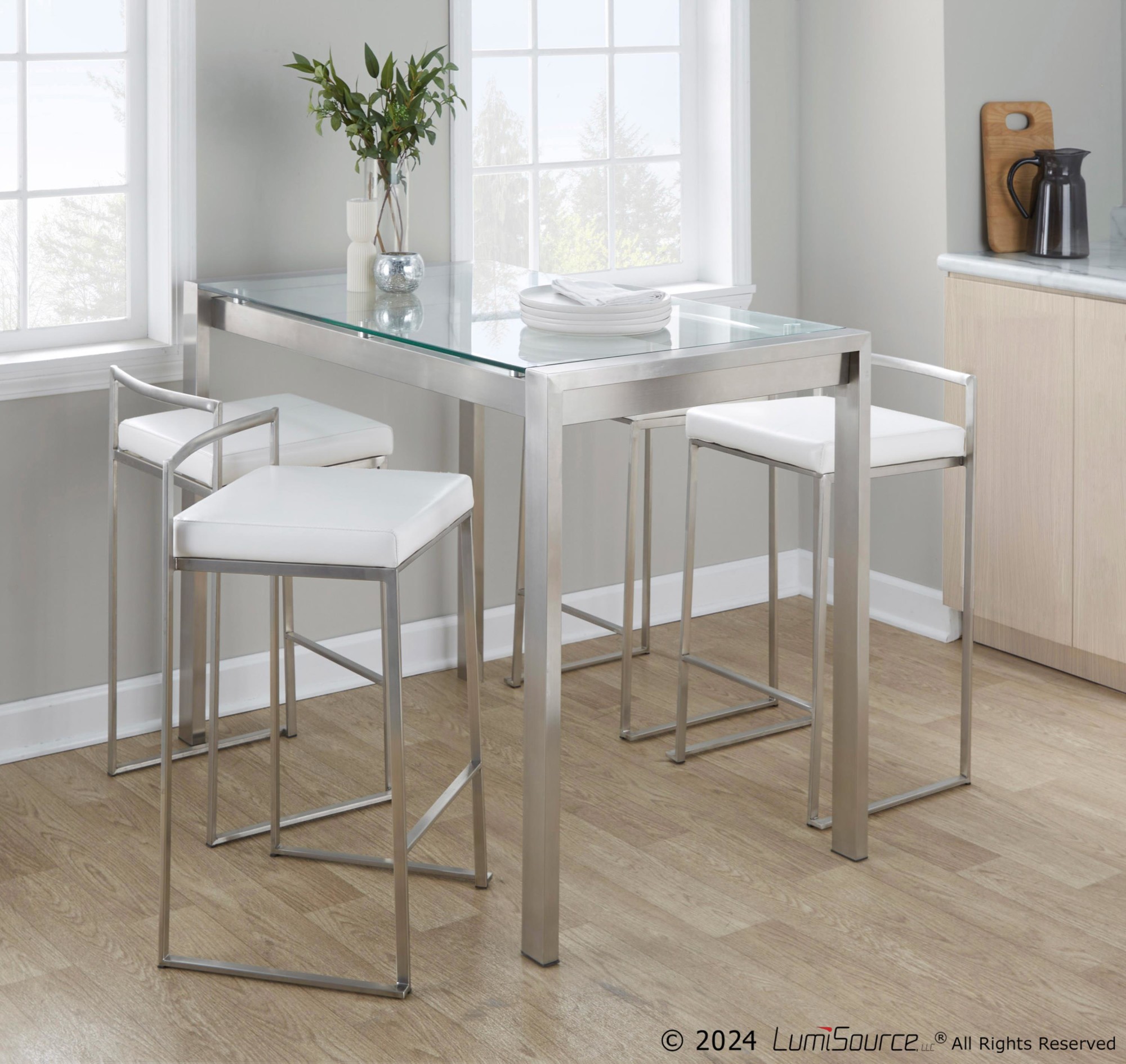 Upgrade your man cave with the Fuji 26″ Contemporary Counter Stools! This set of three stools offers contemporary styling and amazing comfort. The white faux leather upholstered padded seat ensures you and your buddies can sit and strategize for hours. The fully welded frame is not only durable but also features a stackable design for easy storage when the guys aren’t around. The fixed counter height is perfect for your bar or high-top table. Perfect for smaller spaces, these stools blend style and function seamlessly. Material: PU Leather, Foam, Brushed Stainless Steel. Dimensions: 16″L x 17.5″W x 31″H. Seat Height: 27.75″. Weight Limit: 250 lbs (each). Assembly Required: Yes.