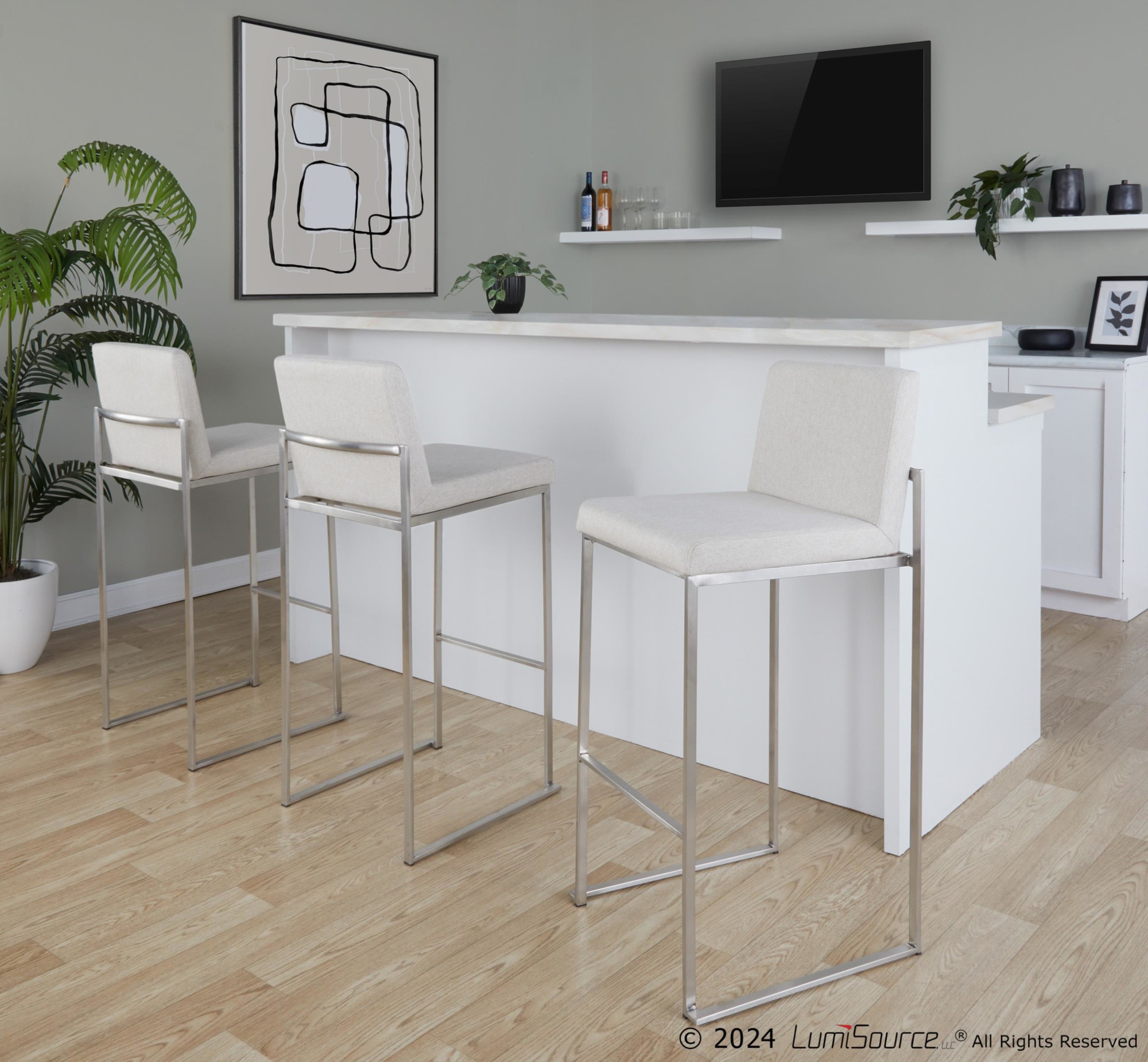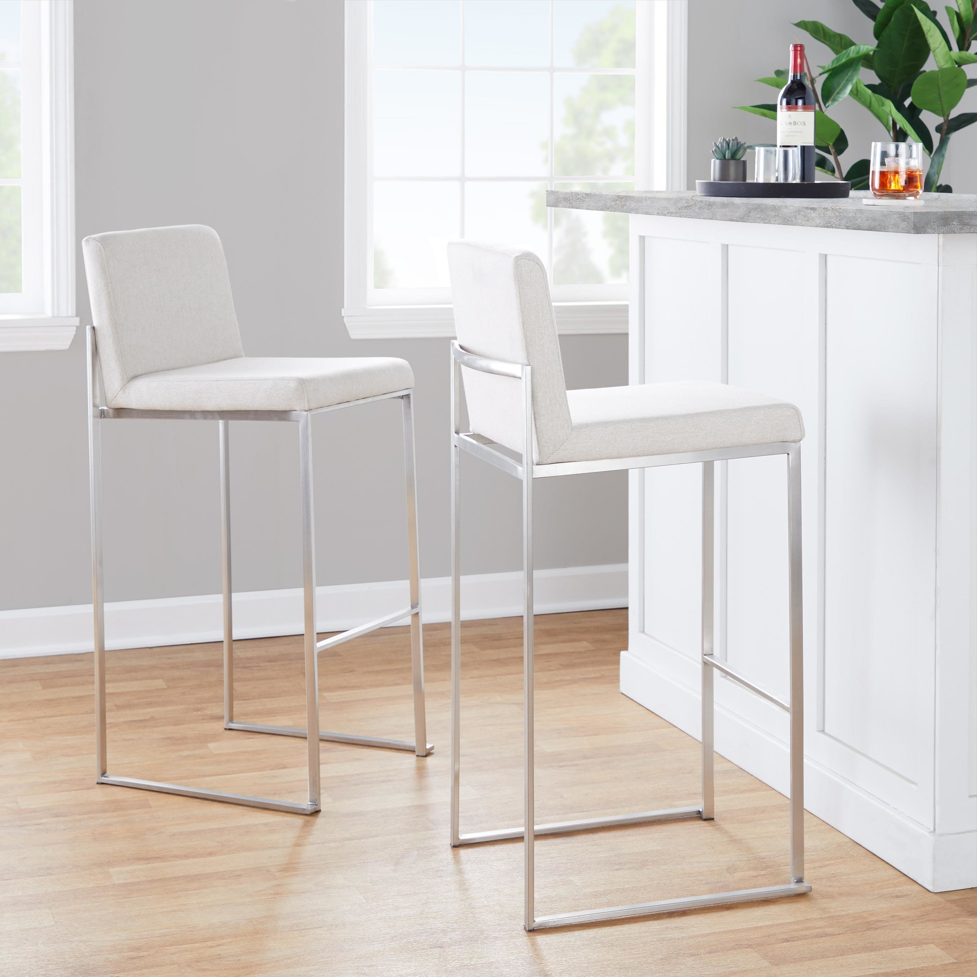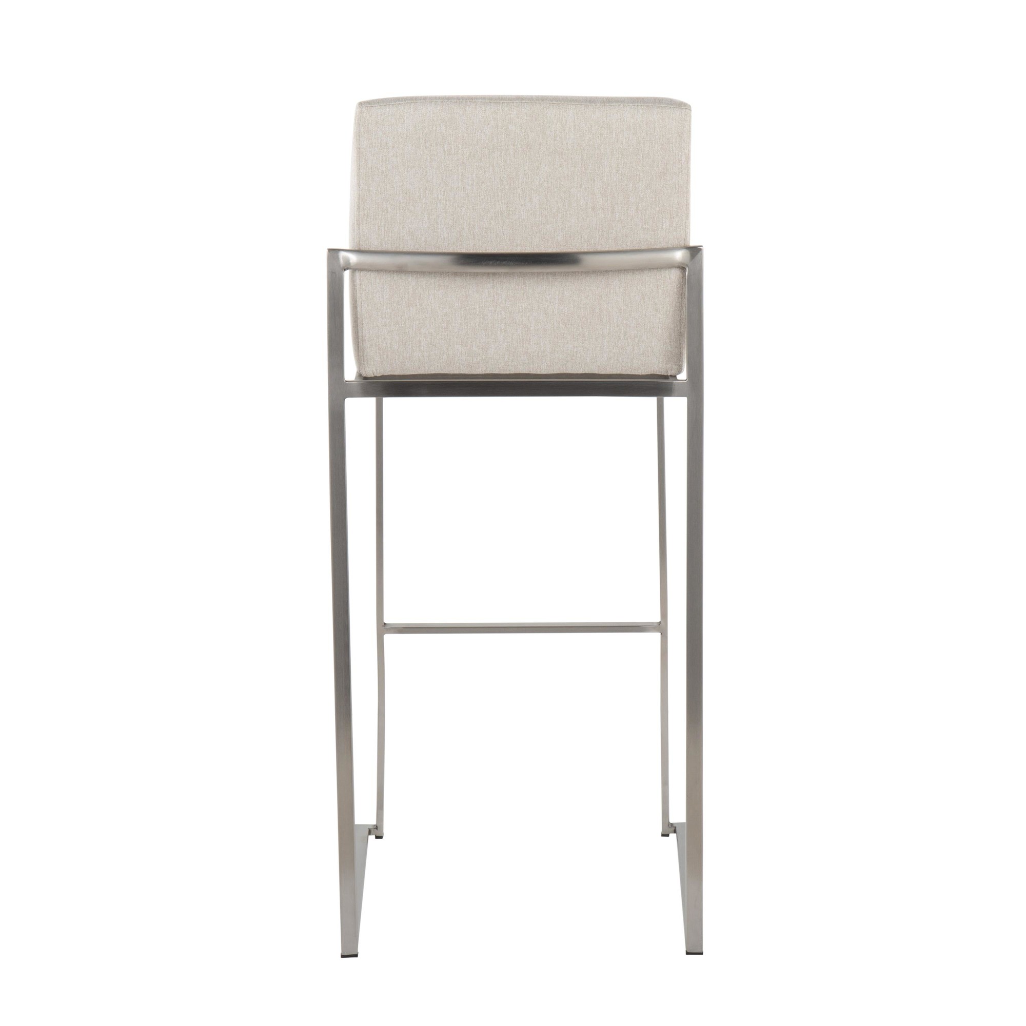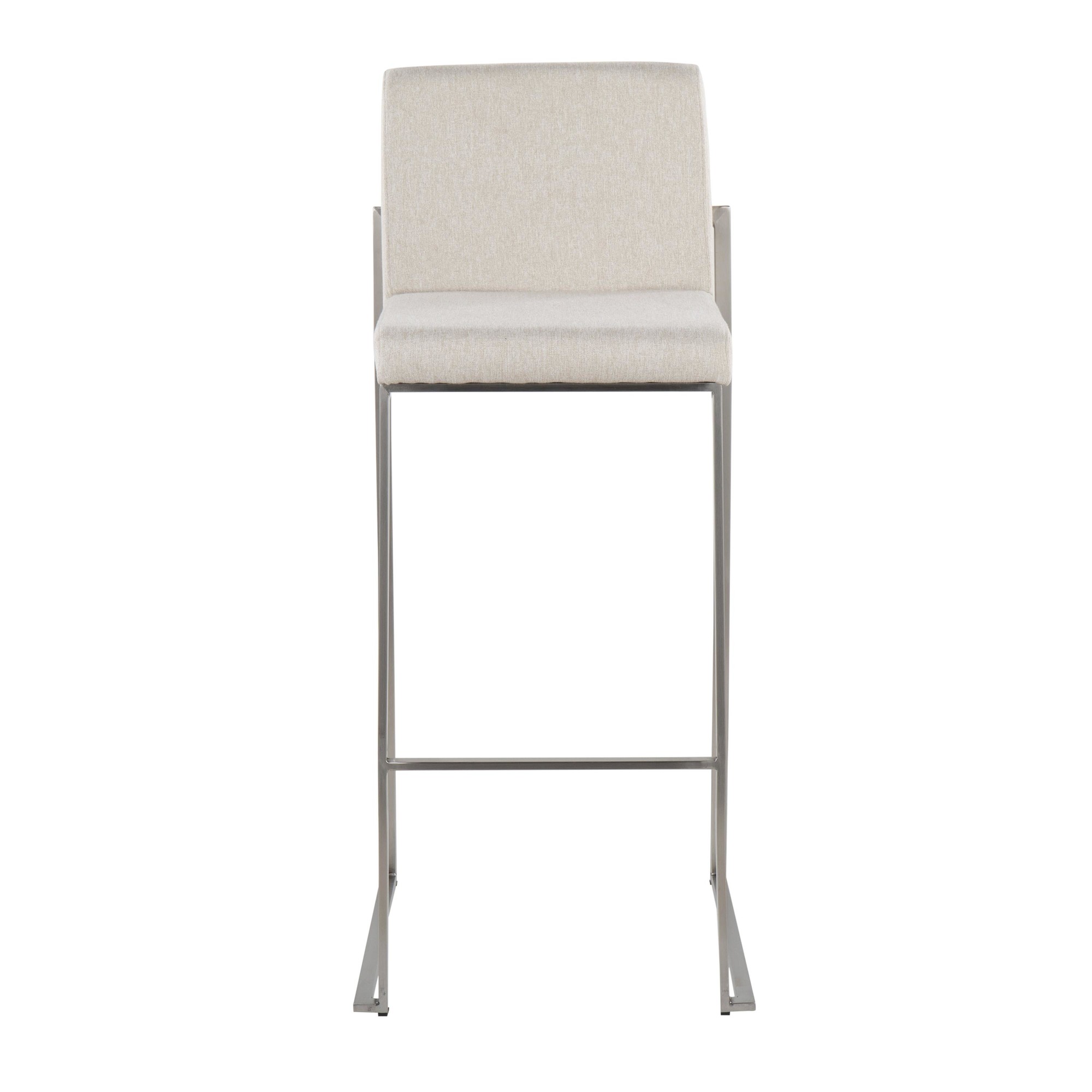 The Fuji 30-Inch Contemporary Beige Fabric High Back Barstool offers modern elegance, making it a superb addition to any bar or counter area. This barstool features a comfortable, extra-wide upholstered seat and a high, padded backrest, ensuring a luxurious seating experience. The stylish metal frame complements the sleek upholstery, creating a contemporary aesthetic. Sold as a set of three.