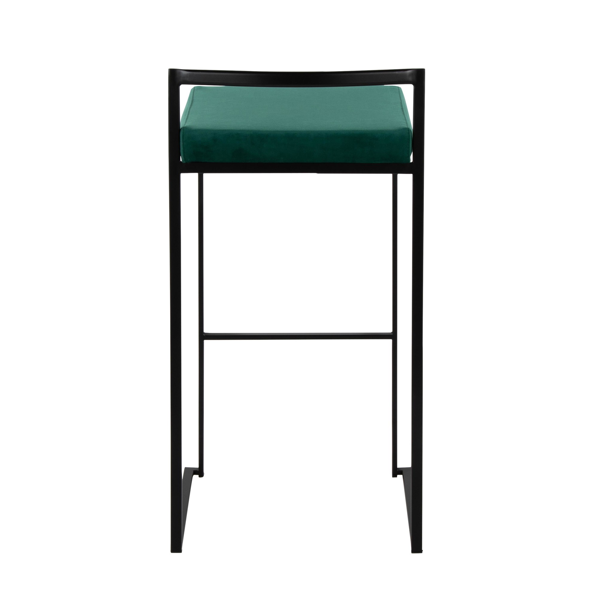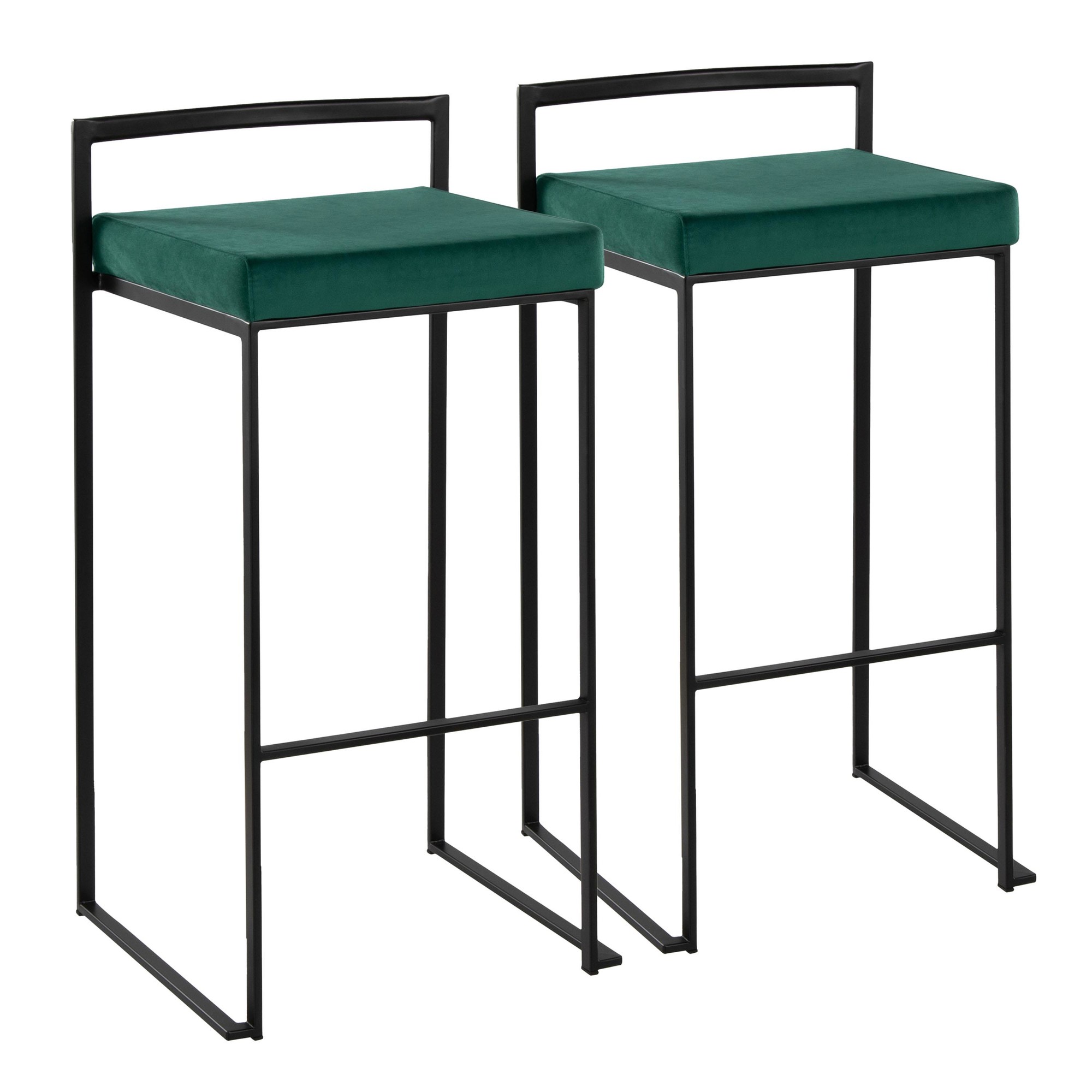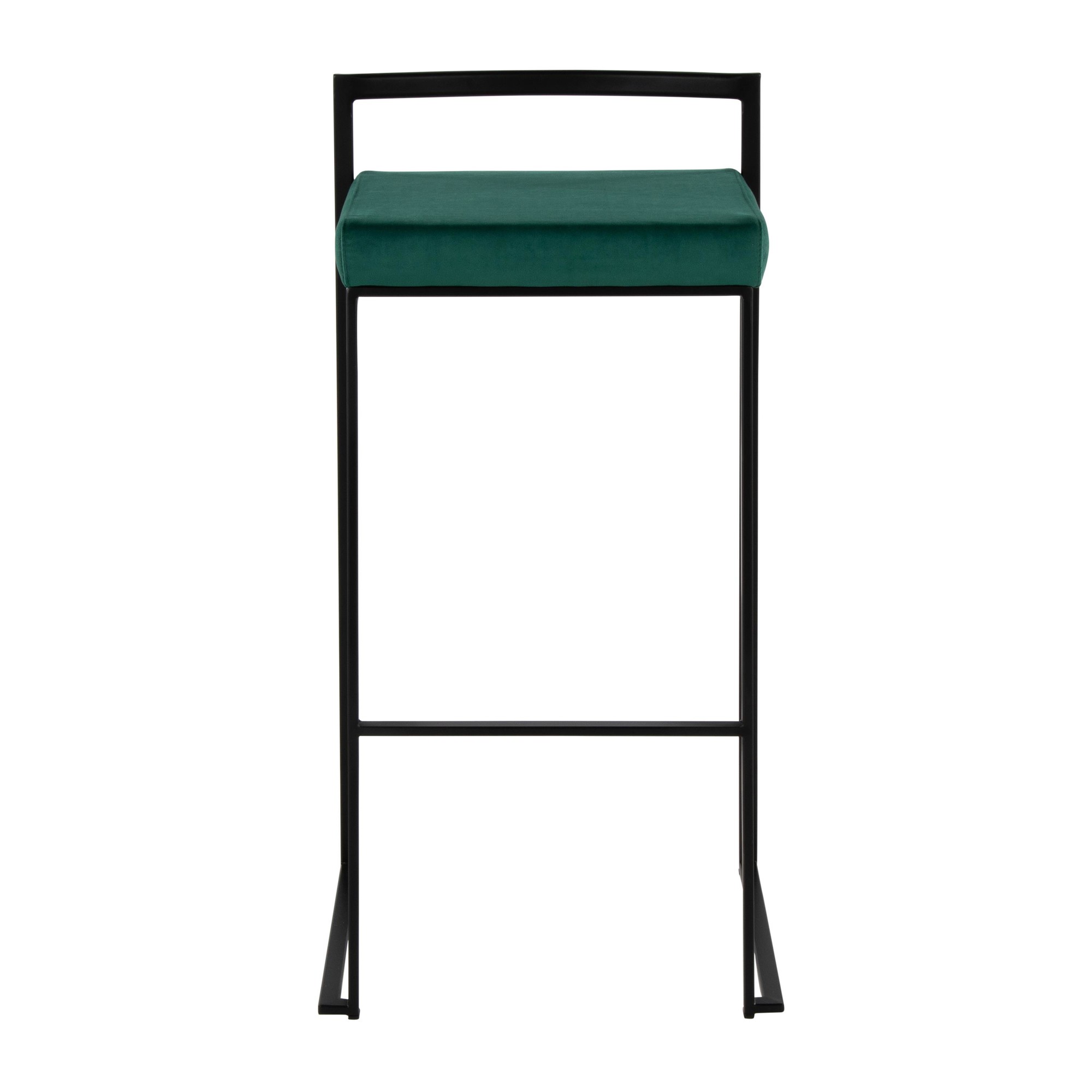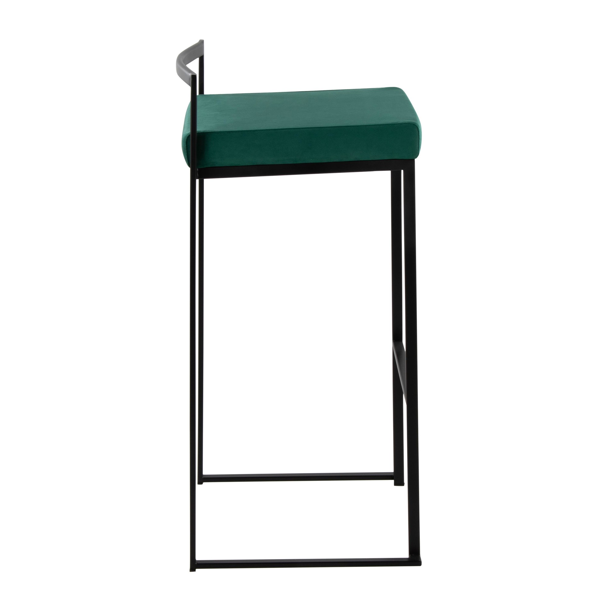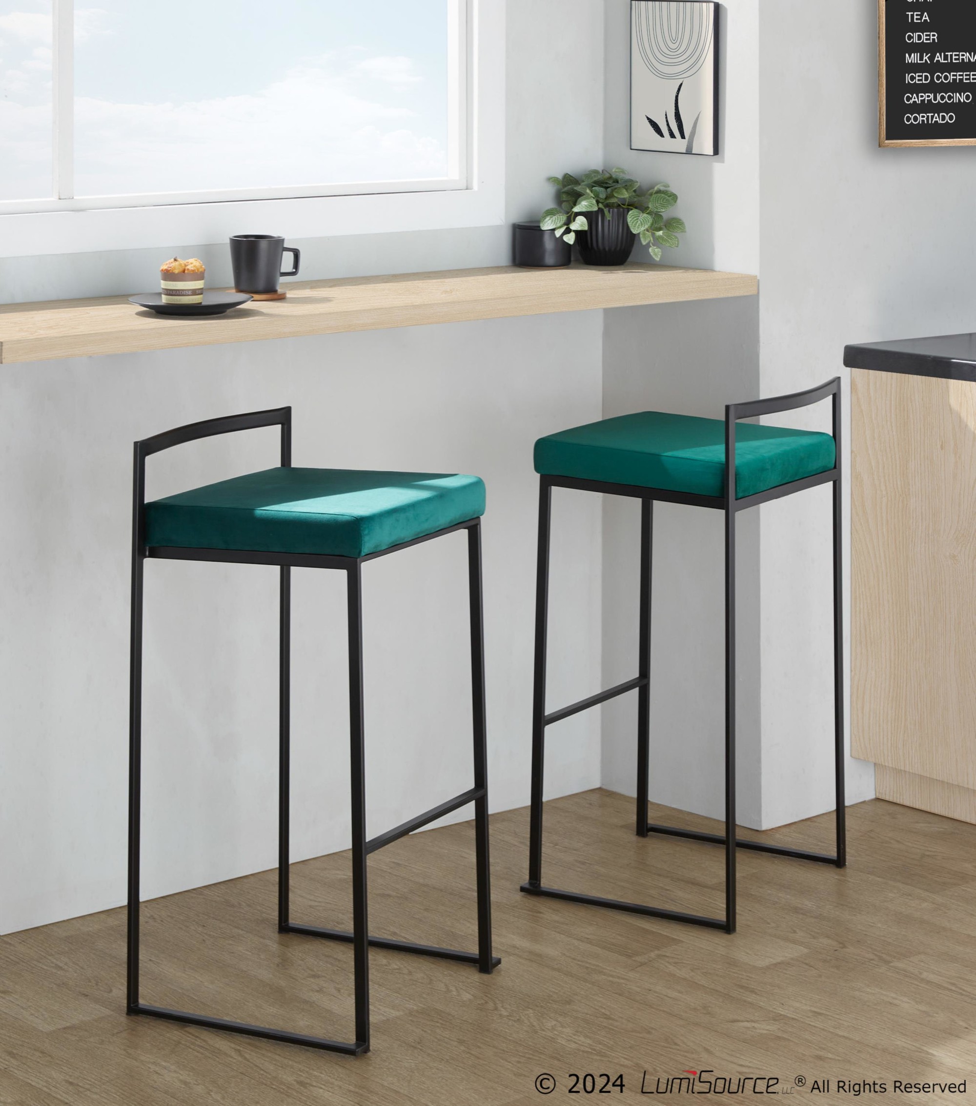 The Fuji Black Metal Green Velvet Contemporary Stackable Barstools offer a blend of simple elegance and astonishing comfort. These barstools feature a lightweight, fully assembled frame and backrest, complemented by a thick, padded seat cushion. The stackable design allows for easy storage, making them ideal for entertaining. Their stylishness ensures they will match any decor.