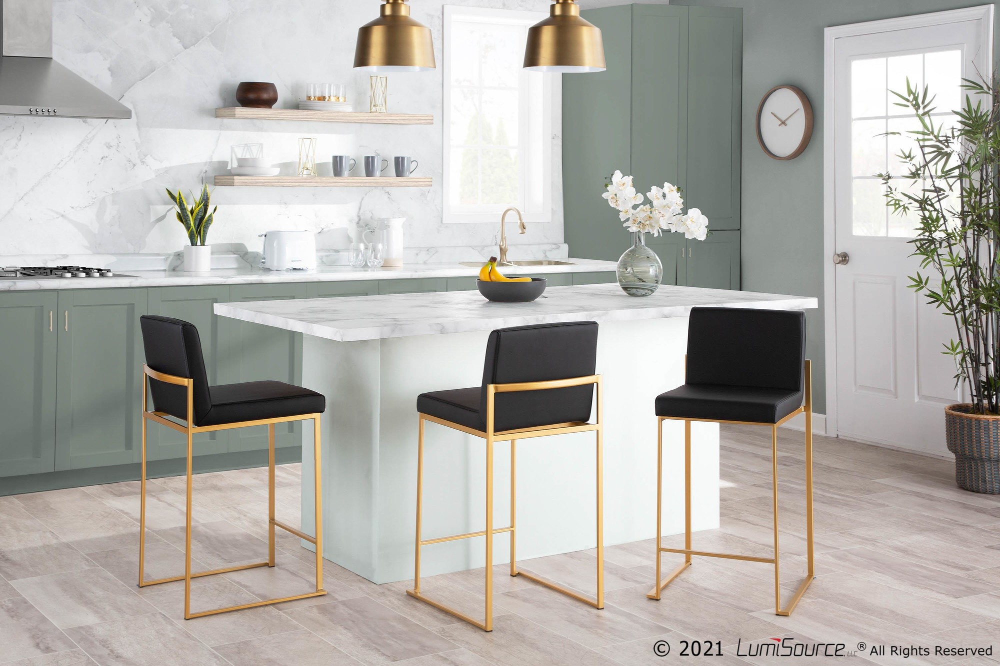 The Fuji High Back Counter Stool offers modern elegance, featuring an extra-wide and comfortable upholstered seat, a high padded backrest, and a stylish metal frame. This contemporary counter stool is the perfect addition to your space, providing both comfort and style.