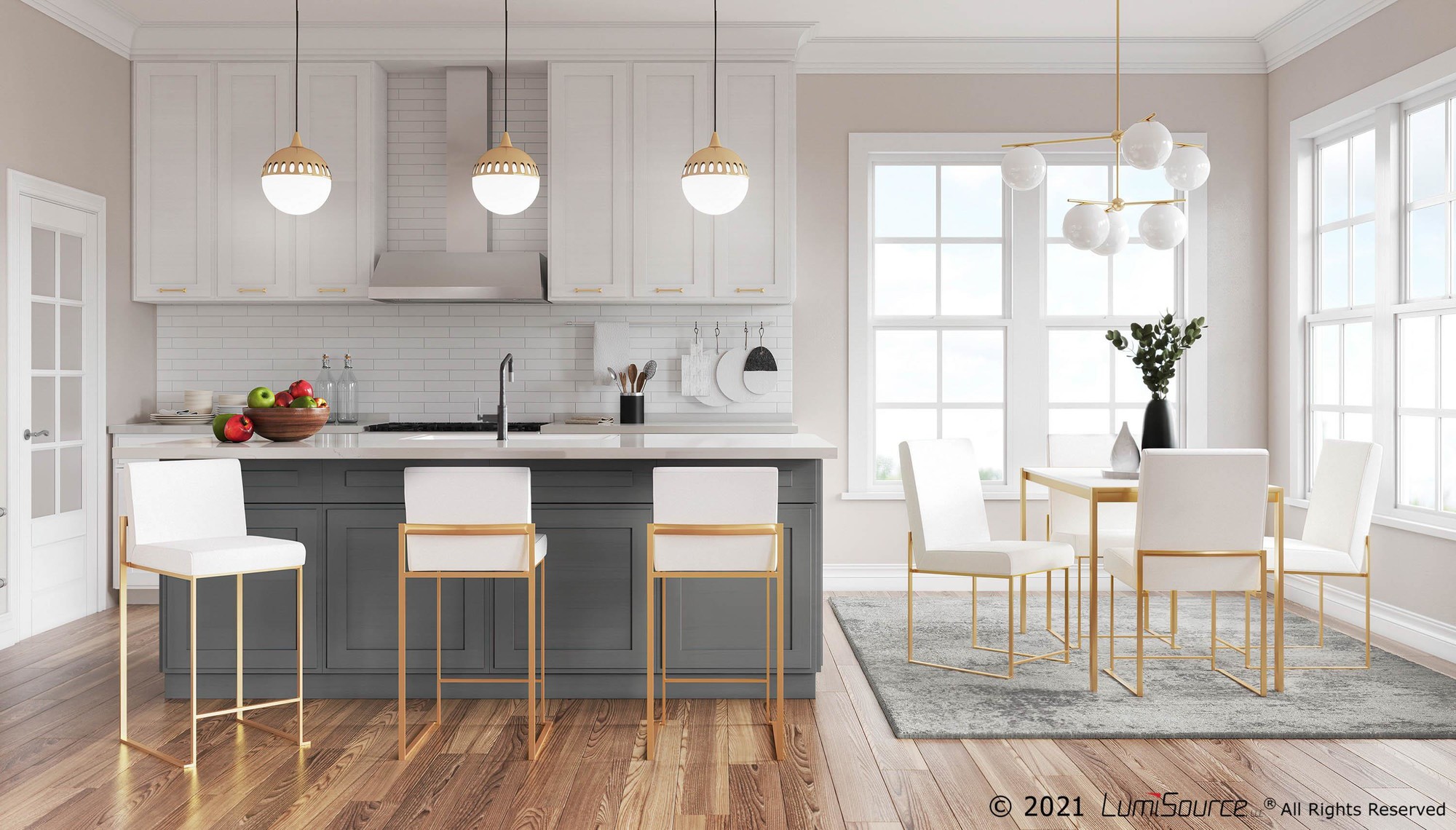 Experience simple elegance and astonishing comfort with the Fuji High Back Counter Stool. This contemporary counter stool features an extra-wide upholstered seat for maximum comfort, a high padded backrest for excellent support, and a stylish gold metal frame that adds a touch of modern sophistication to any space. Available in sleek white faux leather upholstery, the Fuji is the perfect addition to your kitchen island or counter area.
