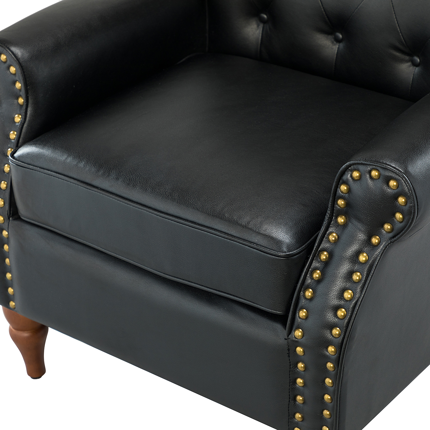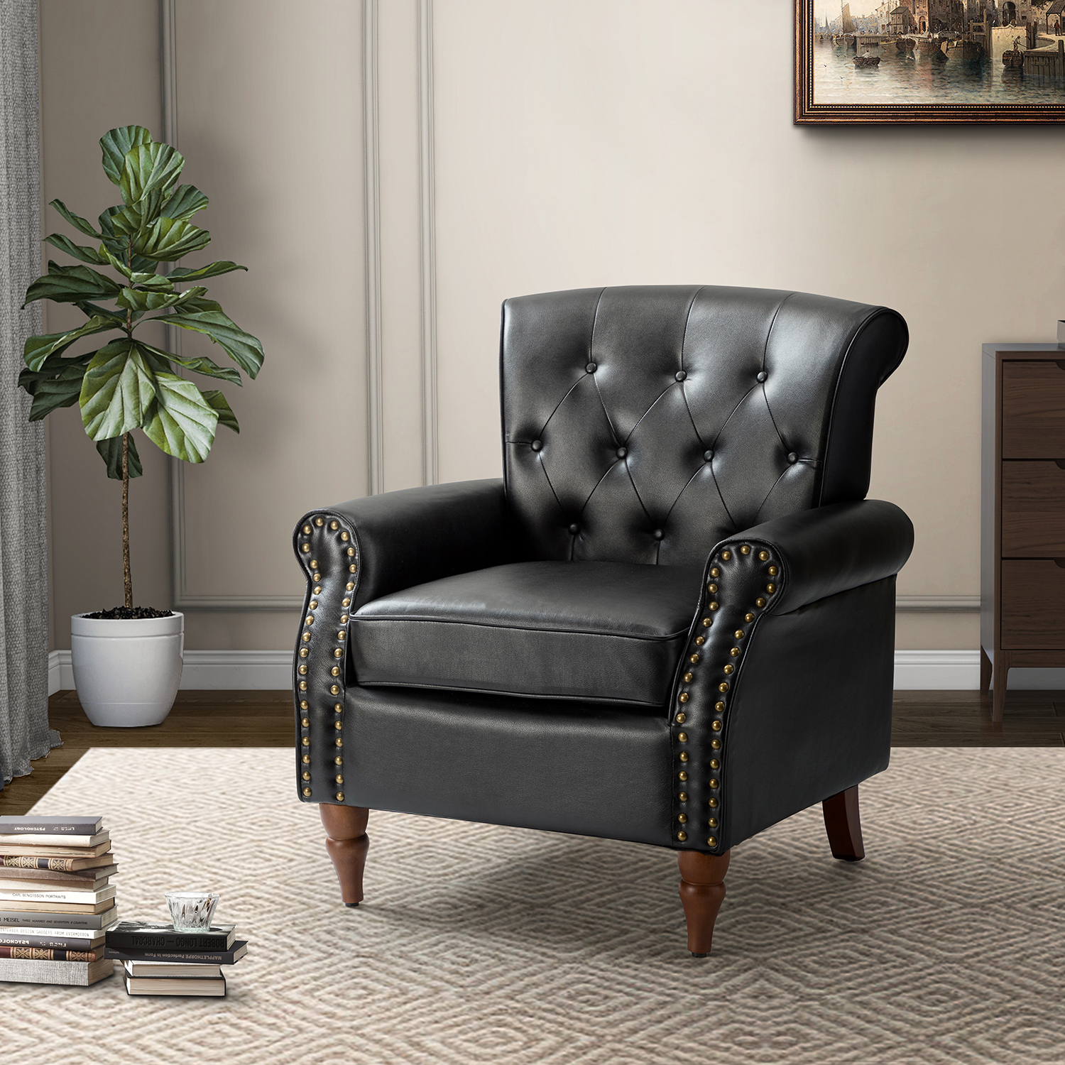 This armchair is a welcome addition to any home, offering a comfortable spot to relax after a long day. Its inviting transitional style will complement your décor. The manufactured wood frame provides stability and durability, ensuring this design will be a part of your home for years to come. The built-in S-spring, wrapped in textured vegan leather, adds extra comfort and distributes pressure when you sit. The cushioned back features deep button tufting, and the set-back arms are detailed with nailheads. This armchair makes a great addition to the living room, whether as a single accent piece or in pairs.