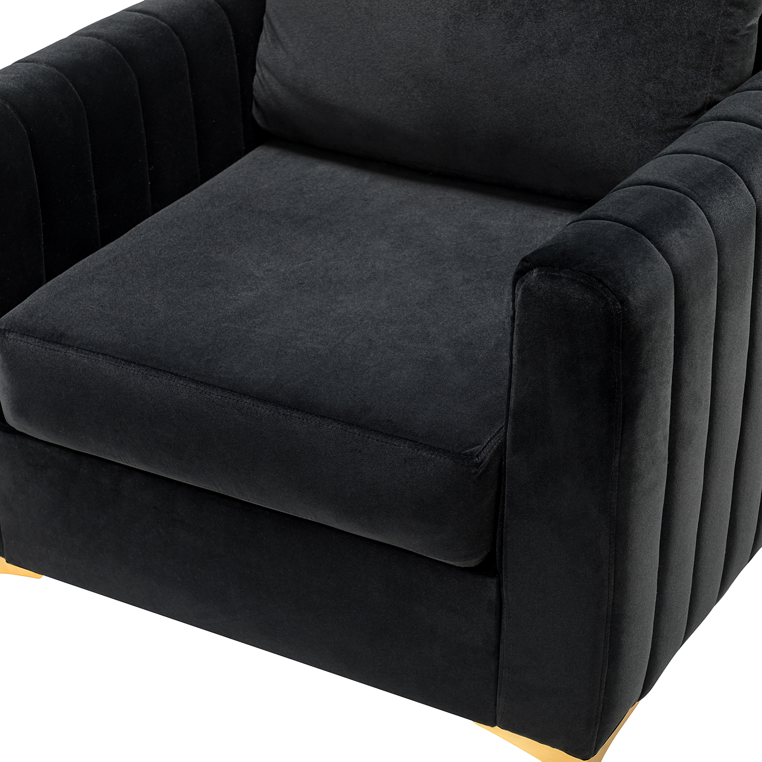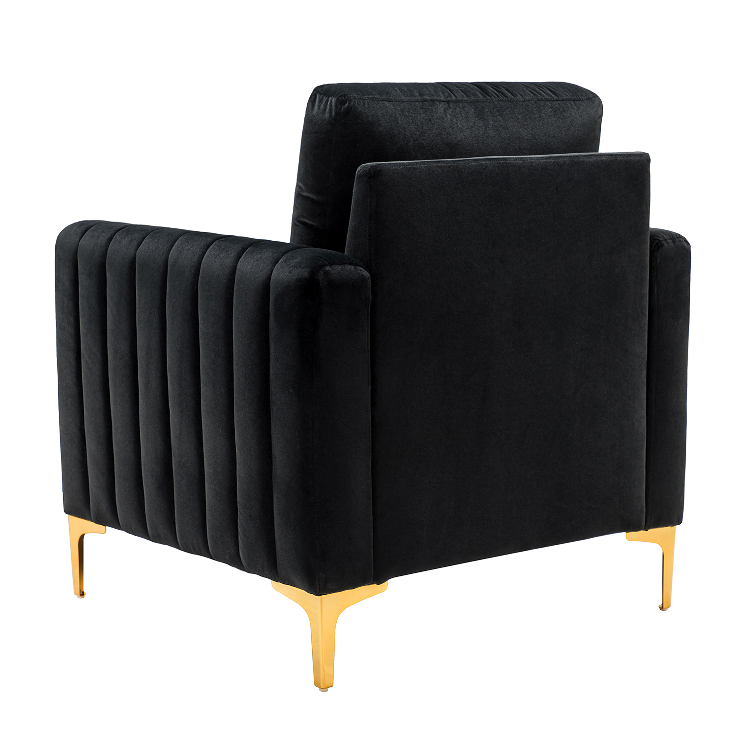 Elevate your living room with the Ganymedes Black Velvet Glam Tufted Accent Chair! This modern chair is more than just a seat; it’s a statement piece. The rich velvet upholstery and eye-catching hue bring a pop of sophisticated style to any space. Vertical channel tufting and golden metal legs add depth, making this glamour chair the effortless focal point of your living room.