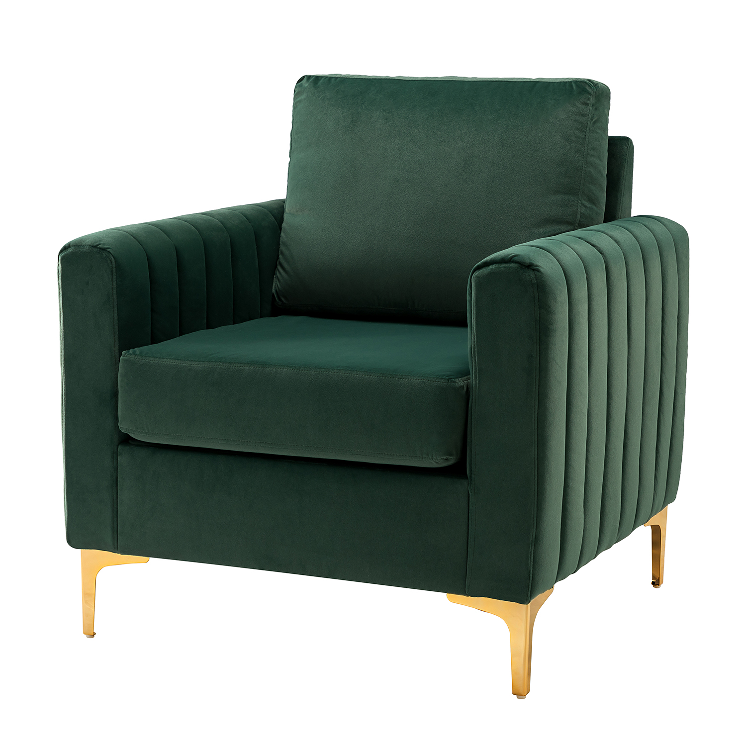 The Ganymedes Green Velvet Tufted Glam Accent Club Chair is the perfect way to inject sophisticated style into your living space! This modern chair features eye-catching velvet upholstery in a rich green hue, sure to make a statement. The vertical channel tufting and golden metal legs add depth and glamour, effortlessly transforming this chair into the focal point of any room.