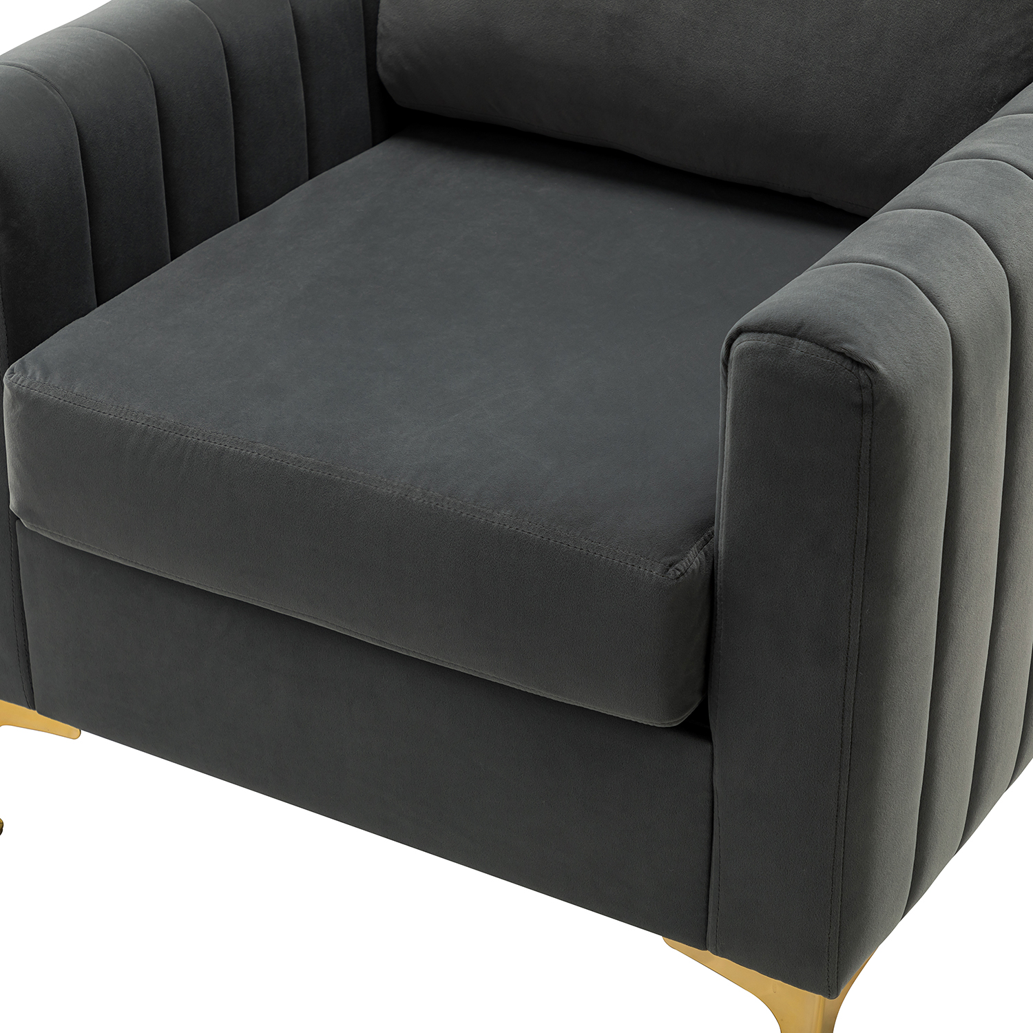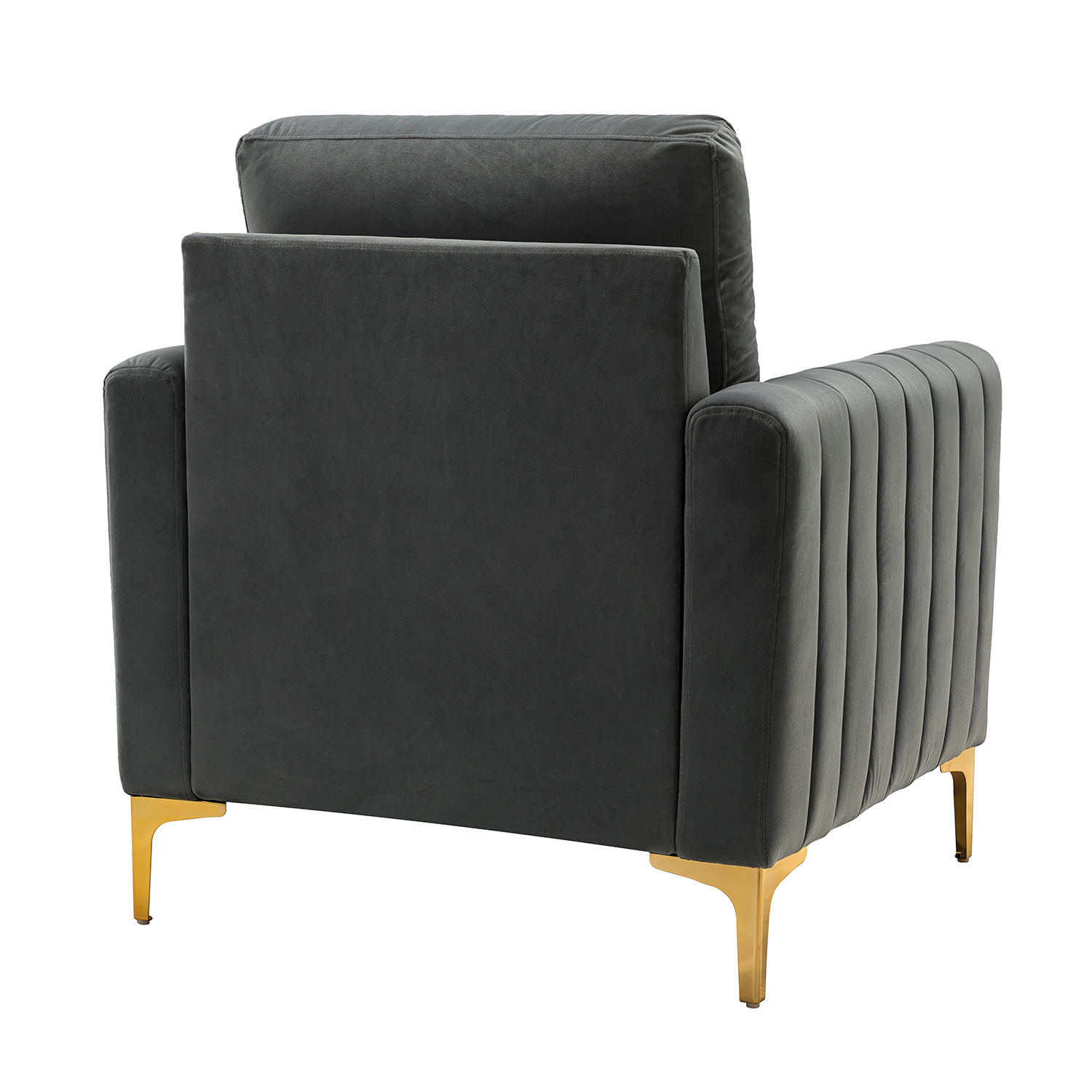 Bring a touch of glam to your living room with this modern accent chair. Its velvet upholstery and rich color make it a sophisticated focal point. The vertical channel tufting and golden metal legs add depth and visual interest. This chair features a sturdy wood frame and soft filling, creating an inviting and comfortable seating experience. Versatile and elegant, this piece complements a variety of decor styles in your living room, lounge, or home office, adding a subtle touch of glamour.