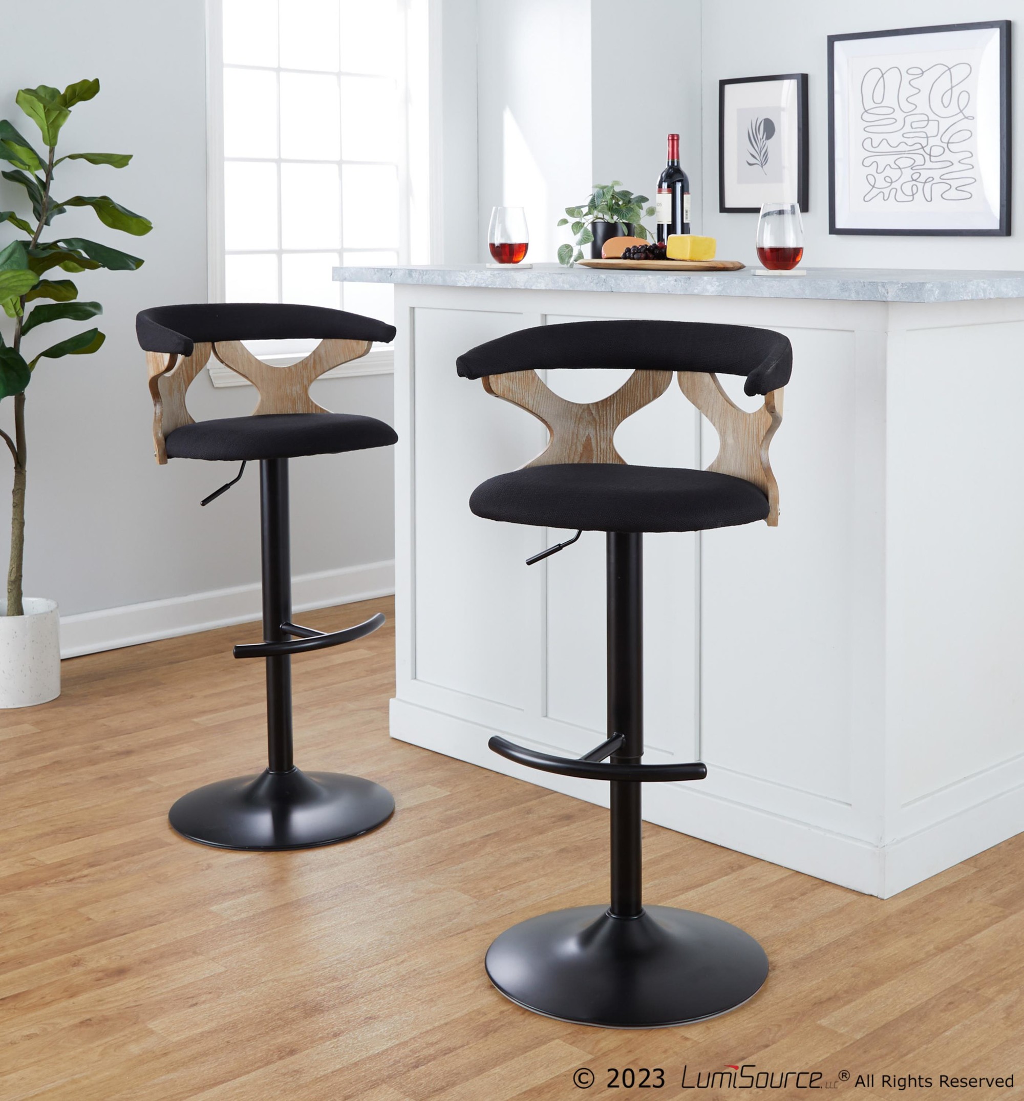 Upgrade your man cave with the Gardenia Charcoal Fabric Whitewashed Wood Contemporary Swivel Barstools! These barstools are sold in pairs and add a modern touch to your bar area. The unique cut-out back design adds visual appeal, while the rounded back and padded upholstery provide comfort. The adjustable height and 360-degree swivel offer practical functionality. It has a black metal base with a rounded T footrest. The materials include polyester fabric, foam, metal, and bent wood. Dimensions: 19.25″L x 20.75″W x 33.25-42.25″H. These barstools require assembly, are for indoor use only, and each has a 250 lbs. weight limit.