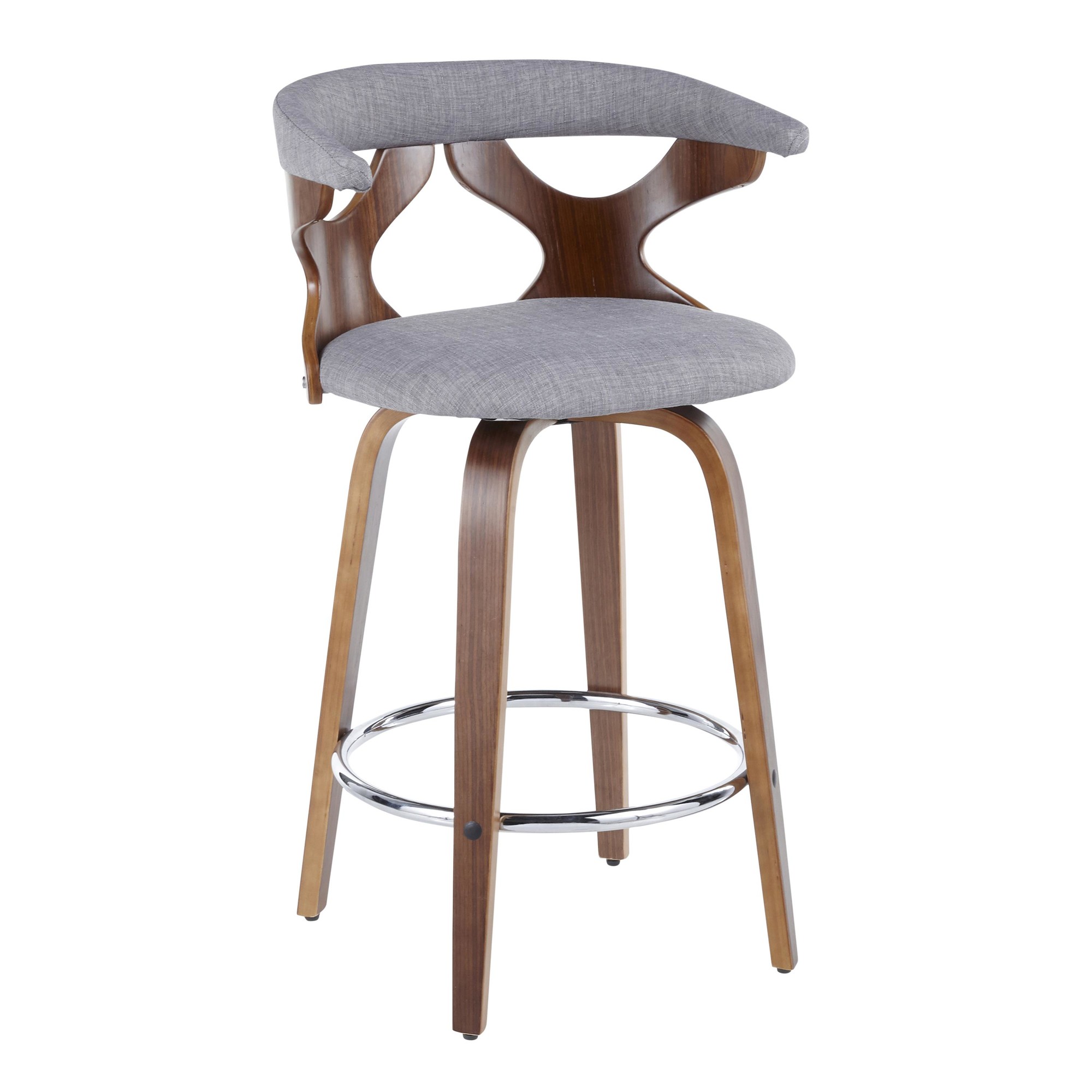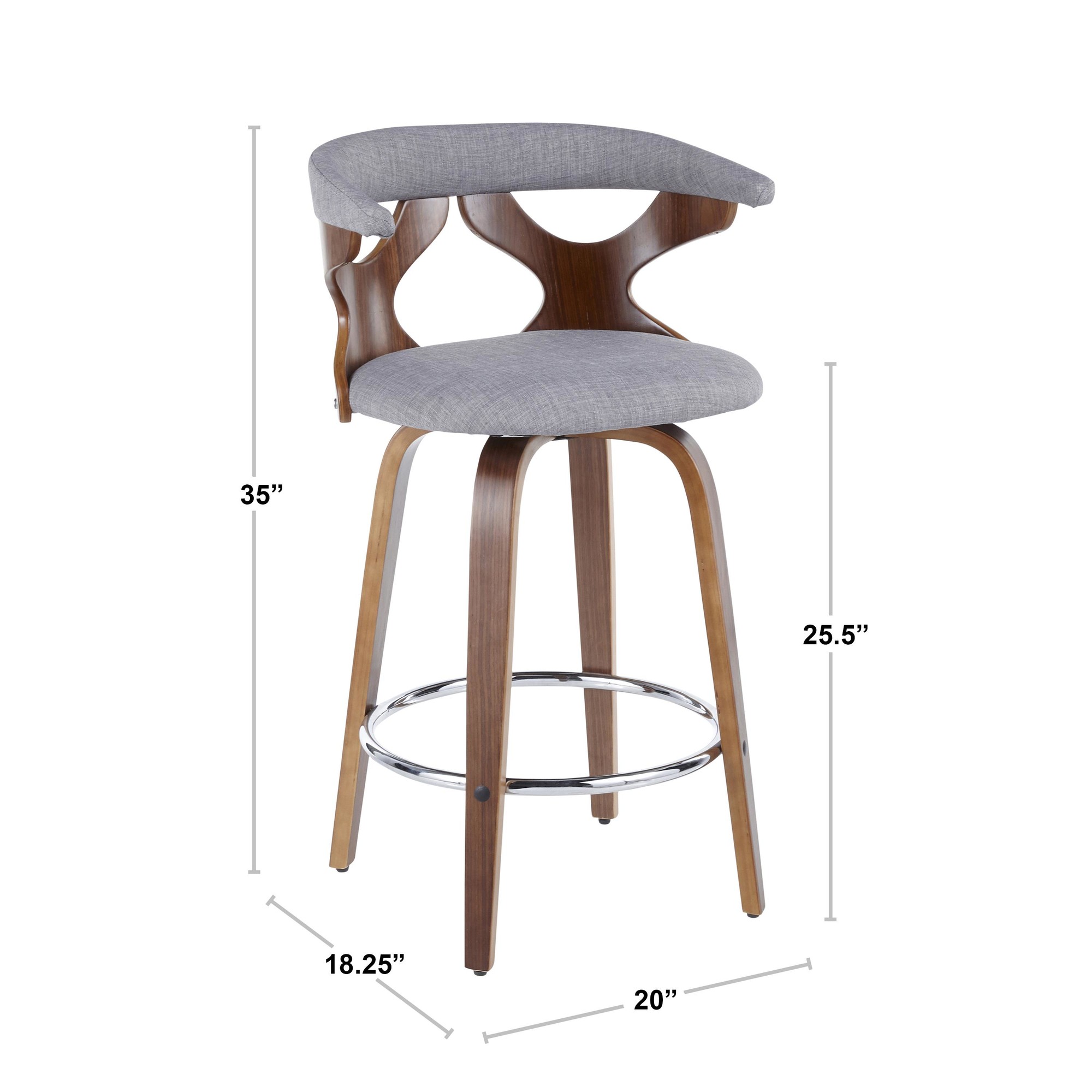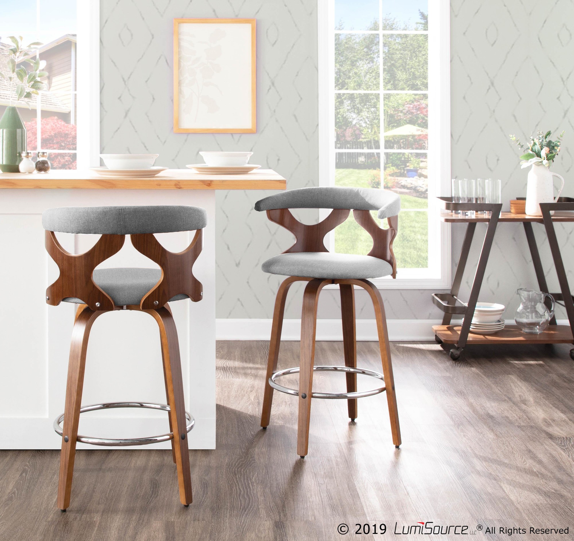 The Gardenia Mid-Century Modern Walnut and Light Grey Counter Stools add a touch of sophisticated style to your counter or bar area. The unique cut-out back design provides visual interest, while the rounded back offers comfortable support. The woven fabric upholstery gives these stools a refined look. Sold in pairs, these counter stools will enhance your seating experience.