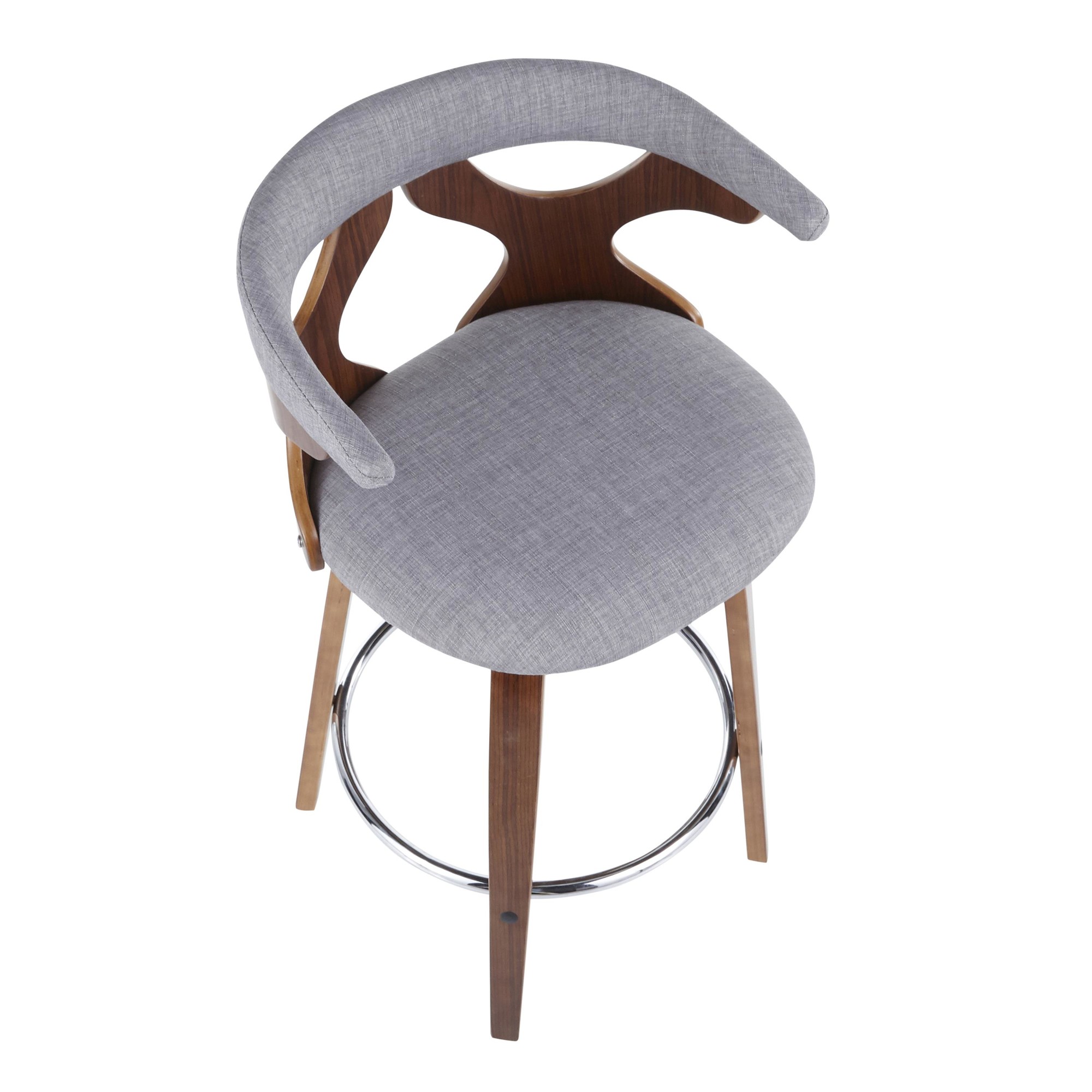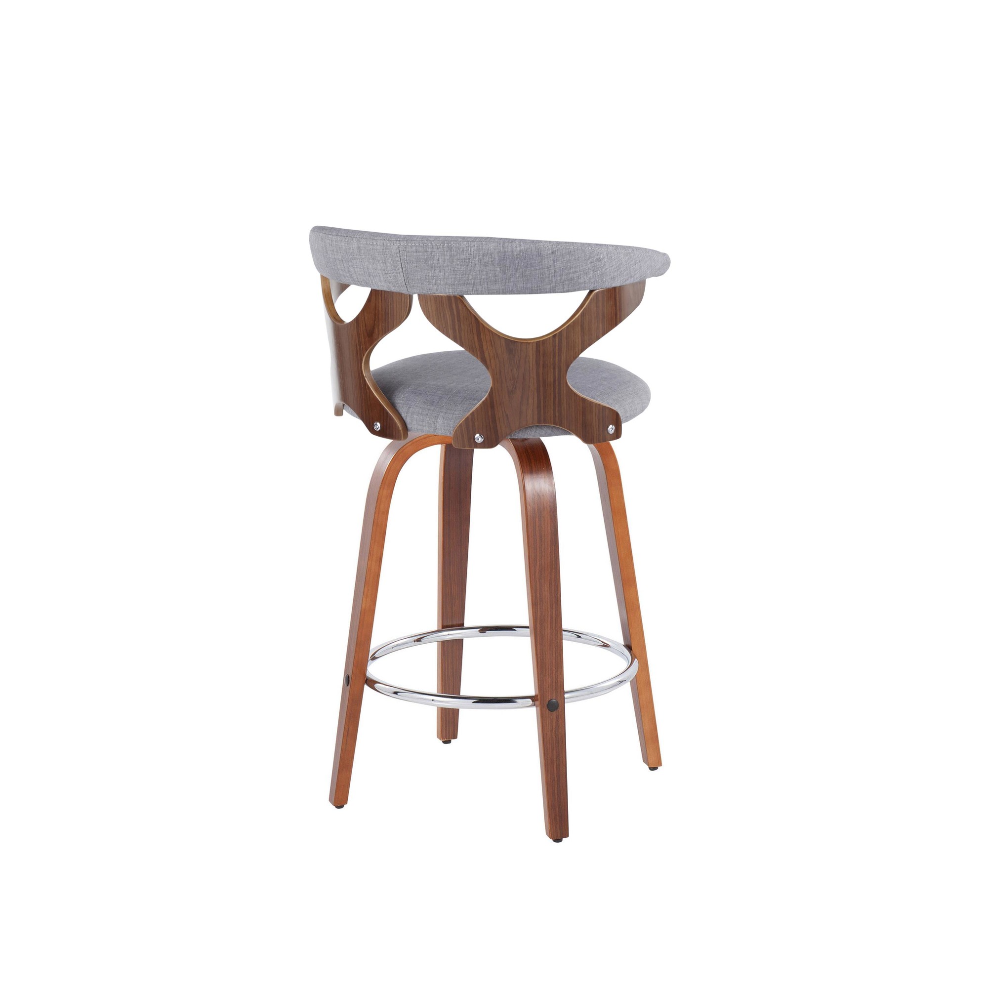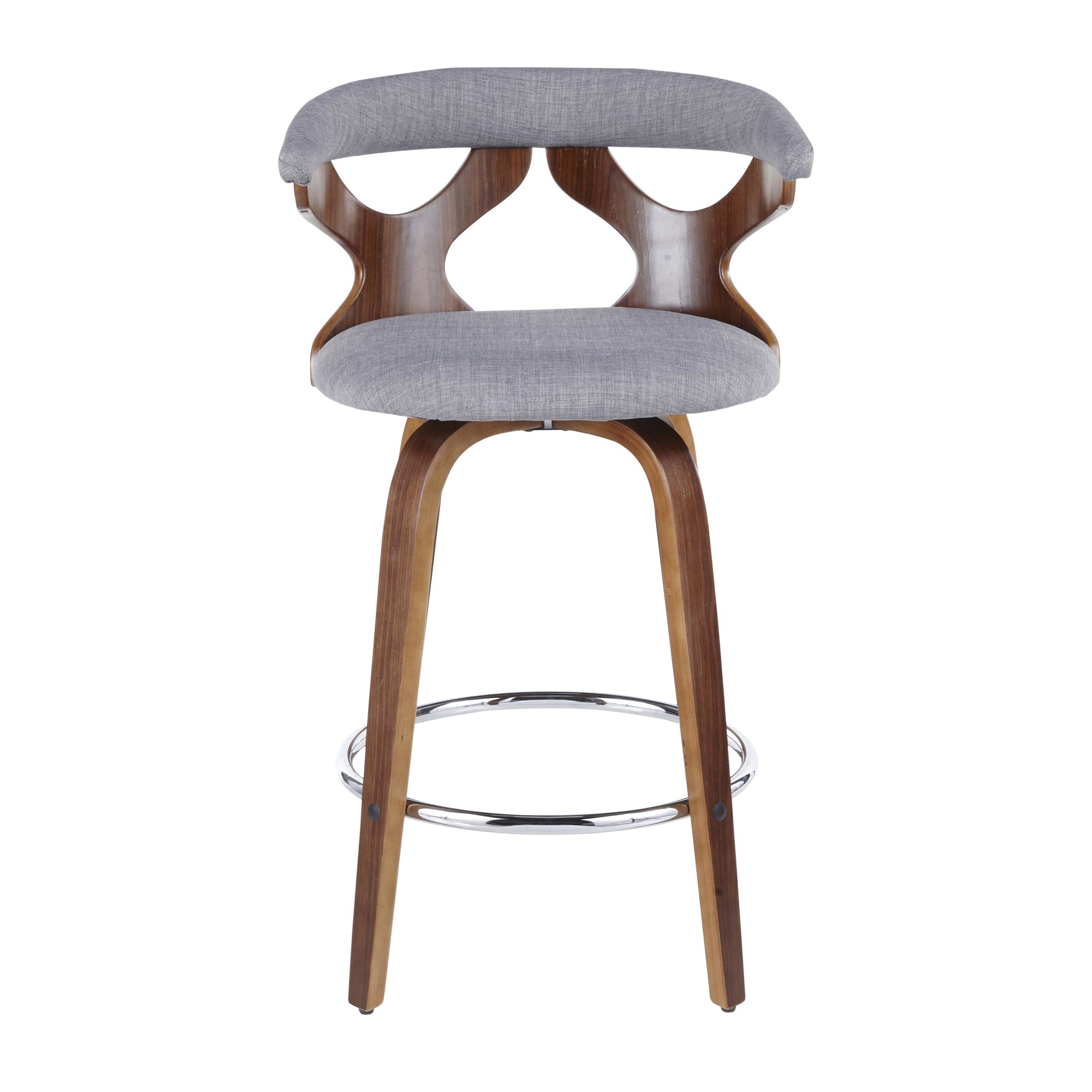 The Gardenia Mid-Century Modern Walnut and Light Grey Counter Stools add a touch of sophisticated style to your counter or bar area. The unique cut-out back design provides visual interest, while the rounded back offers comfortable support. The woven fabric upholstery gives these stools a refined look. Sold in pairs, these counter stools will enhance your seating experience.