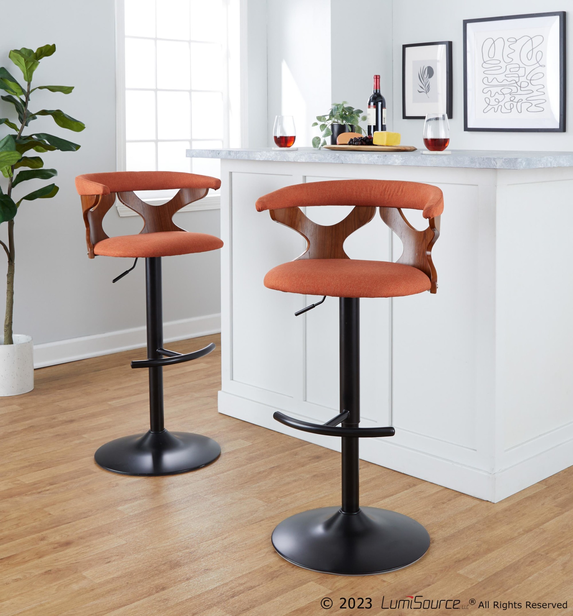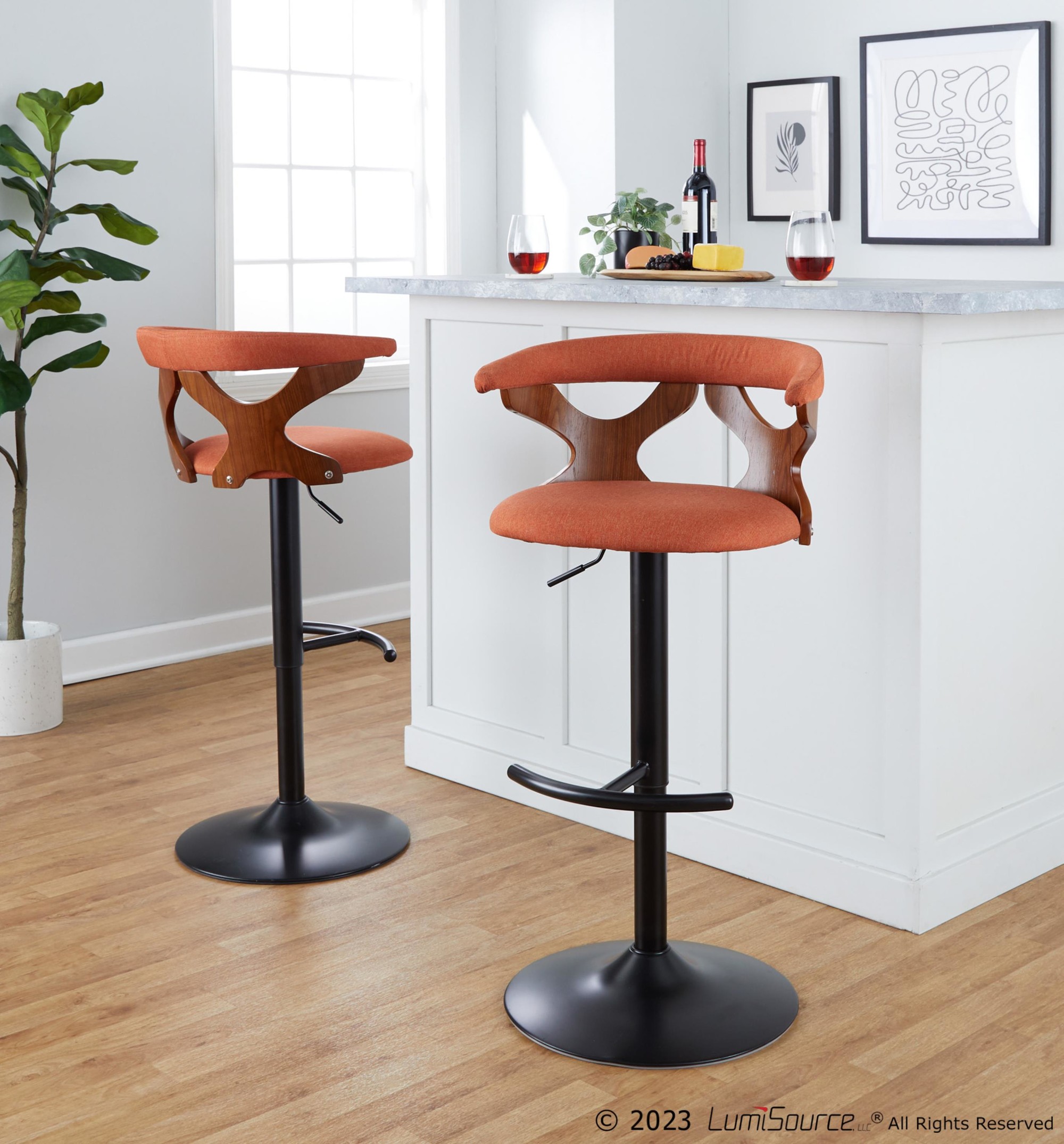 The Gardenia Adjustable Barstools bring a touch of contemporary style to your space! The unique cut-out design on the back adds visual interest, while the orange fabric and black walnut finish create a striking contrast. Enjoy comfortable seating with the rounded back and padded upholstery. The full-motion swivel provides a practical and functional feature. These barstools are sold in pairs.