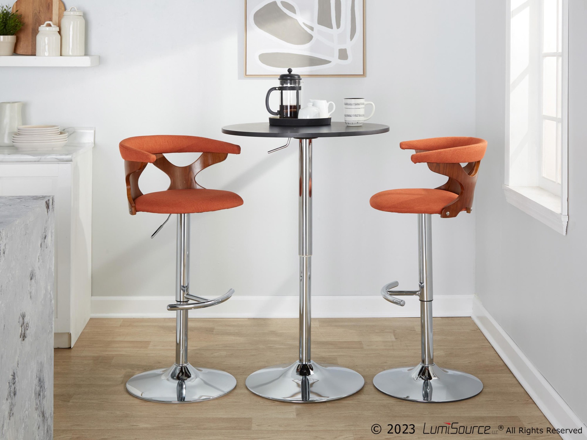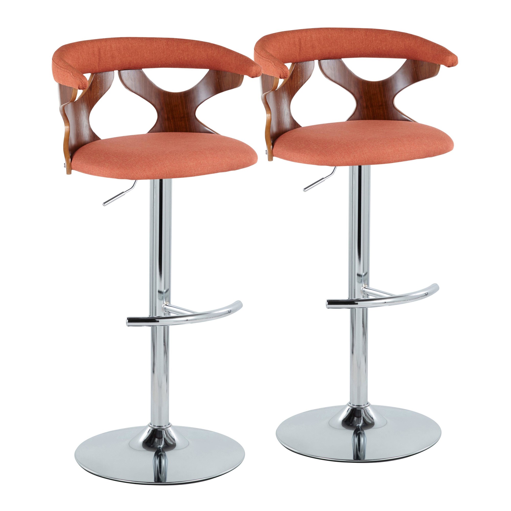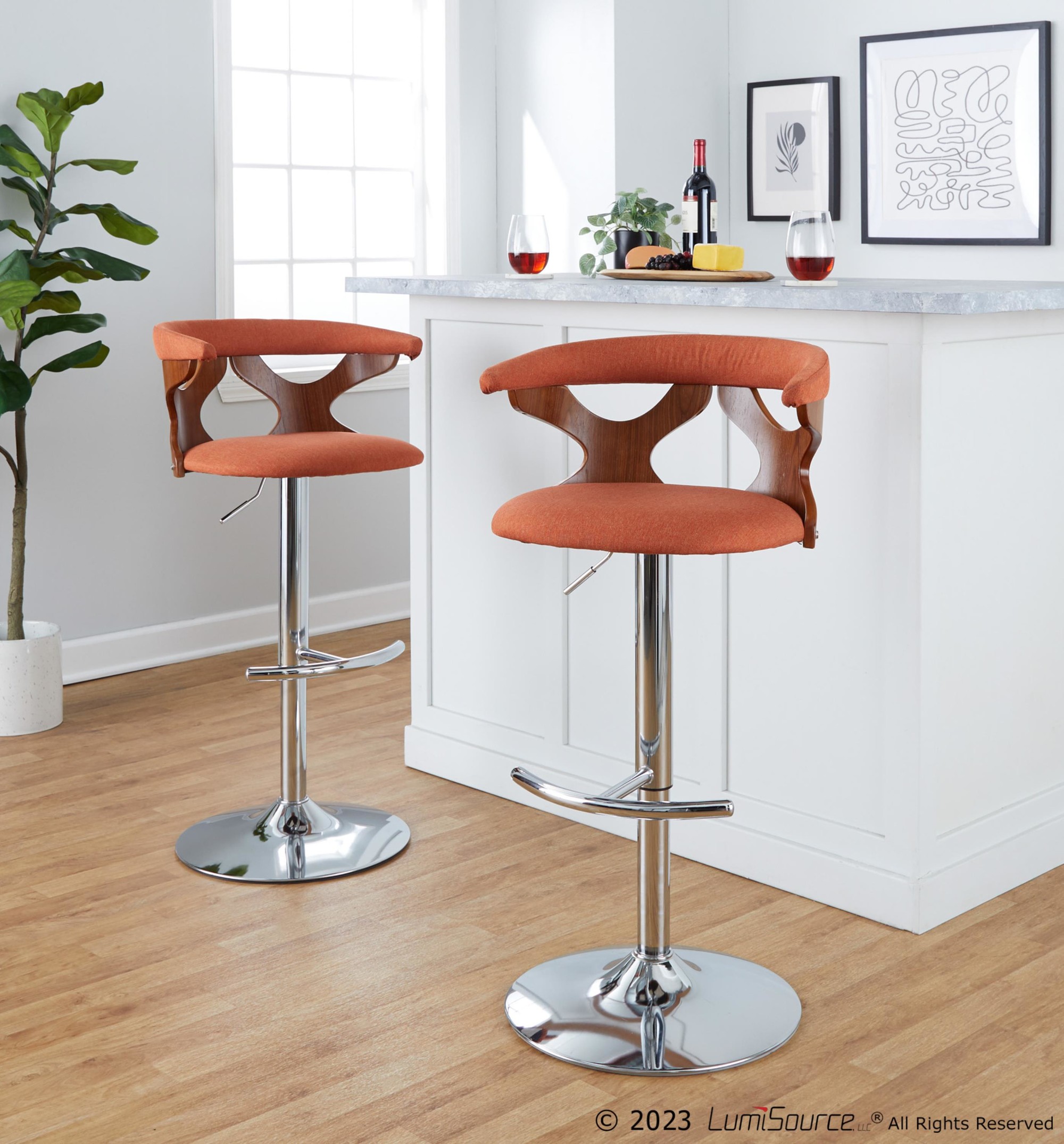 The Gardenia Orange Mid-Century Modern Swivel Adjustable Barstool adds a touch of retro charm to any bar or counter area. This barstool features a unique cut-out back design, providing visual appeal and comfortable support. The rounded back and padded orange fabric upholstery offer a cozy seating experience. A full-motion swivel and adjustable height ensure functionality and practicality.