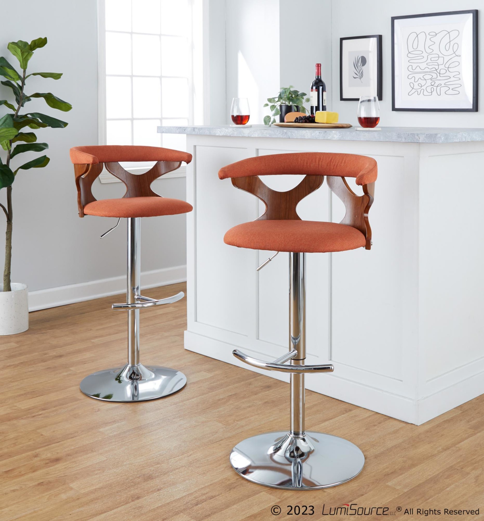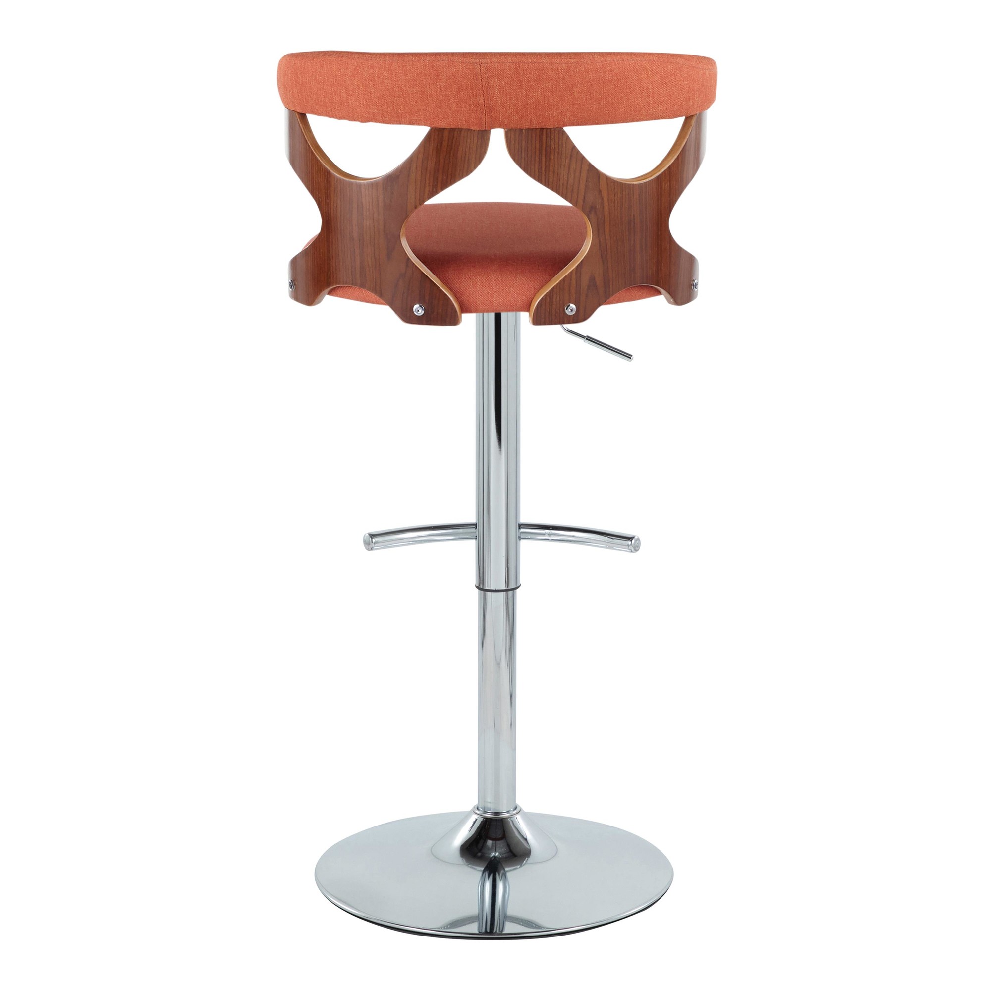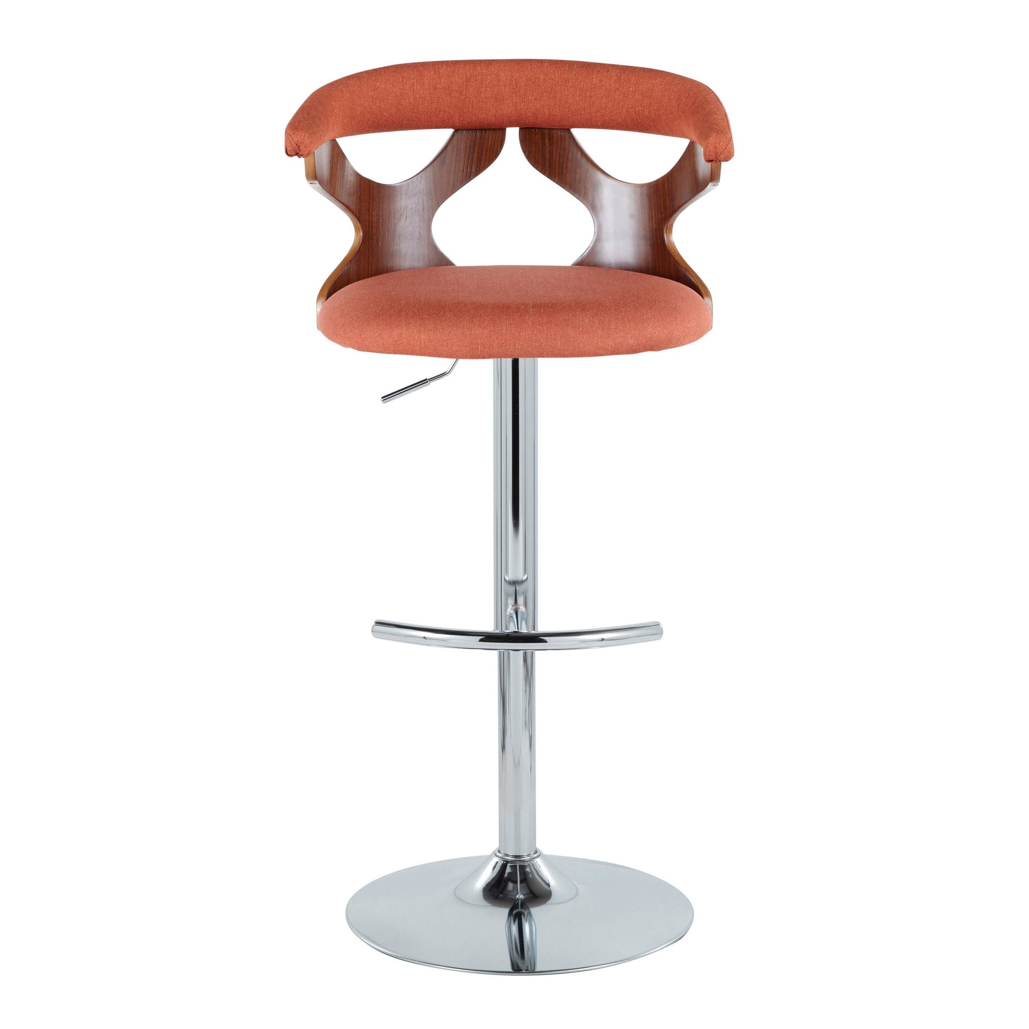 Add a touch of cool to your space with the Gardenia Orange Mid-Century Modern Swivel Barstool Set. The unique cut-out back design adds visual appeal. Enjoy comfortable seating with a rounded back and padded orange fabric upholstery. Each barstool has a 360-degree swivel and an adjustable height for versatile use. The chrome metal base includes a rounded T footrest for added comfort. This set includes three barstools, perfect for your bar or counter area. Assembly is required. Each stool supports up to 250 lbs.