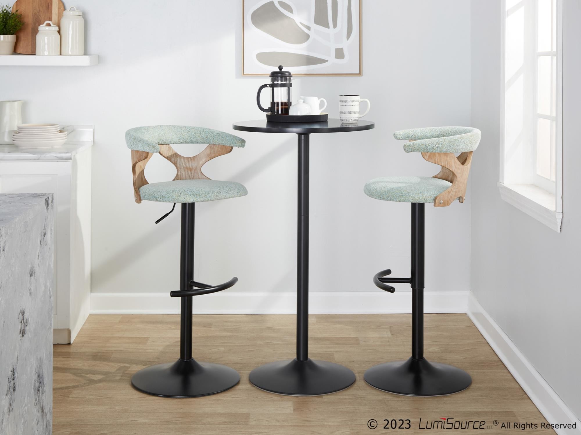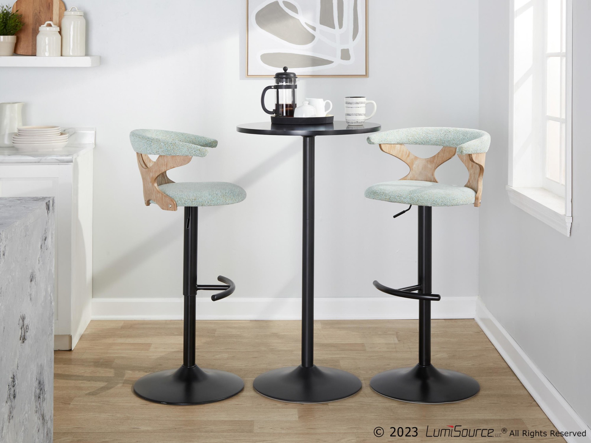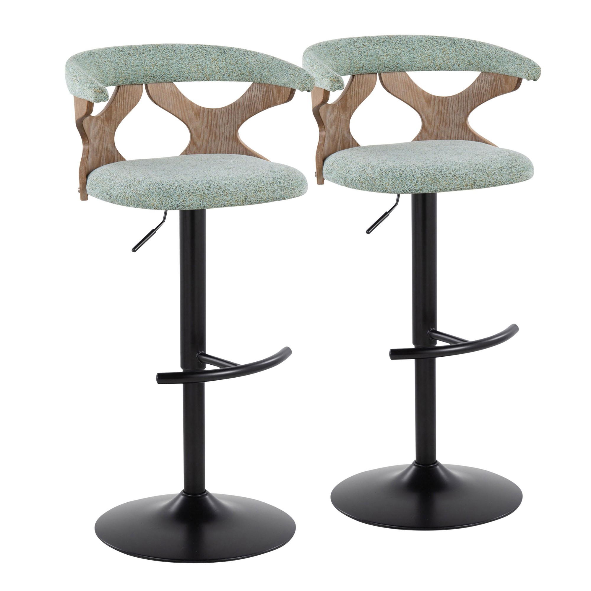 The Gardenia Seafoam Green Swivel Adjustable Contemporary Barstool Pair offers a unique blend of style and comfort. Its distinctive cut-out back design adds visual appeal, making it a standout piece for any bar or counter area. Enjoy the comfort of the rounded back and padded upholstery, combined with the practicality of a full-motion swivel. These barstools are sold in pairs and designed to elevate your seating experience.