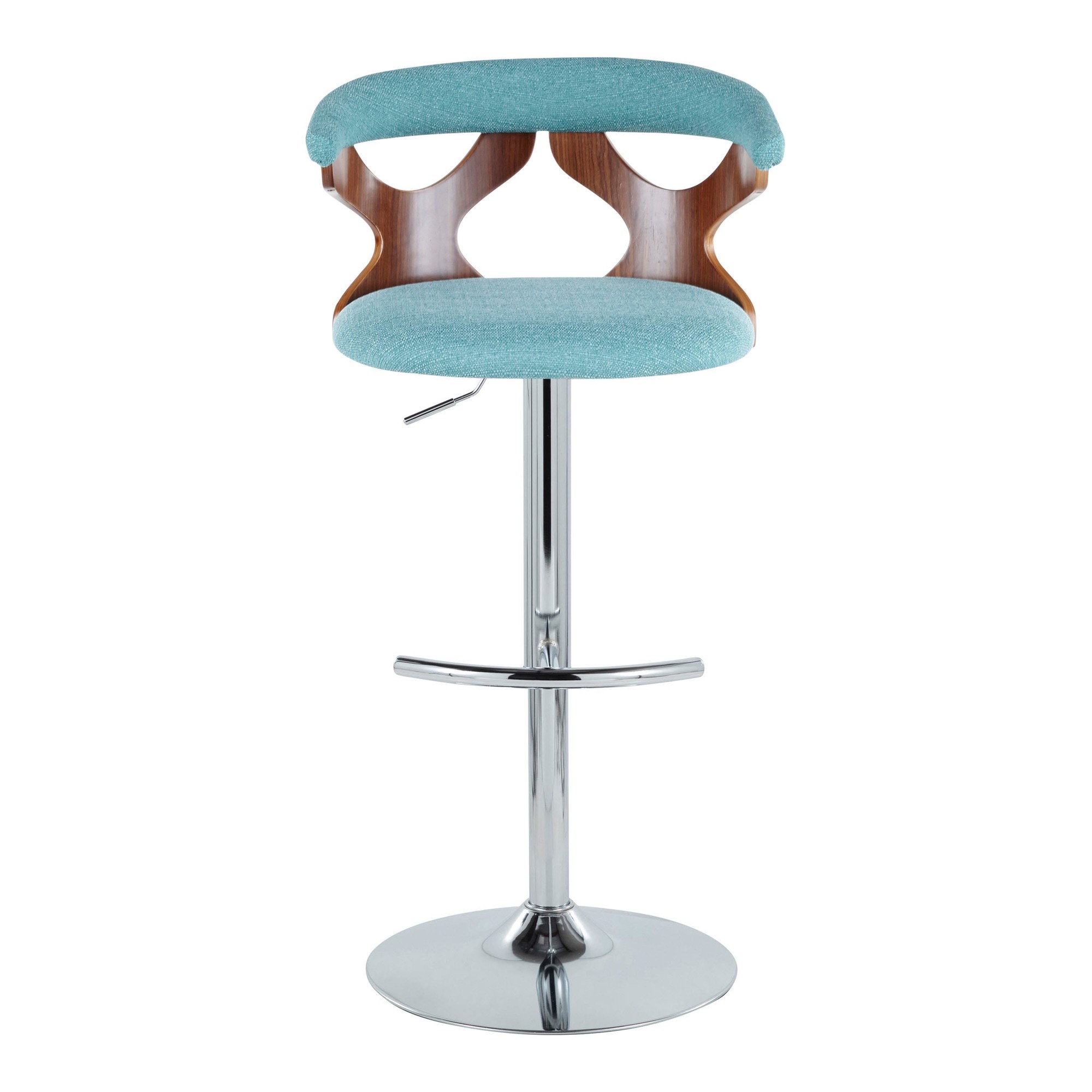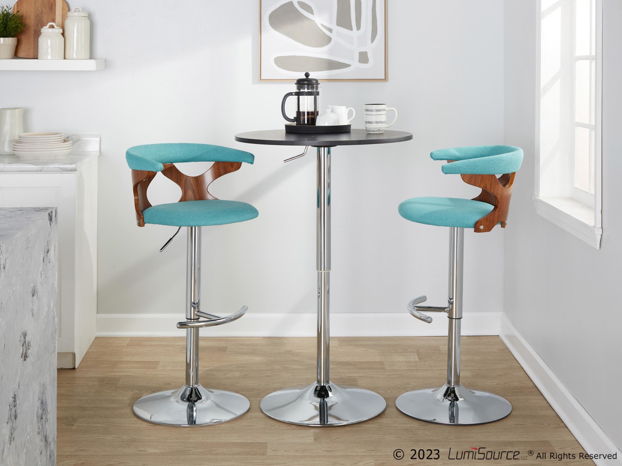 Add a cool look to your bar with these Gardenia Teal Mid-Century Modern Swivel Adjustable Barstools. The cut-out back design adds style. The rounded back and soft seat are comfy. They have adjustable height. The 360-degree swivel makes it easy to turn. The chrome metal base has a footrest. The seat depth is 16.25 inches. The color is chrome, walnut wood, and teal fabric. Assembly is needed. They each hold up to 250 pounds. This item is priced and sold in pairs.
