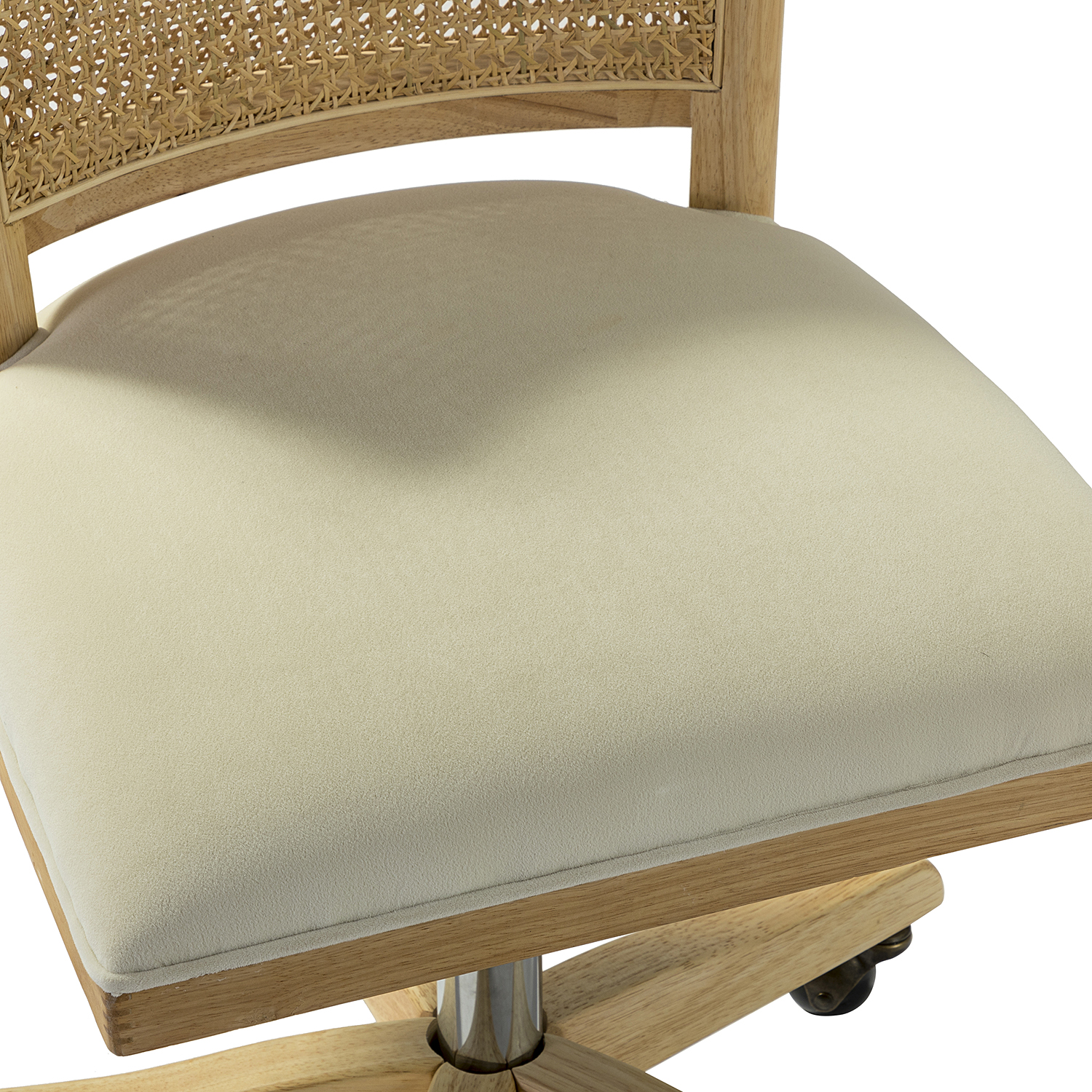 This modern swivel office chair adds contemporary elegance to any workspace. Its polyester blended fabric upholstery complements various design tastes, while the solid wood and rattan backrest provide a tailored touch. Enjoy comfortable support with its foam fill, sturdy solid wood legs, 360-degree wheels for smooth gliding, and adjustable height for personalized comfort. This chair is ideal for both casual and professional settings, offering a cozy and convenient design.