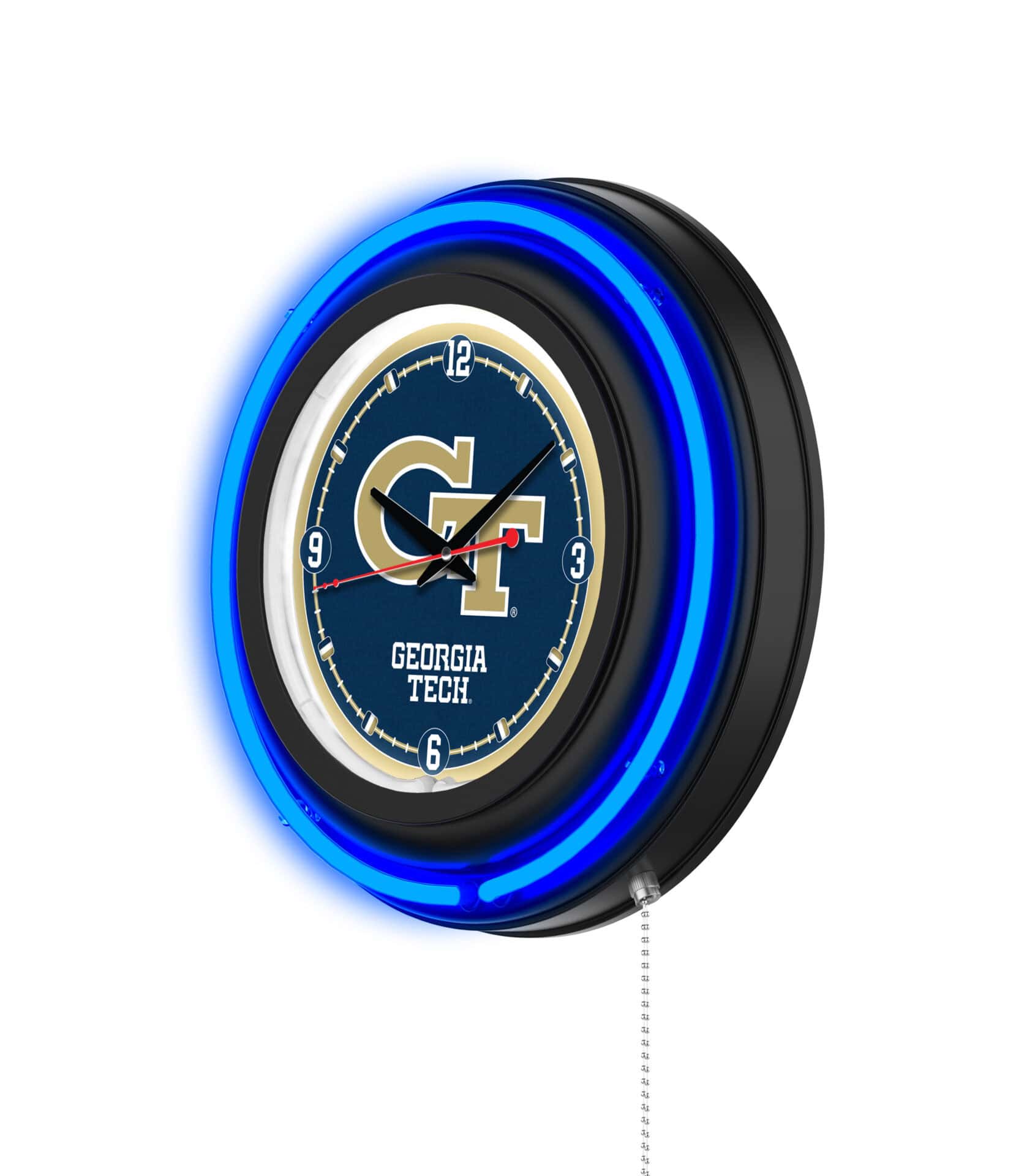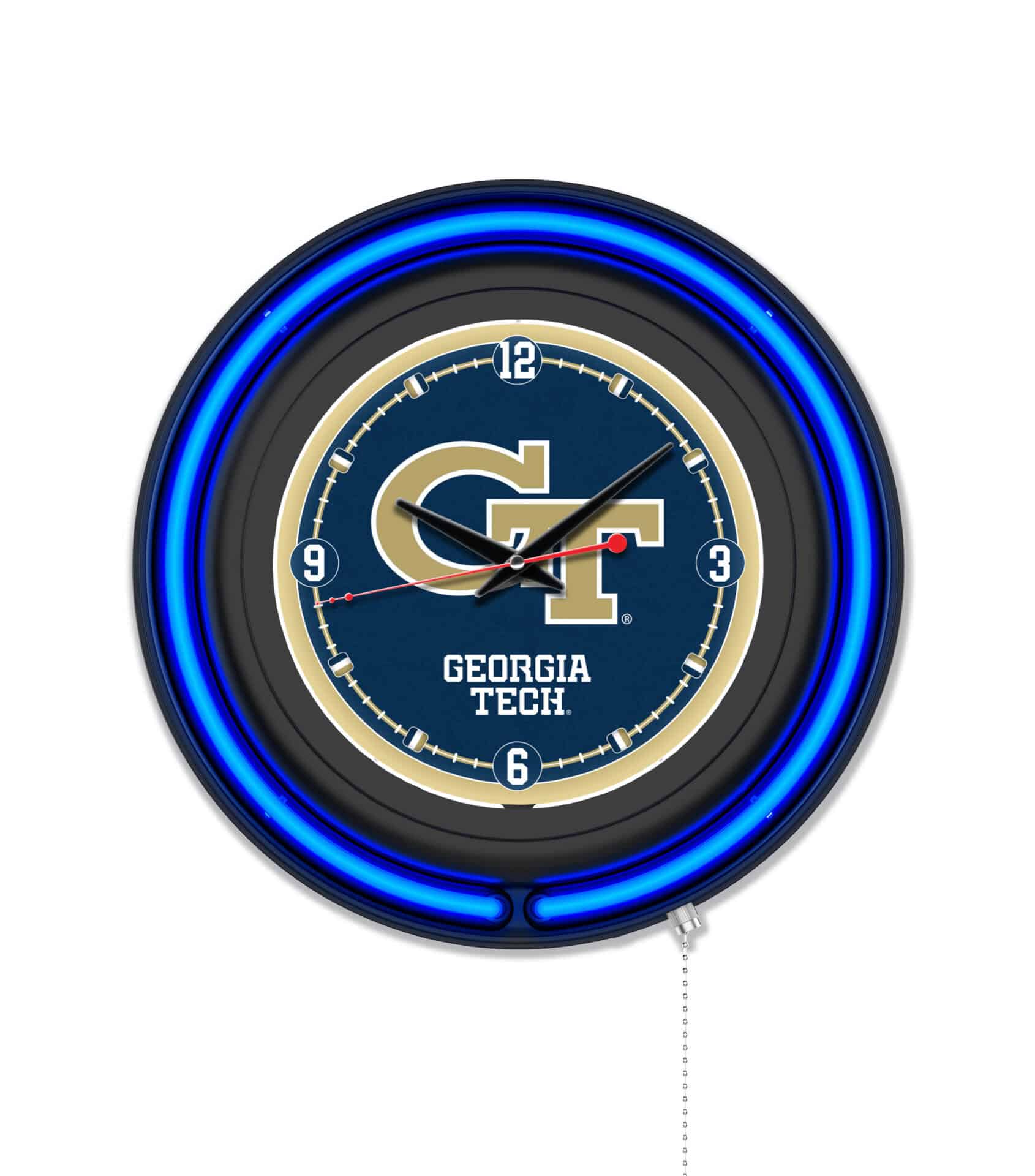 The “Georgia Tech 15-Inch Neon Logo Clock in Black” is the ultimate addition to your man cave, showcasing your school pride in a vibrant and functional way. This clock features a sleek black casing with a neon outer ring in team colors, perfectly illuminating the custom printed clock face with a brilliant white inner neon ring. The neon rings can be easily turned on and off using a convenient pull chain, while the clock operates on a single AA battery, ensuring accurate timekeeping. Whether for yourself or as a gift for a sports enthusiast, this clock is a stylish and practical choice.