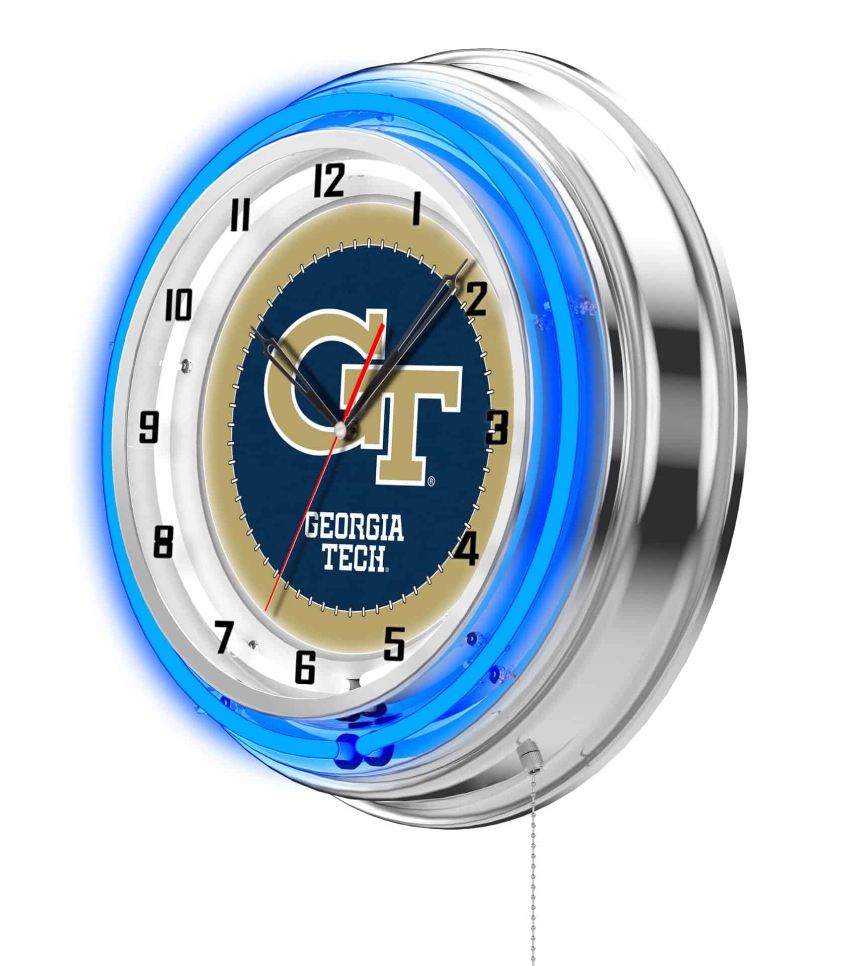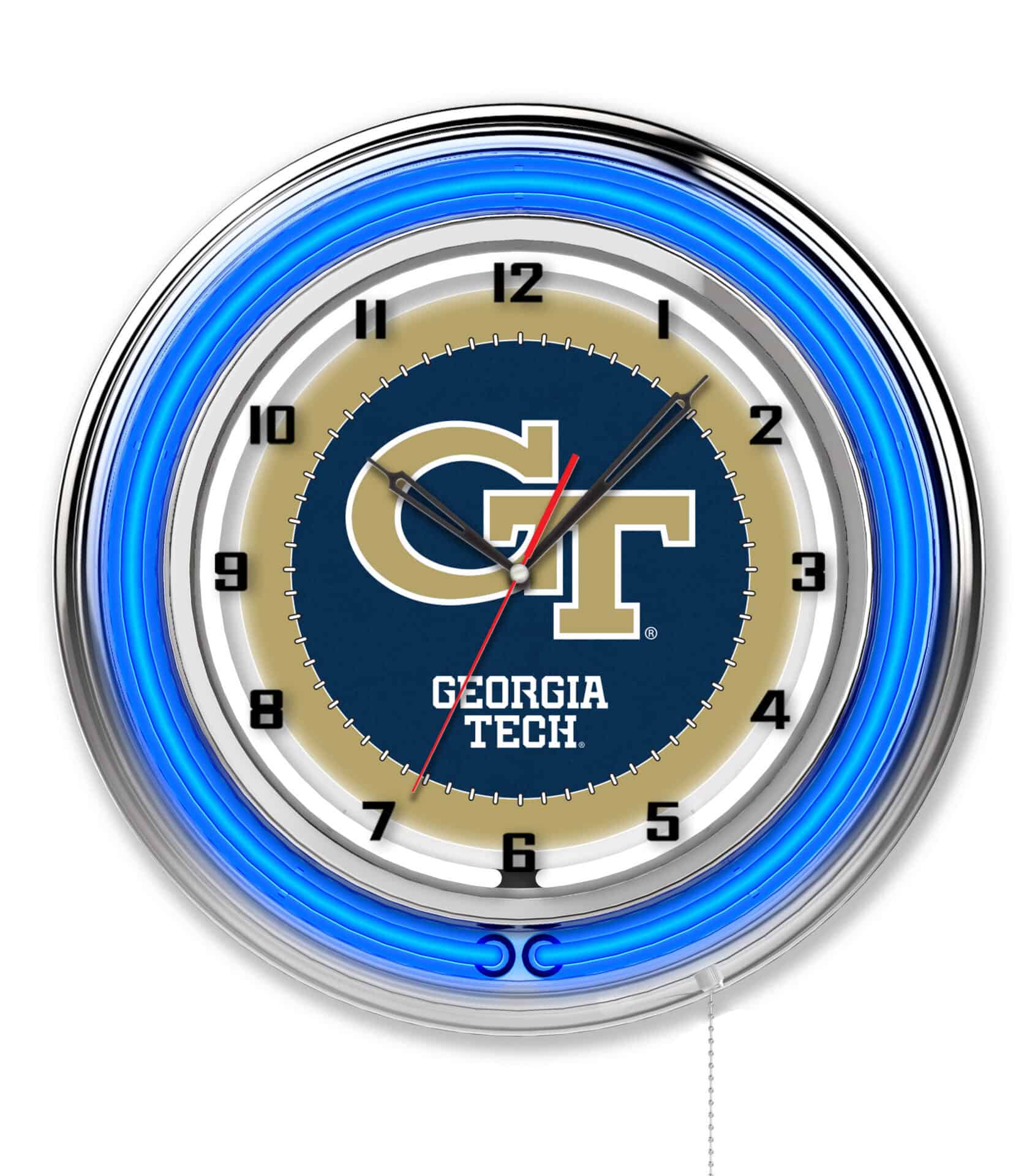The “Georgia Tech 19-Inch Neon Logo Clock in Chrome is the perfect addition to any space, showcasing your school pride with its vibrant design and functional features. This clock features a stylish chrome casing complemented by a team color-specific neon outer ring and a brilliantly lit white inner neon ring that illuminates the custom printed clock face. The neon rings can be easily turned on and off with a convenient pull chain located at the bottom of the clock, and the clock operates using a UL Listed power transformer from a standard 120V outlet. With accurate quartz movement powered by a single AA battery (not included), this clock not only serves as a decorative piece but also ensures you always keep track of time.