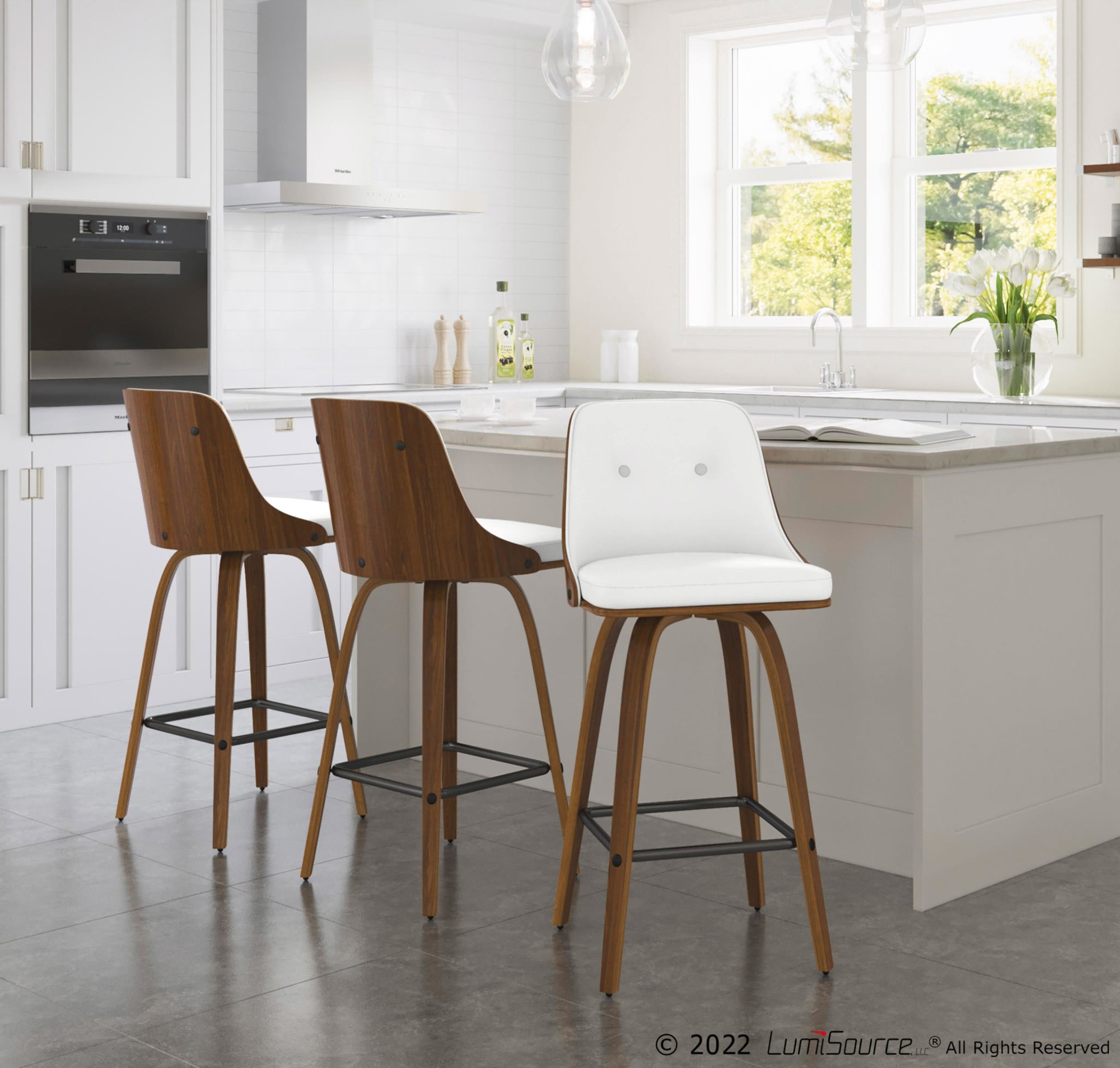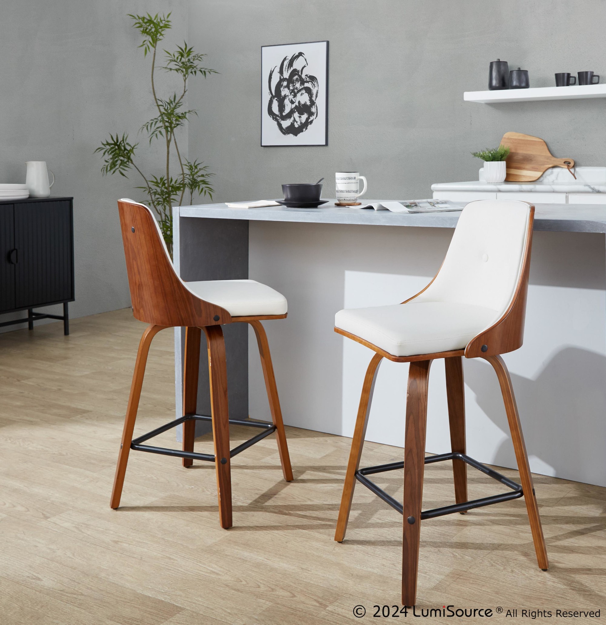 Featuring a contoured wooden back, bentwood tapered legs, and a dual-tufted faux leather seat, the Gianna counter stools are both stylish and comfortable. The 360-degree swivel adds functionality, making them perfect for any counter area.