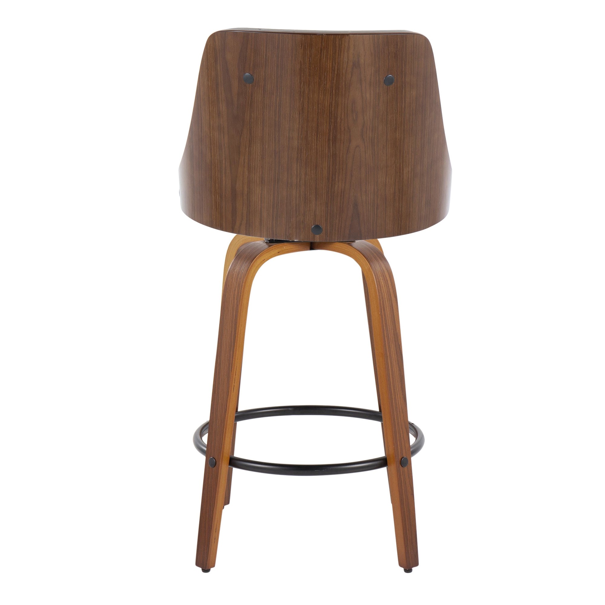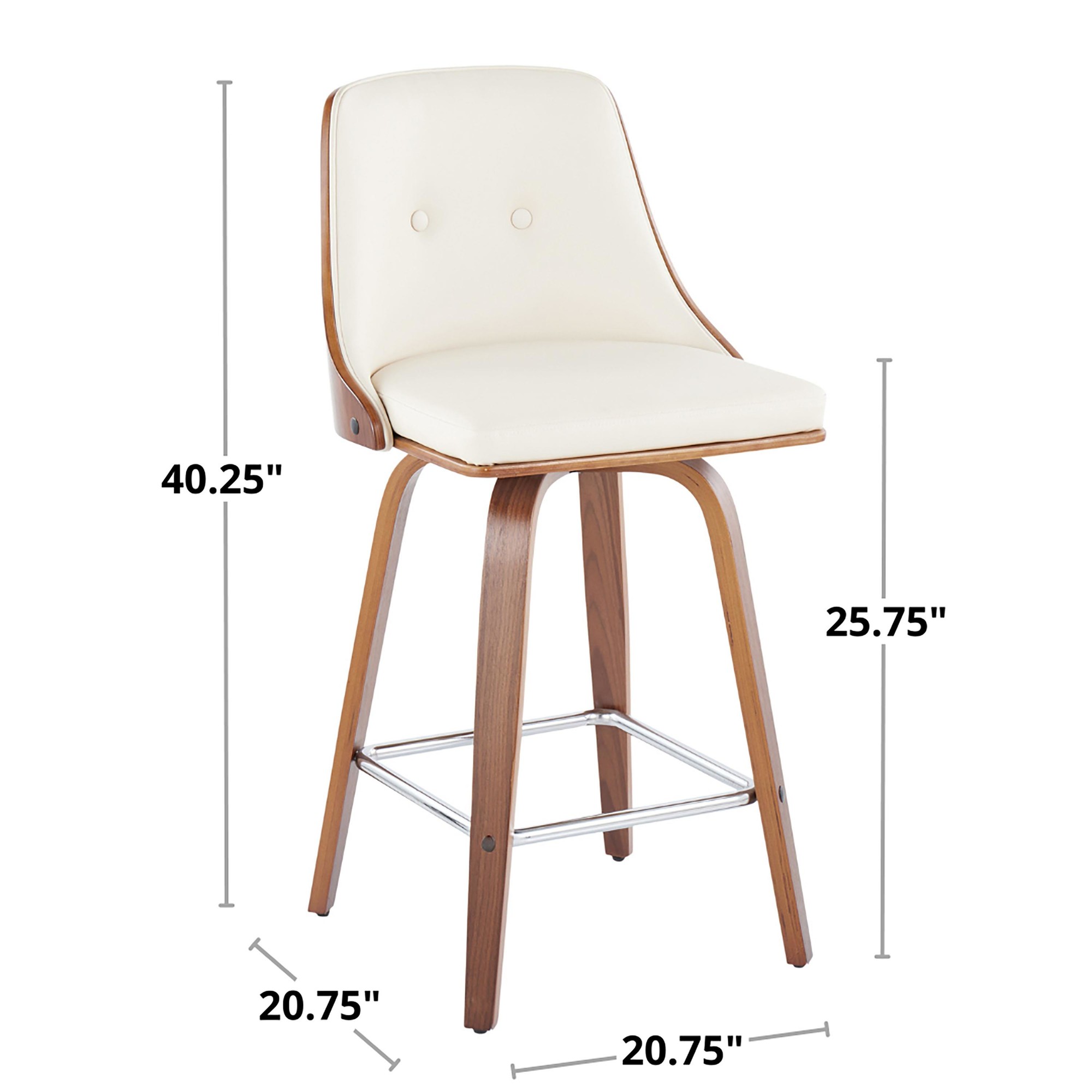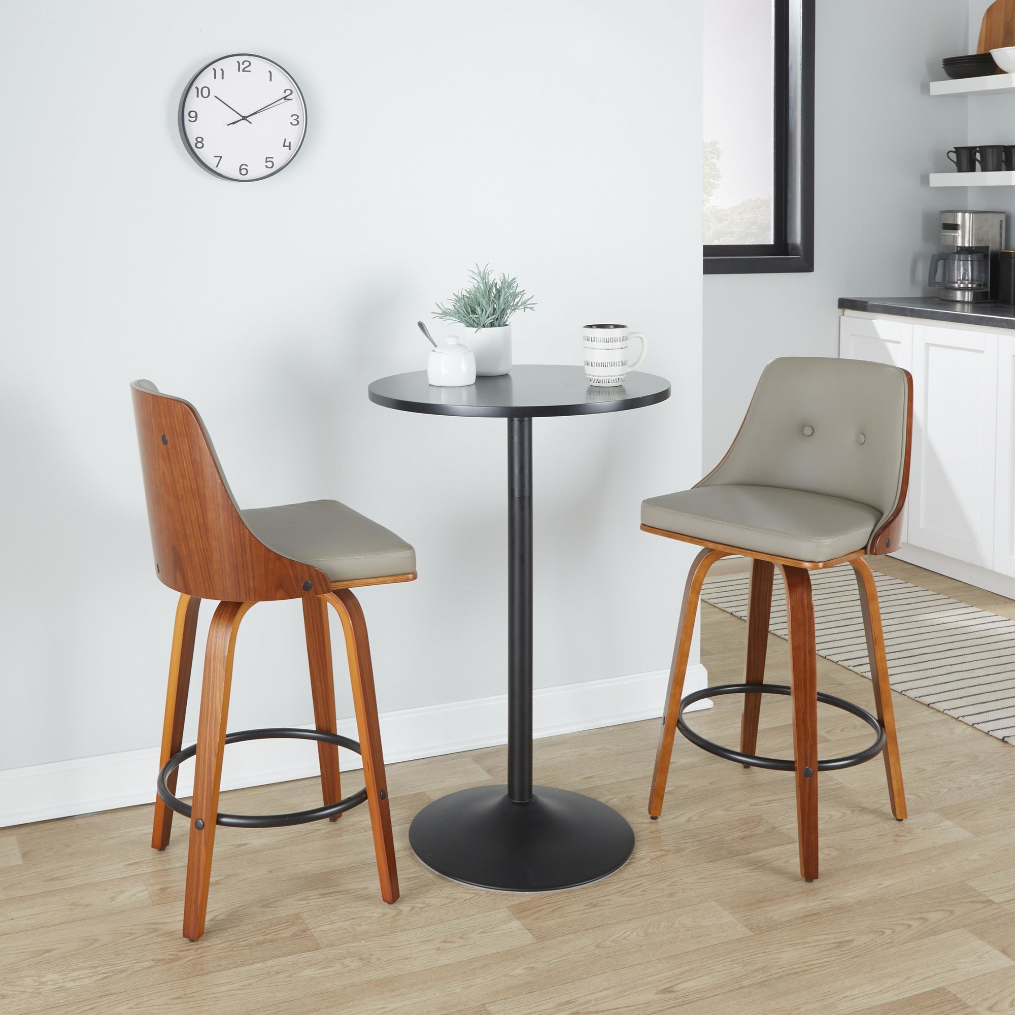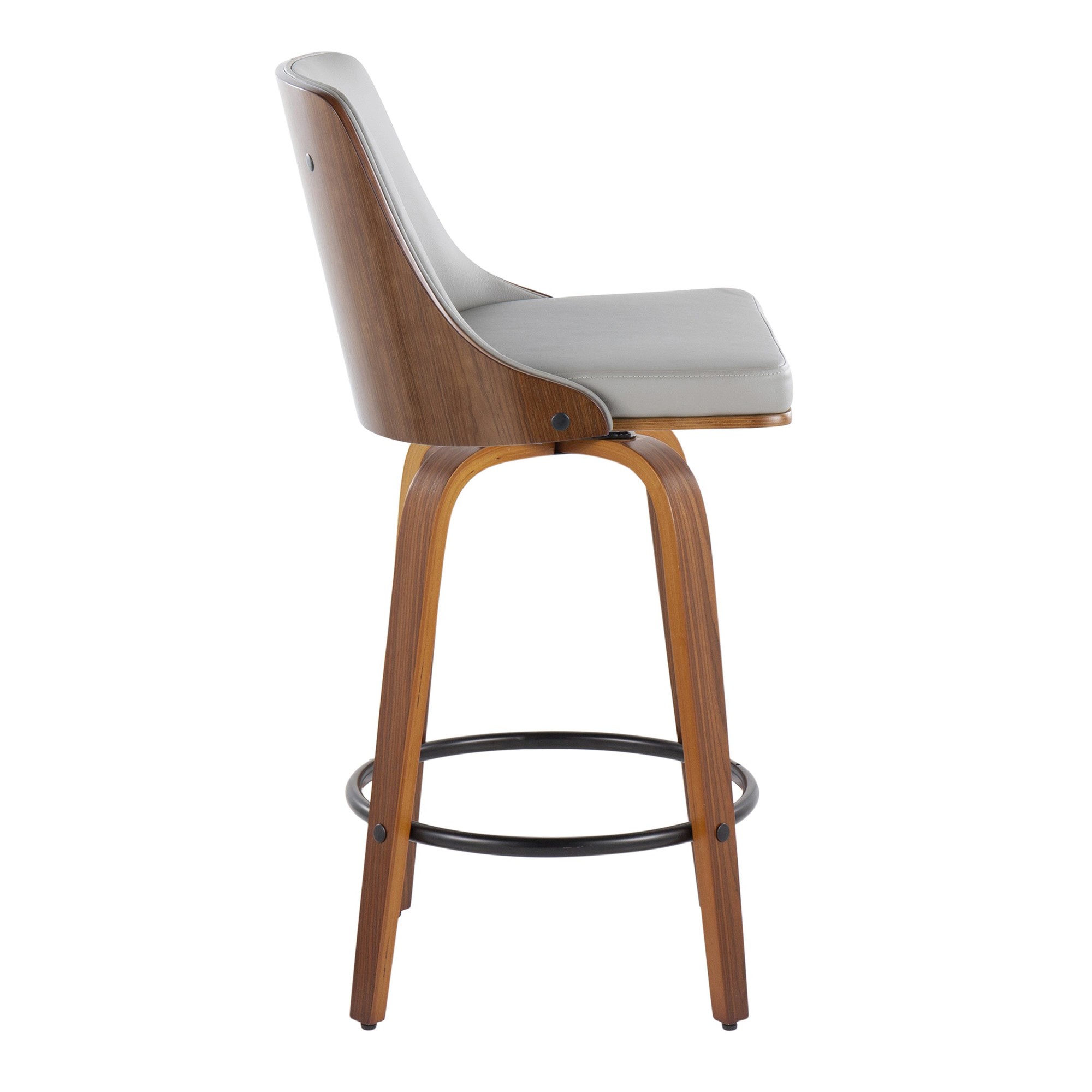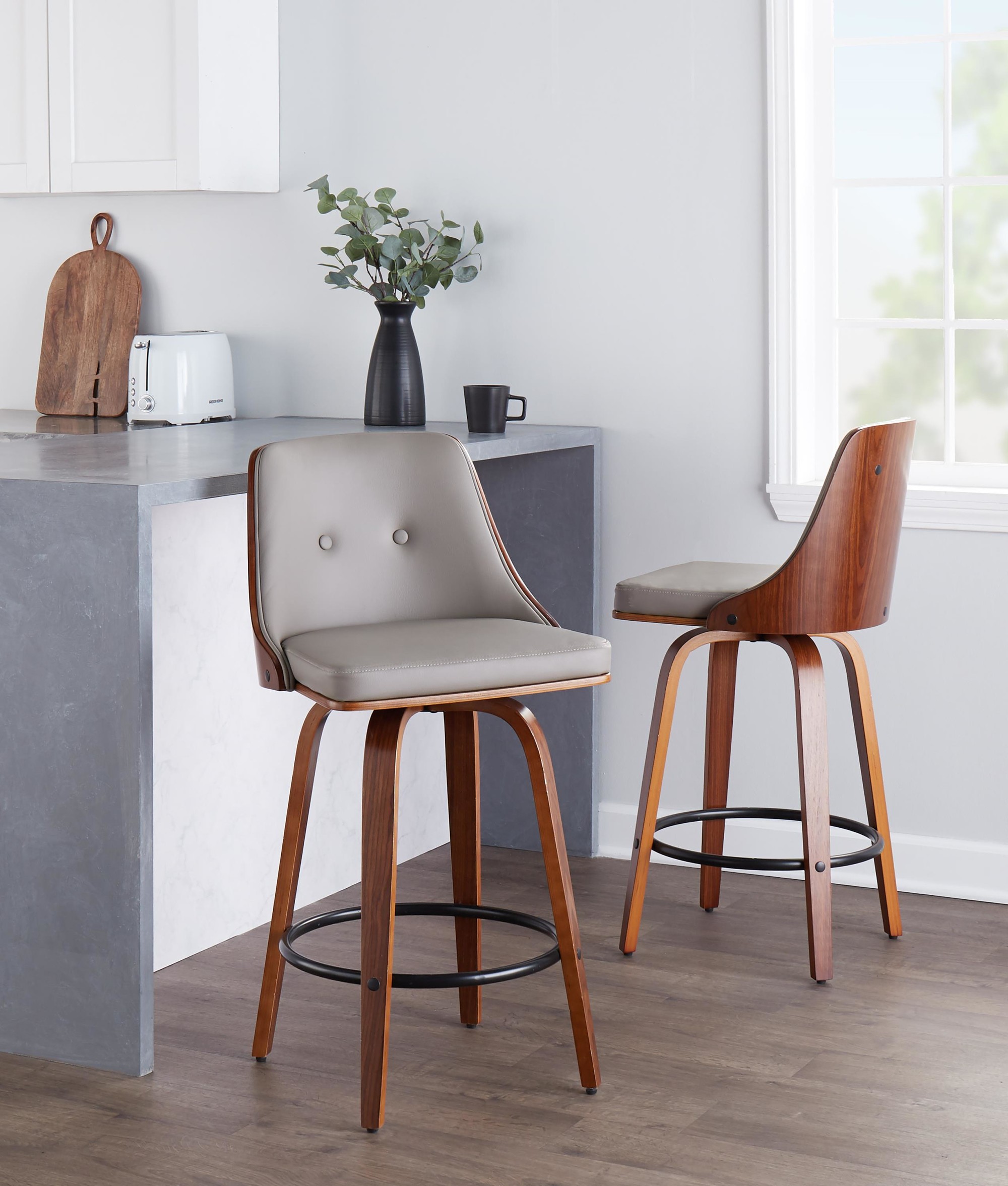 Enhance your bar area with the inviting charm of the Gianna 26″ Mid-Century Modern Light Grey Swivel Counter Stools. This set of two counter stools feature stylish faux leather upholstery and a comfortable, contoured wooden back. The bent wood legs are complemented by a sturdy round black metal footrest. Enjoy the convenience of a 360-degree swivel while seated at a fixed counter height of 25.75″. With a seat depth of 15.5″, an inside seat width of 17″, and a backrest height of 12.25″, these stools offer both style and comfort. Assembly is required, and each stool has a weight limit of 250 lbs. Perfect for adding a touch of mid-century modern flair to your man cave.