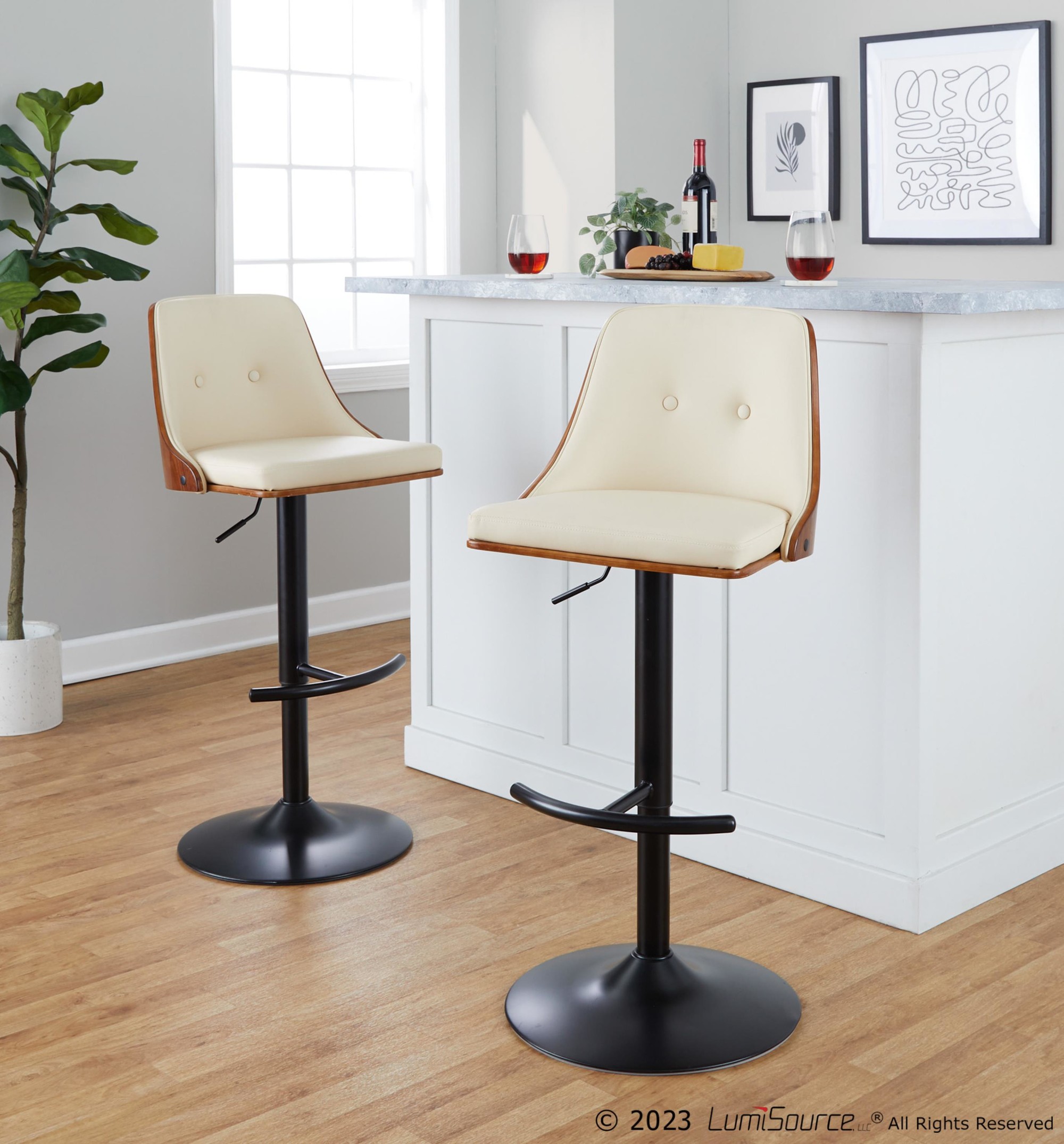 The Gianna Cream Faux Leather Mid-Century Swivel Barstools are an inviting and refined seating option, adding a touch of heritage design to any space. These barstools seamlessly blend style and comfort, making them a perfect addition to your home.