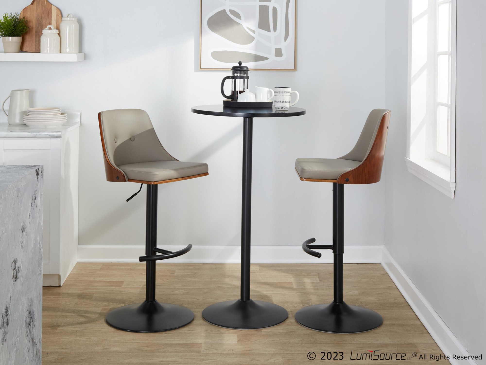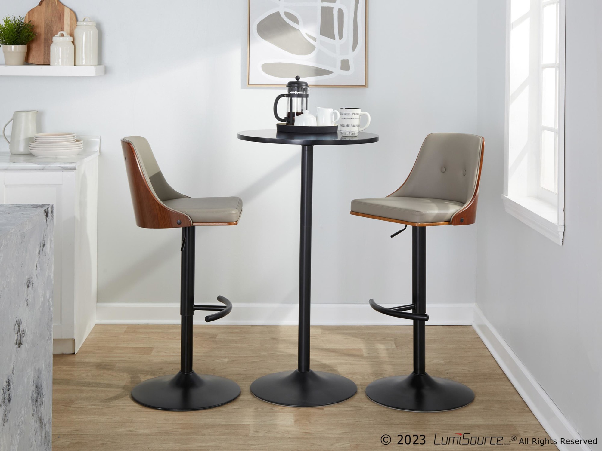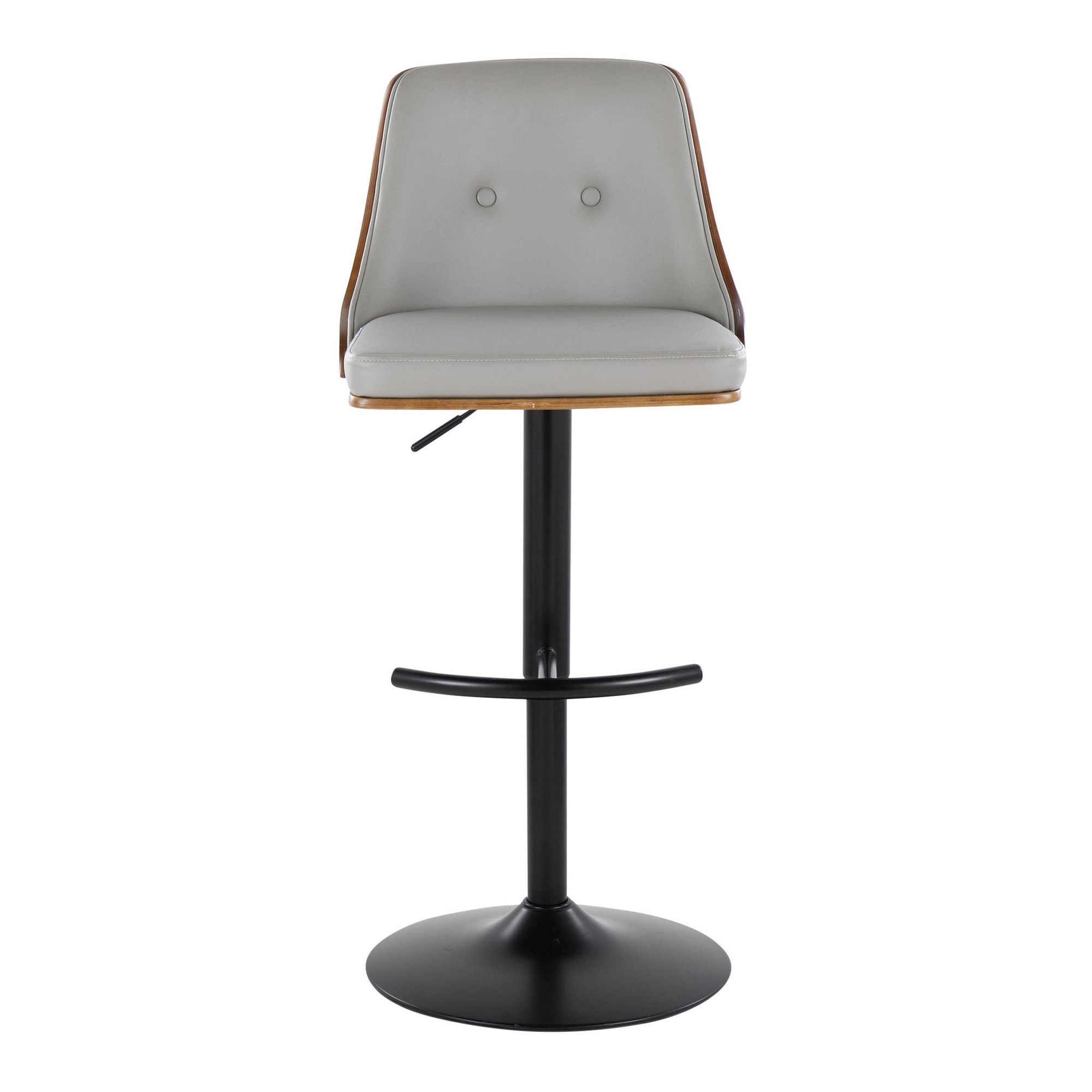 The Gianna Mid-Century Modern Light Grey Barstool offers an inviting and refined design with a hint of heritage. This barstool will add a touch of class to any space. It features a contoured wooden back, a tufted faux leather swivel seat, and a built-in footrest, making it both stylish and comfortable. The Gianna is available in a variety of colors and bases to best fit your space!