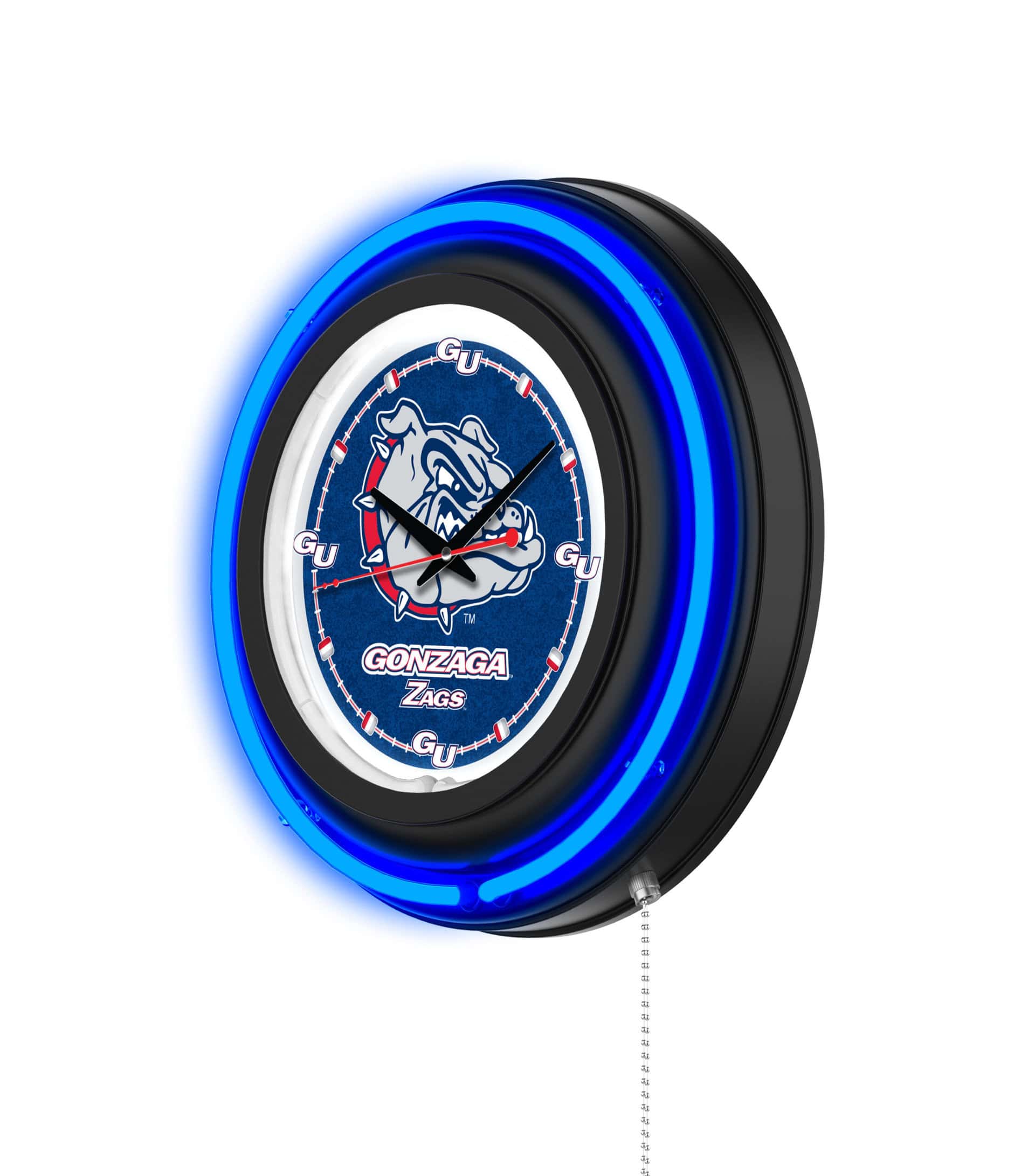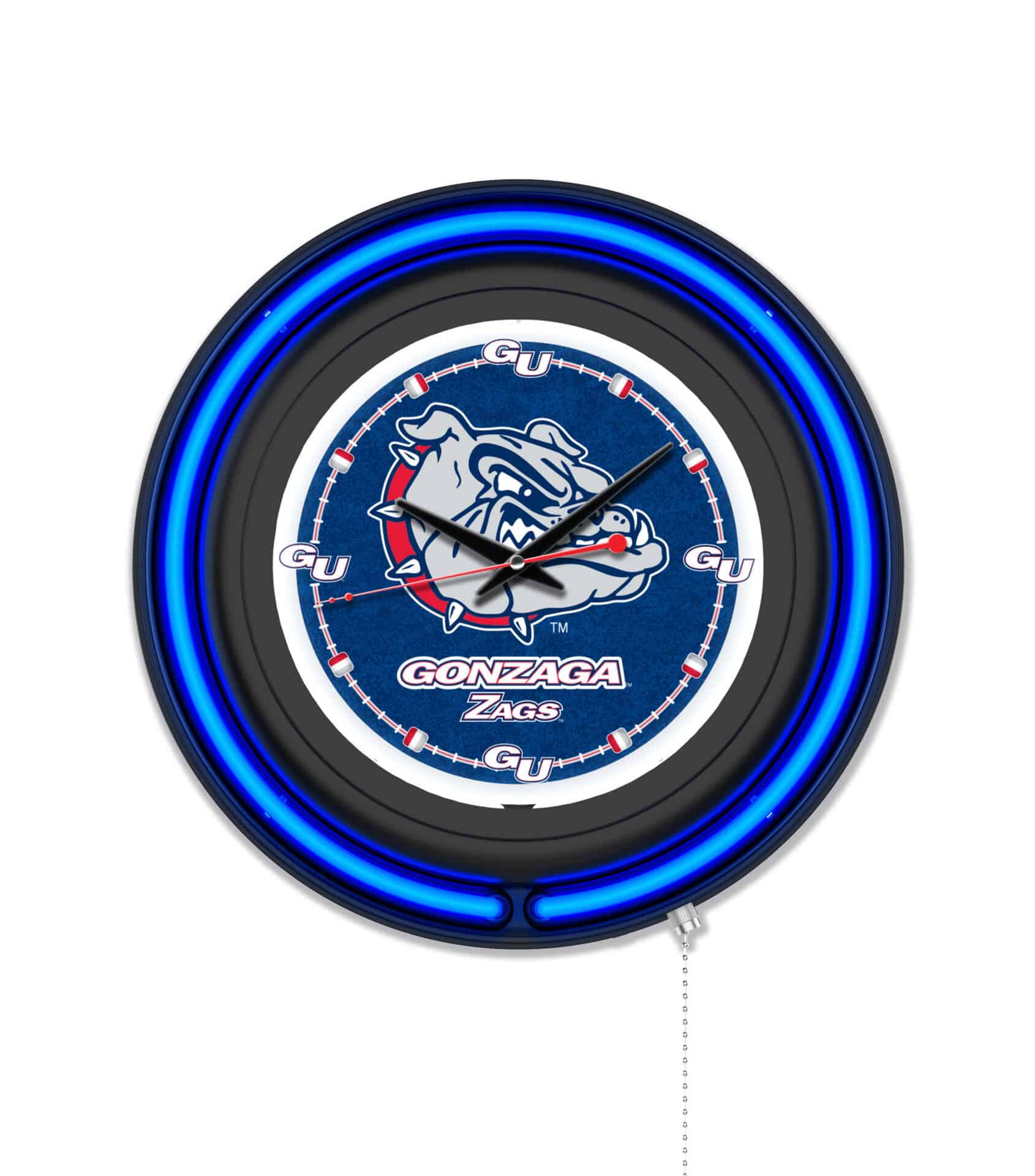 The “Gonzaga 15-Inch Neon Logo Clock in Black is the ultimate statement piece for any fan cave or sports-themed room. With its striking design and vibrant colors, this clock not only keeps time but also showcases your school pride. The black casing is complemented by a neon outer ring in team colors, while the brilliant white inner neon ring illuminates the custom printed clock face. Equipped with a pull chain for easy on/off operation, this clock is powered by a UL Listed transformer and requires a single AA battery for accurate quartz movement.