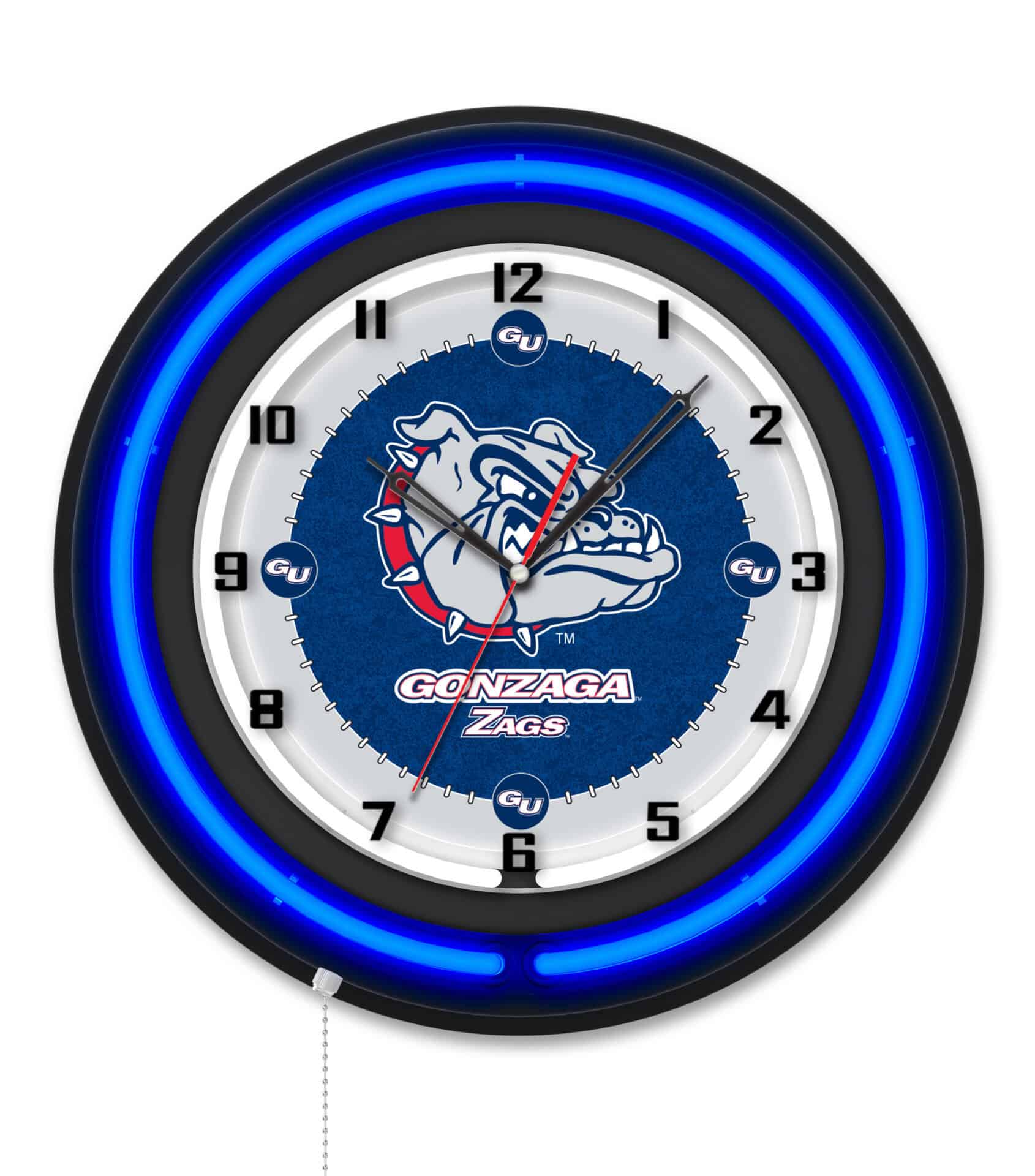 The “Gonzaga 19-Inch Neon Logo Clock in Black is an eye-catching addition to any man cave, showcasing your school pride with vibrant colors and a unique design. This clock features a sleek black casing and a neon outer ring that highlights a custom printed clock face, illuminated by a brilliant white inner neon ring. The neon rings can be easily turned on and off using a convenient pull chain located at the bottom of the clock. With its accurate quartz movement powered by a single AA battery, this clock ensures you always stay on time, making it a perfect gift for recent graduates, sports fans, or for personal use.