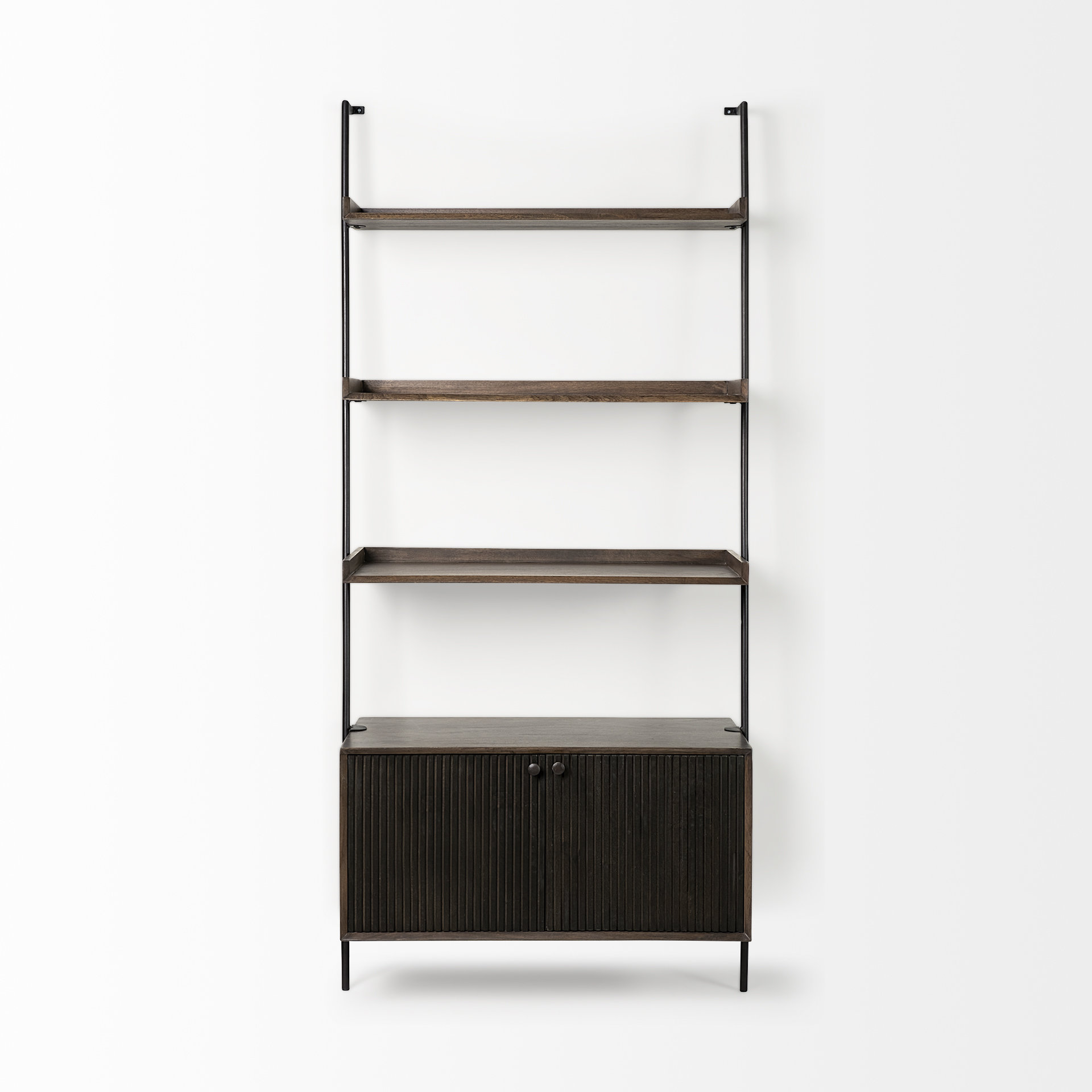 This ladder-style shelving unit, crafted from solid wood and accented with a sleek metal frame, offers a blend of storage and display space. Its two-tone finish and fluted cabinet doors create a focal point, while the open shelves provide room to showcase treasured items. Ideal for modern and urban interiors, this piece combines functionality with contemporary design.