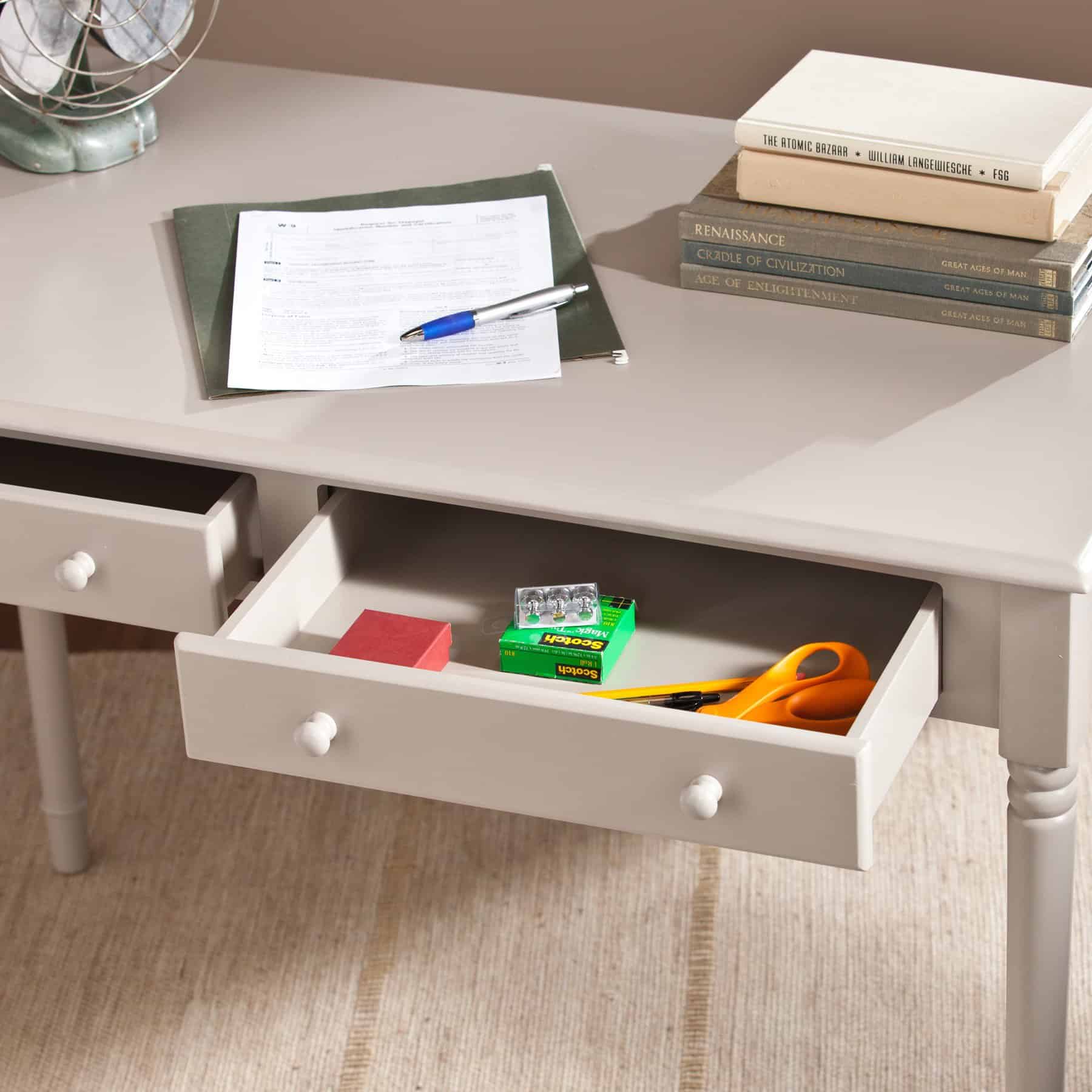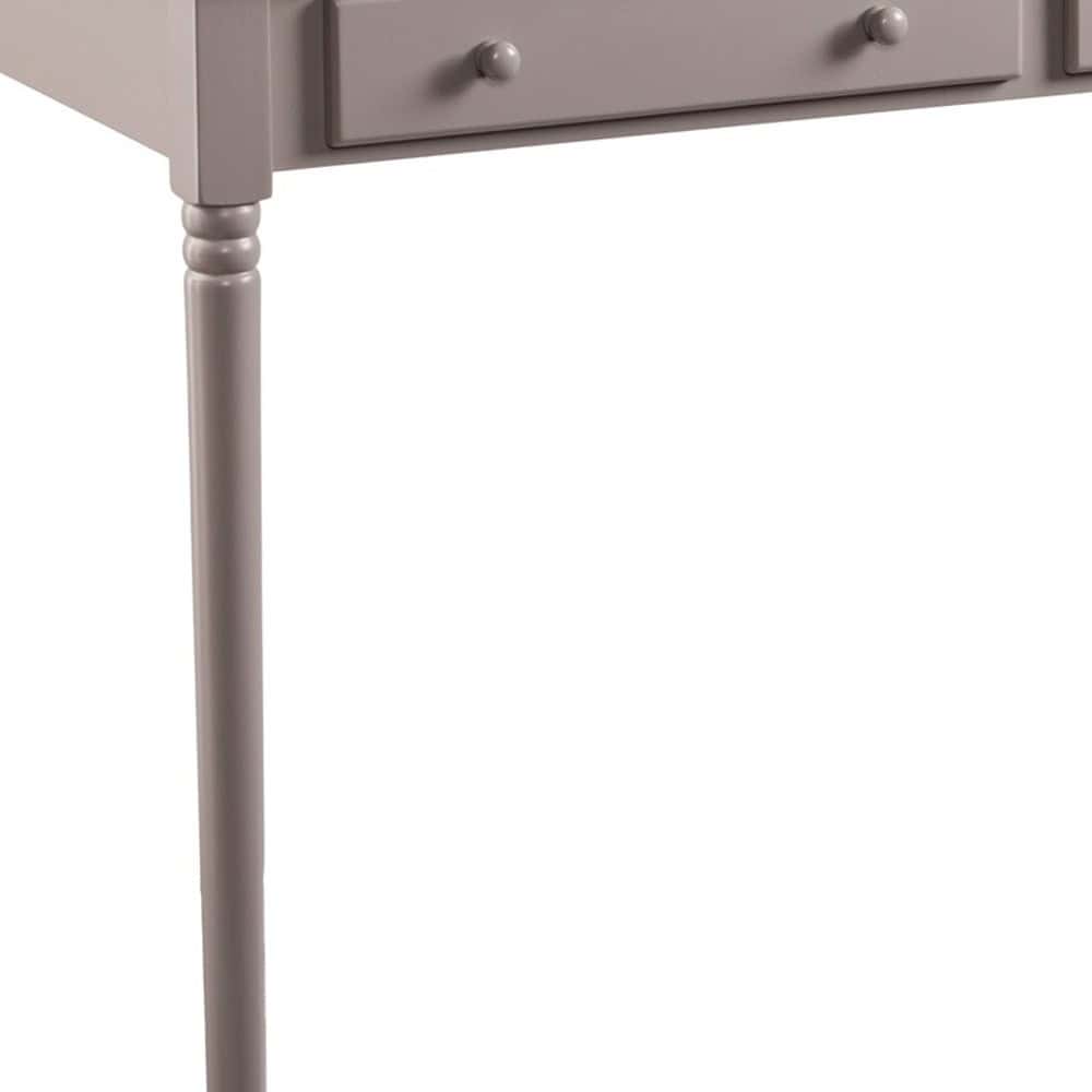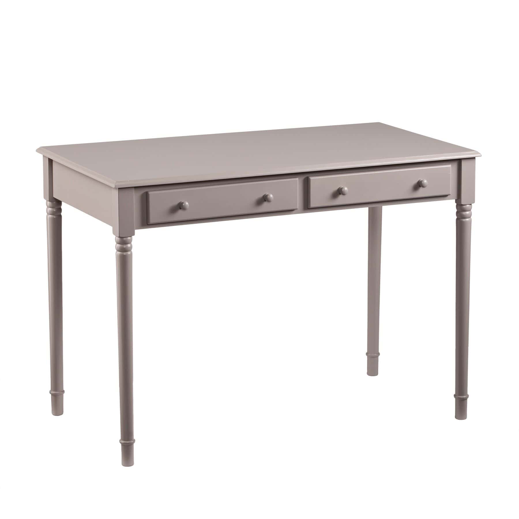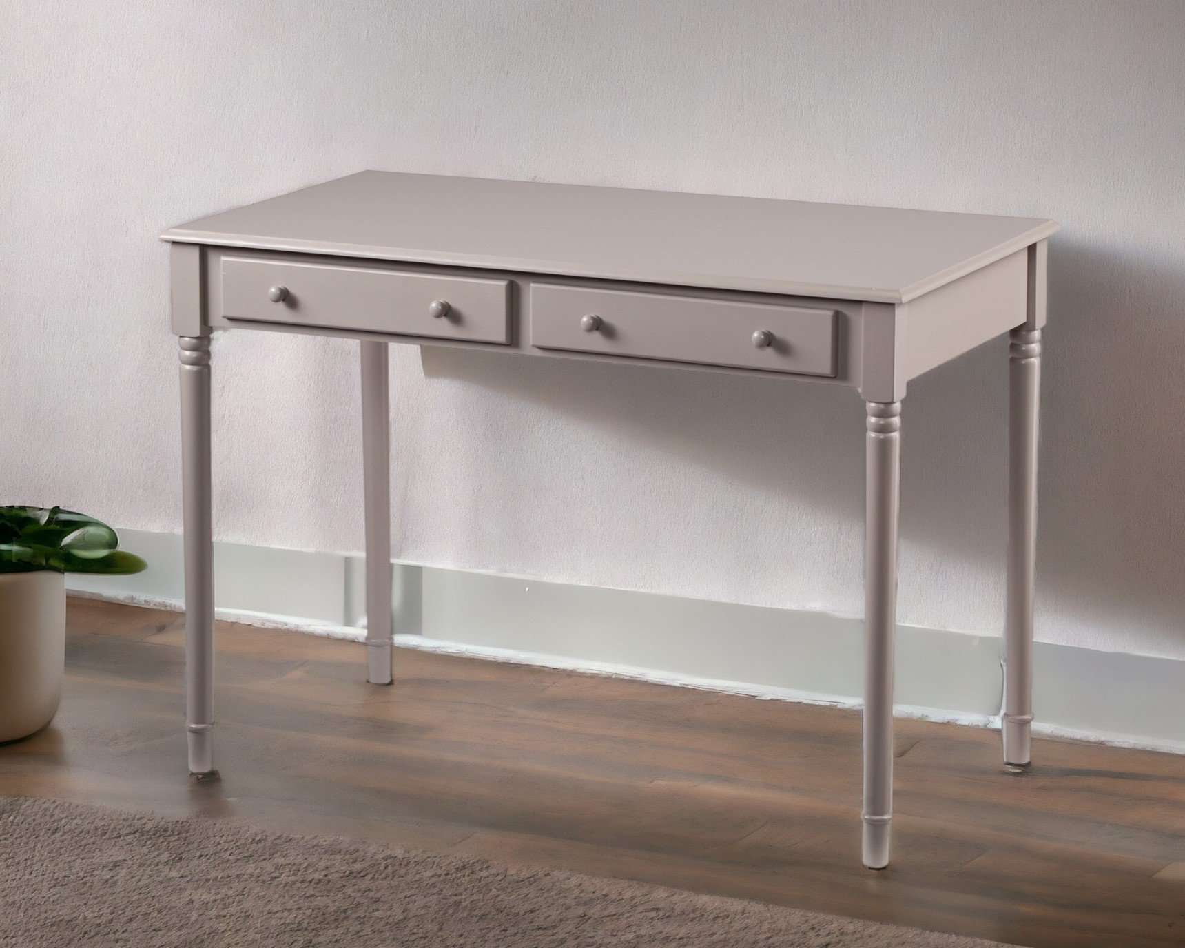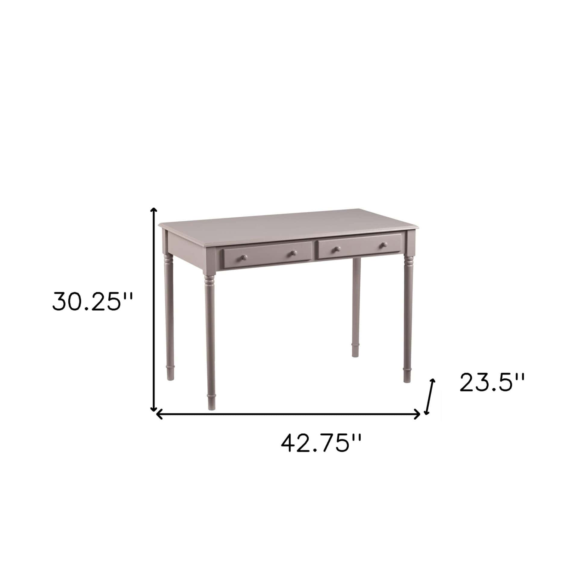 Brighten your home with the stylish and functional Gray Solid Wood Writing Desk With Two Drawers and Spindle Legs. Perfect for your living room, home office, or bedroom, this classic rectangular desk is finished on all sides to seamlessly fit into your space. With its traditional design and calming gray finish, it offers both elegance and practicality. The desk features two built-in drawers for hidden storage, helping you keep your workspace neat and organized. Sturdy and durable, this desk is designed to provide comfort and efficiency for years to come.