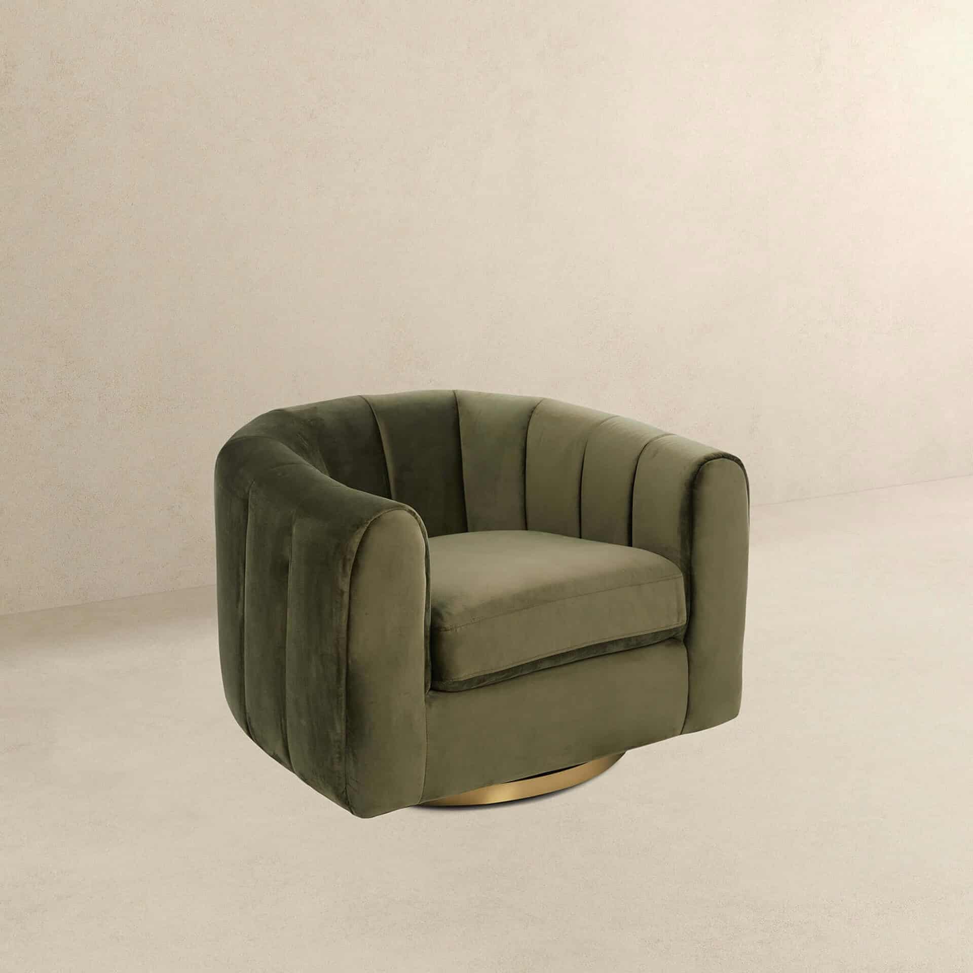 Introducing the epitome of relaxation and style, the Green Velvet Swivel Barrel Chair with Gold Plated Base embodies the essence of modern comfort and sophistication. Crafted to elevate any living space, whether as a focal point in the living room or a cozy addition to your bedroom corner, this chair seamlessly blends versatility with timeless design.