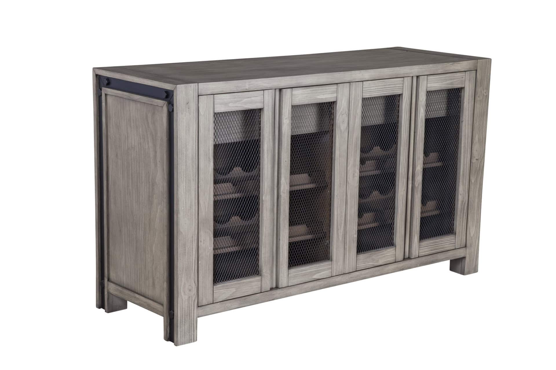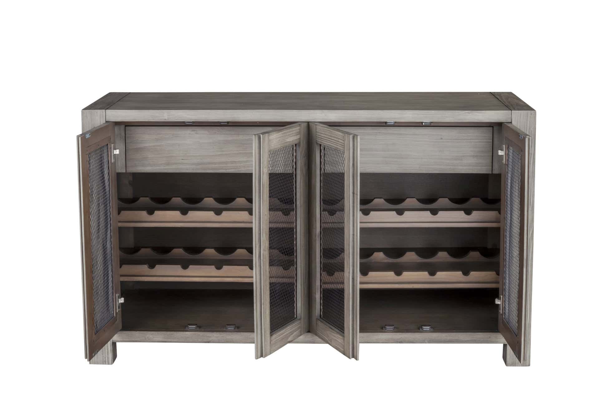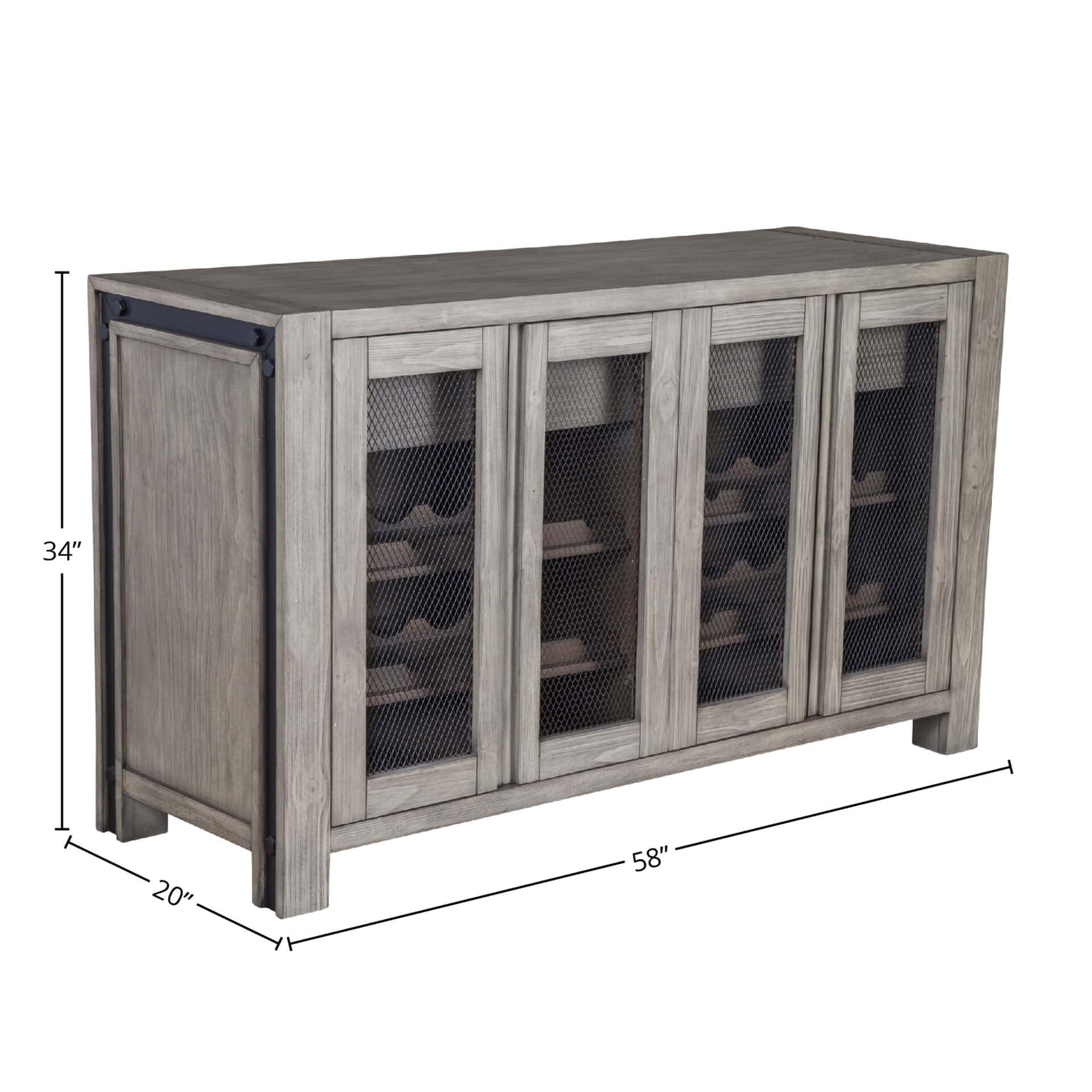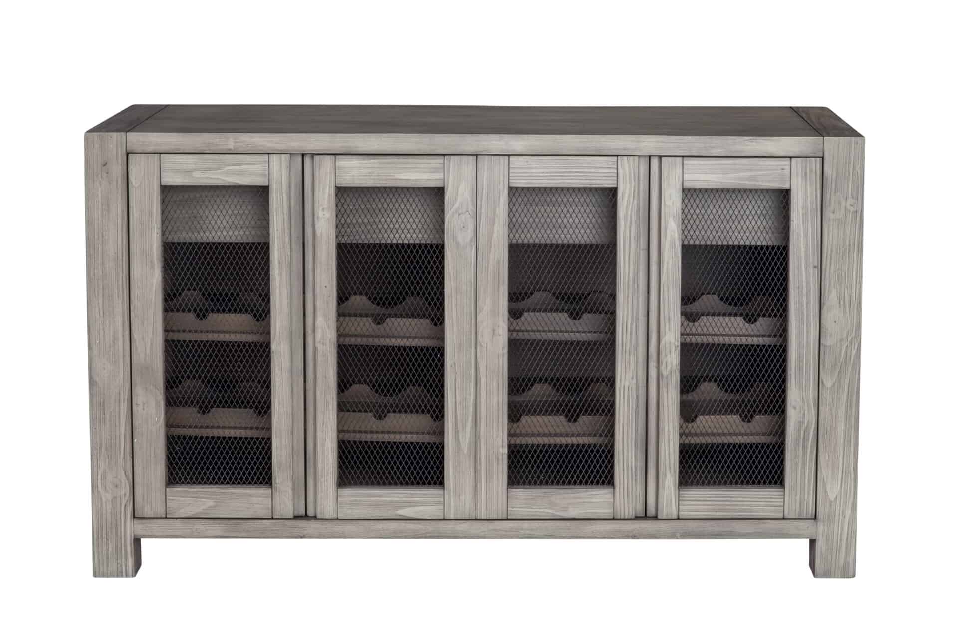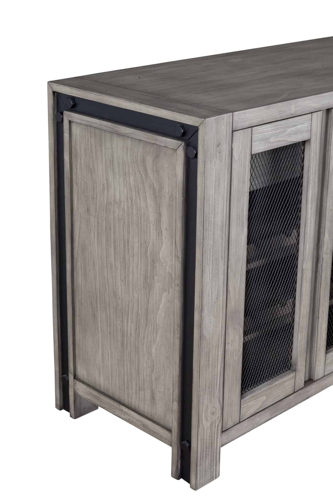 Introducing the Grey and Black Industrial Rustic Pine Sideboard with Wine Storage, a stunning handcrafted piece designed to elevate your dining or entertainment space. Made from solid pine and pine veneers, this sideboard boasts a beautiful grey finish that highlights the natural wood grain, adding a timeless and sophisticated touch. The industrial design is accented by inset black faux metal with distinctive bolt details and fashionable mesh insets on the door panels. This sideboard is as functional as it is stylish, featuring reversible shelves with wine storage, two interior drawers, and ample space for all your dining essentials. Best of all, this piece ships fully assembled, ready to enhance your space immediately.