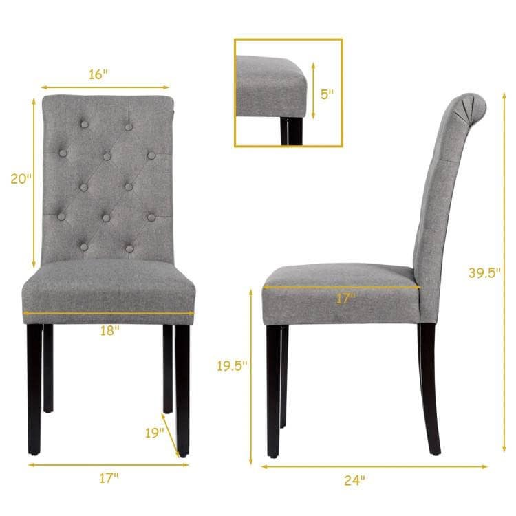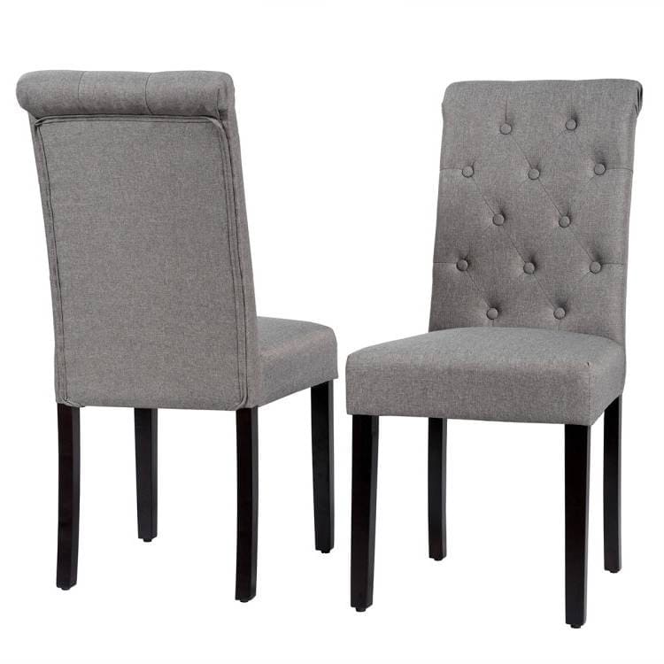 Enhance your dining experience with the elegant and functional Grey Linen Tufted Dining Chairs with Wood Legs (Set of 2). Designed for comfort and style, these chairs feature a tufted backrest, breathable linen fabric, and a solid wood construction for long-lasting durability. The high, curved backrest provides excellent support, while the extra soft cushion ensures superior comfort for extended seating. Perfect for dining rooms, kitchens, or as accent chairs, these chairs effortlessly blend into any space with their timeless design and decorative button details. Assembly is quick and simple, making it easy to add a touch of sophistication to your home.